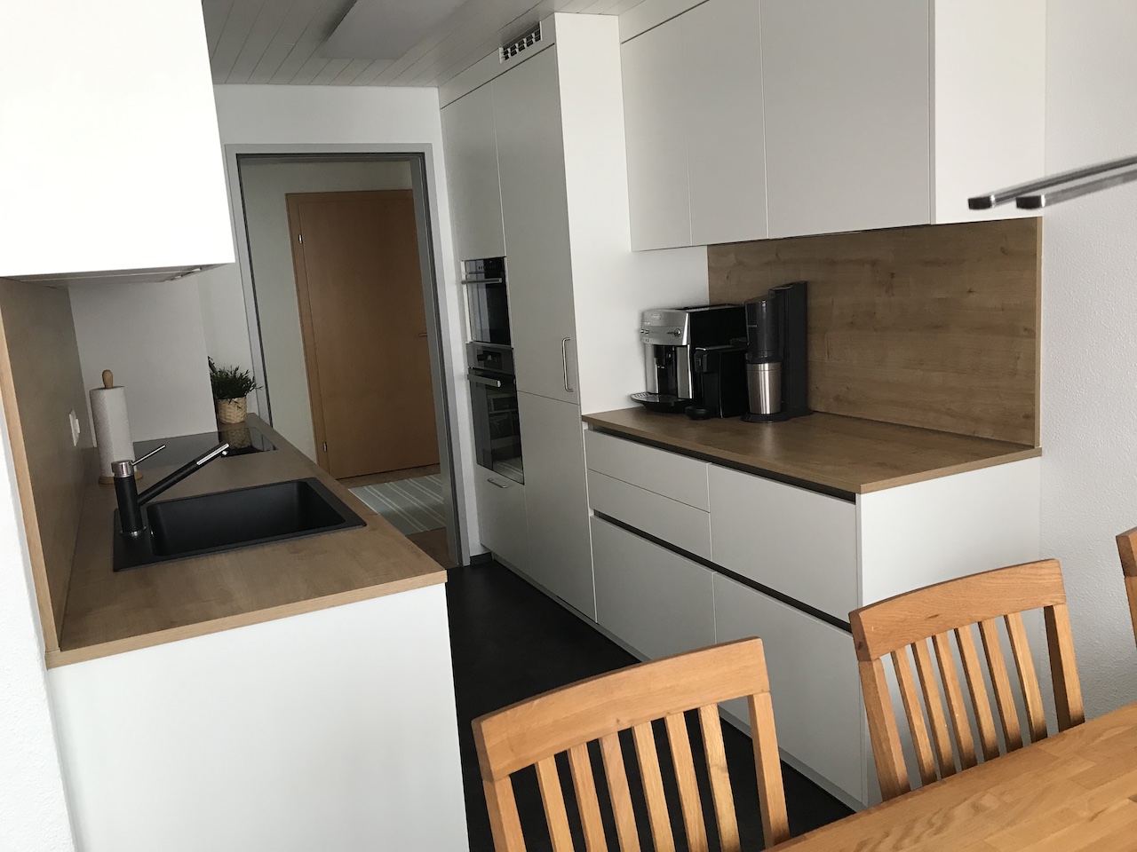 Infrarot Zusatz Heizung. Die Küche ist ausgestattet mit Kaffee und Teemaschine, Steamer und Wassersprudler.