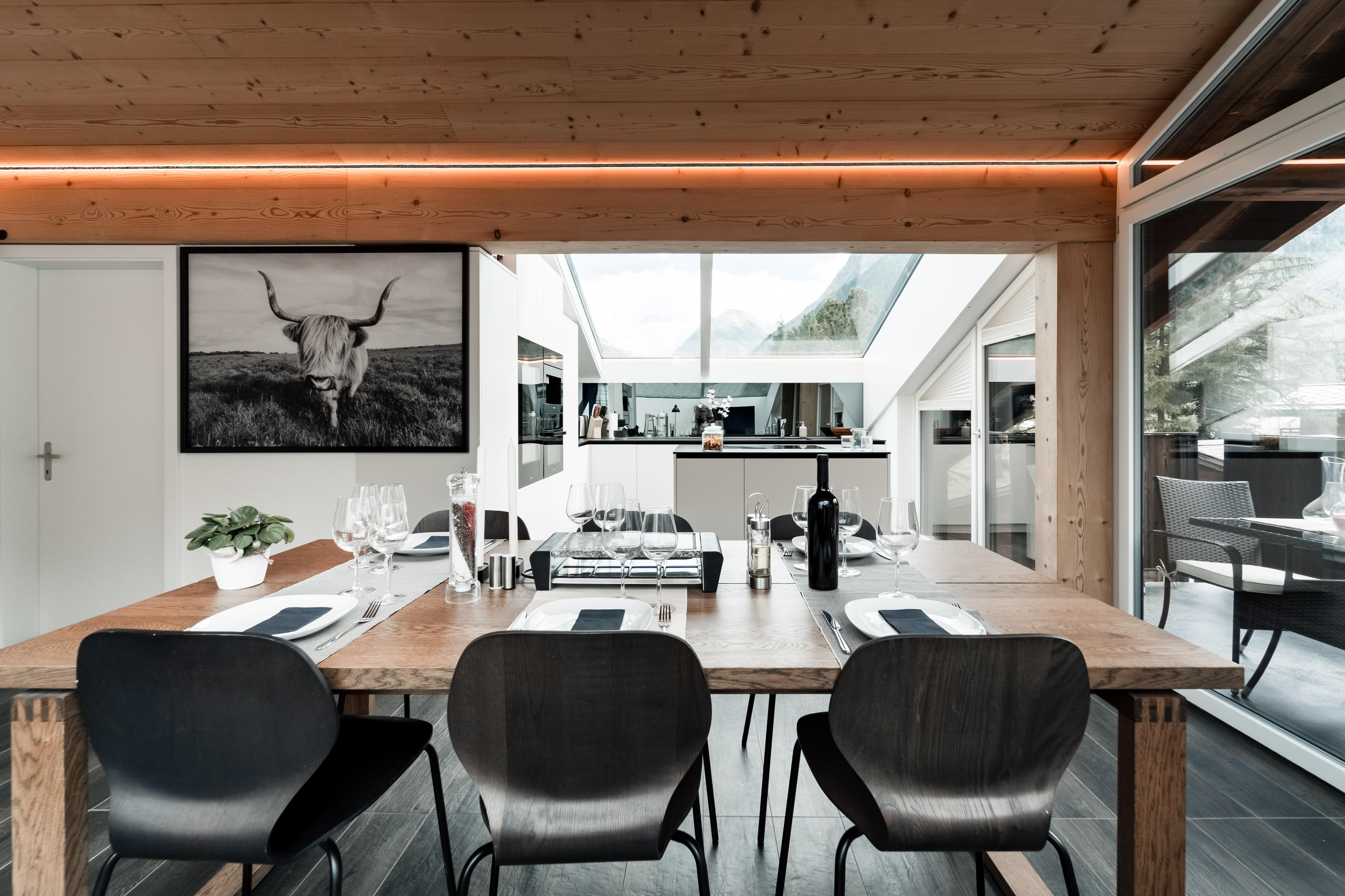 Freizeit- / Einkaufsmöglichkeiten Gut zu Fuss erreichbar. Zur allgemeinen Benützung Wellnessbereich mit Sauna und Whirlpool (zu den Bildern). Terrasse ausgestattet mit Grill, Lounge, Tisch und Liegestühlen, Drei Ladestationen für E-Bikes und Veloständer, Waschmaschine, Trockner und Reinigungsutensilien. Skischrank moderner Skischränke für Skis und Helme im Eingangsbereich (Erdgeschoss).