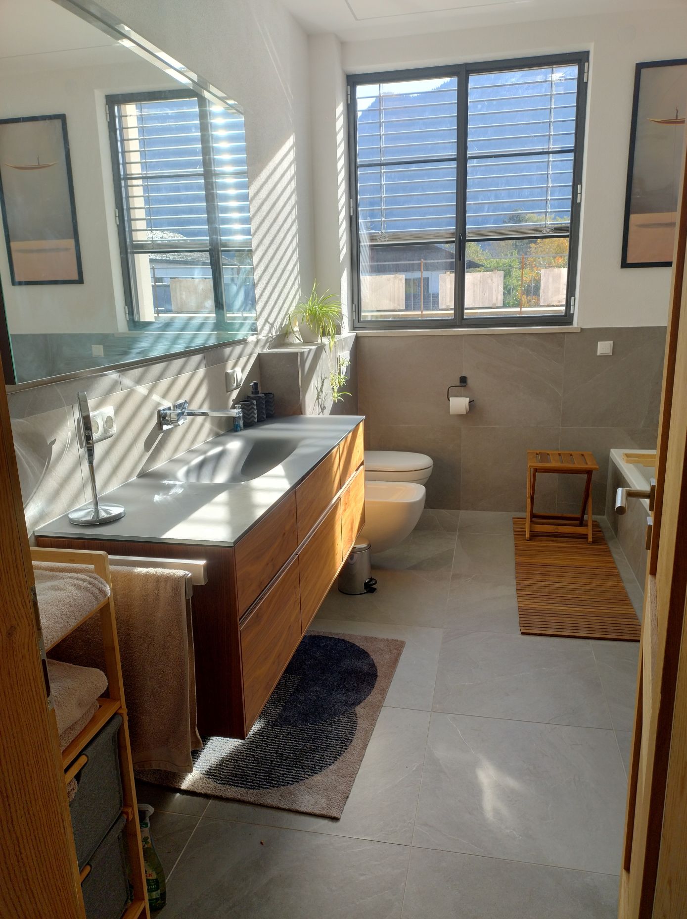 Die Wohnung, mit zwei Schlafzimmer, befindet sich im absoluten Neuzustand und wurde sehr hochwertig im Altindustrie-Stil gestaltet. Im Erdgeschoss befindet sich eine beheizte Doppelgarage mit Funksteuerung, sicher und trocken lassen sich dort nicht nur PKWs auch Bikes und Skiausrüstung lagern.