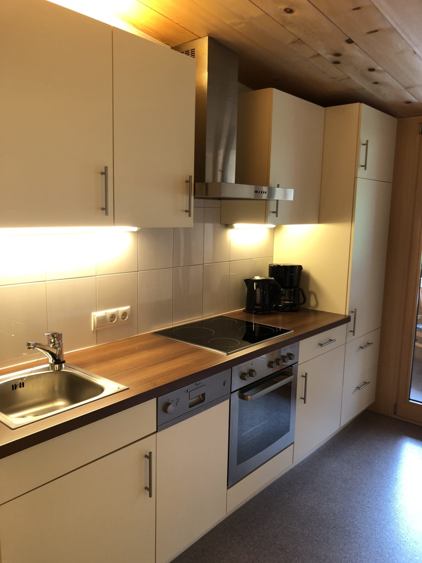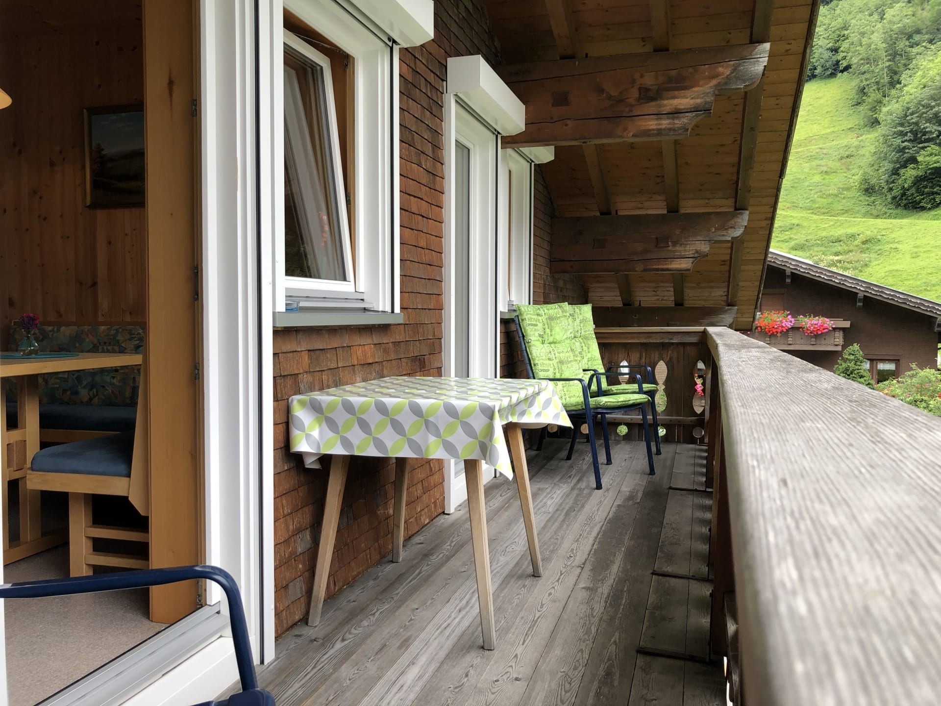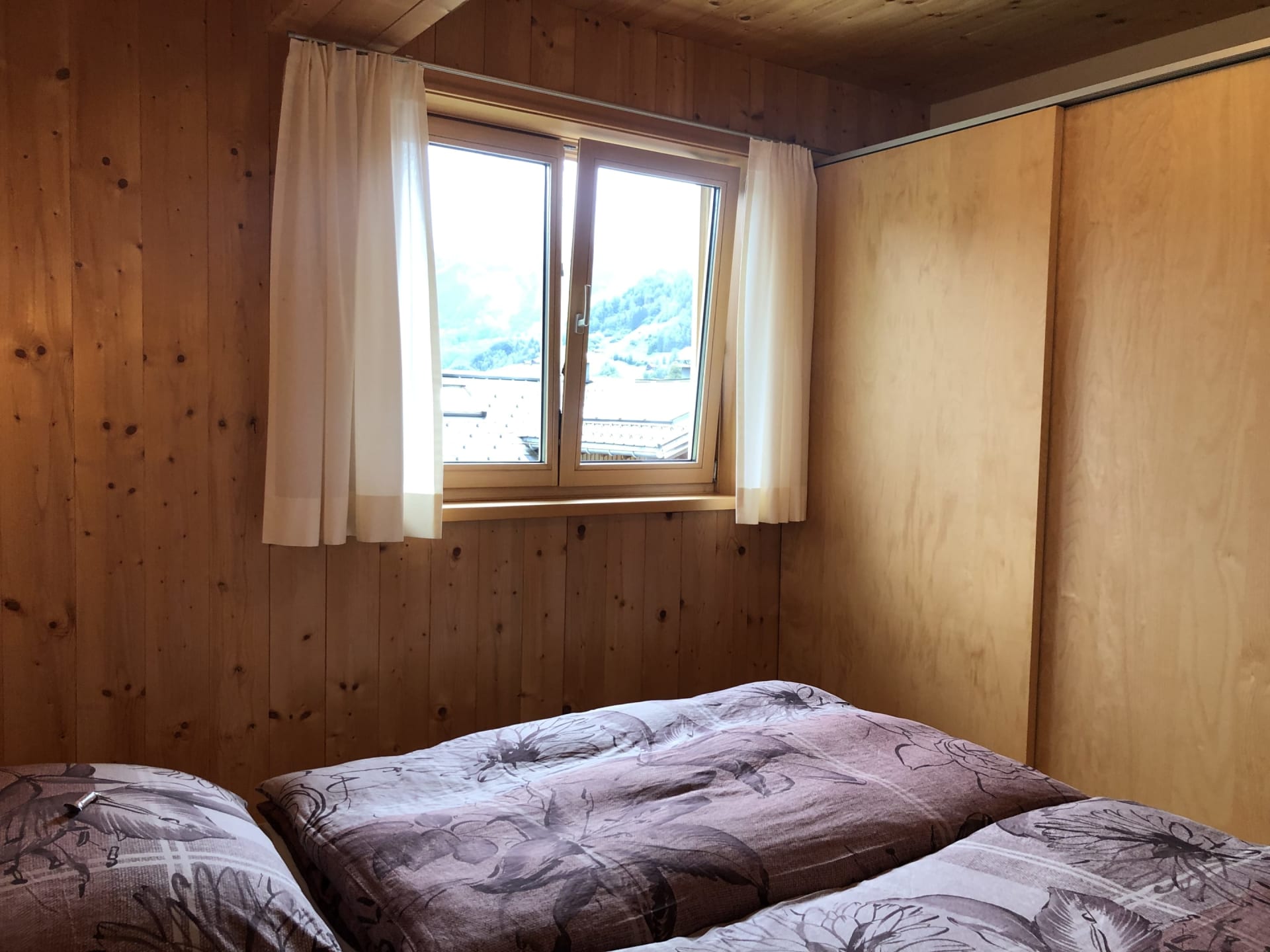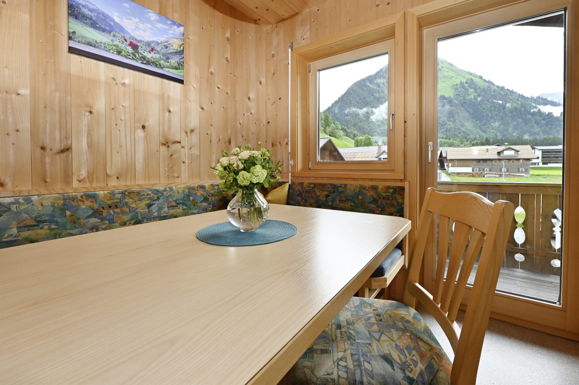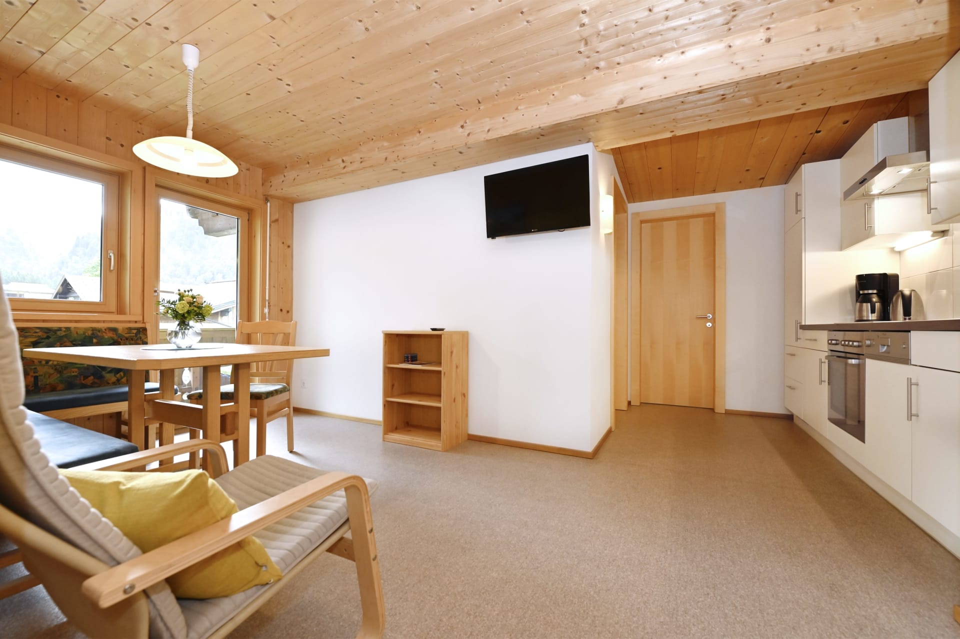 Gemütliche, mit Holz ausgebaute, 44m² große Ferienwohnung mit komplett ausgestatteter Küchenzeile, Balkon, zwei Doppelzimmern, Badezimmer mit Doppelwaschbecken sowie Dusche/WC, Kabel-TV und WLAN. Mit Blick auf die Üntschenspitze bereits beim Frühstück.