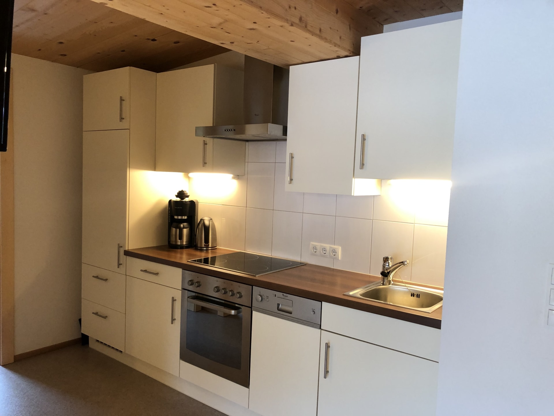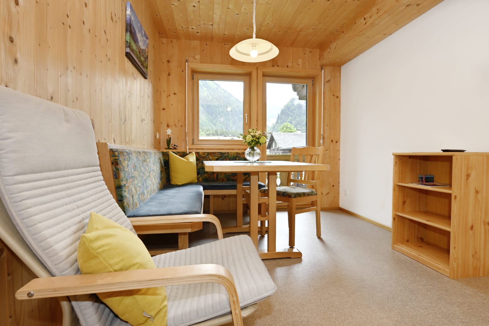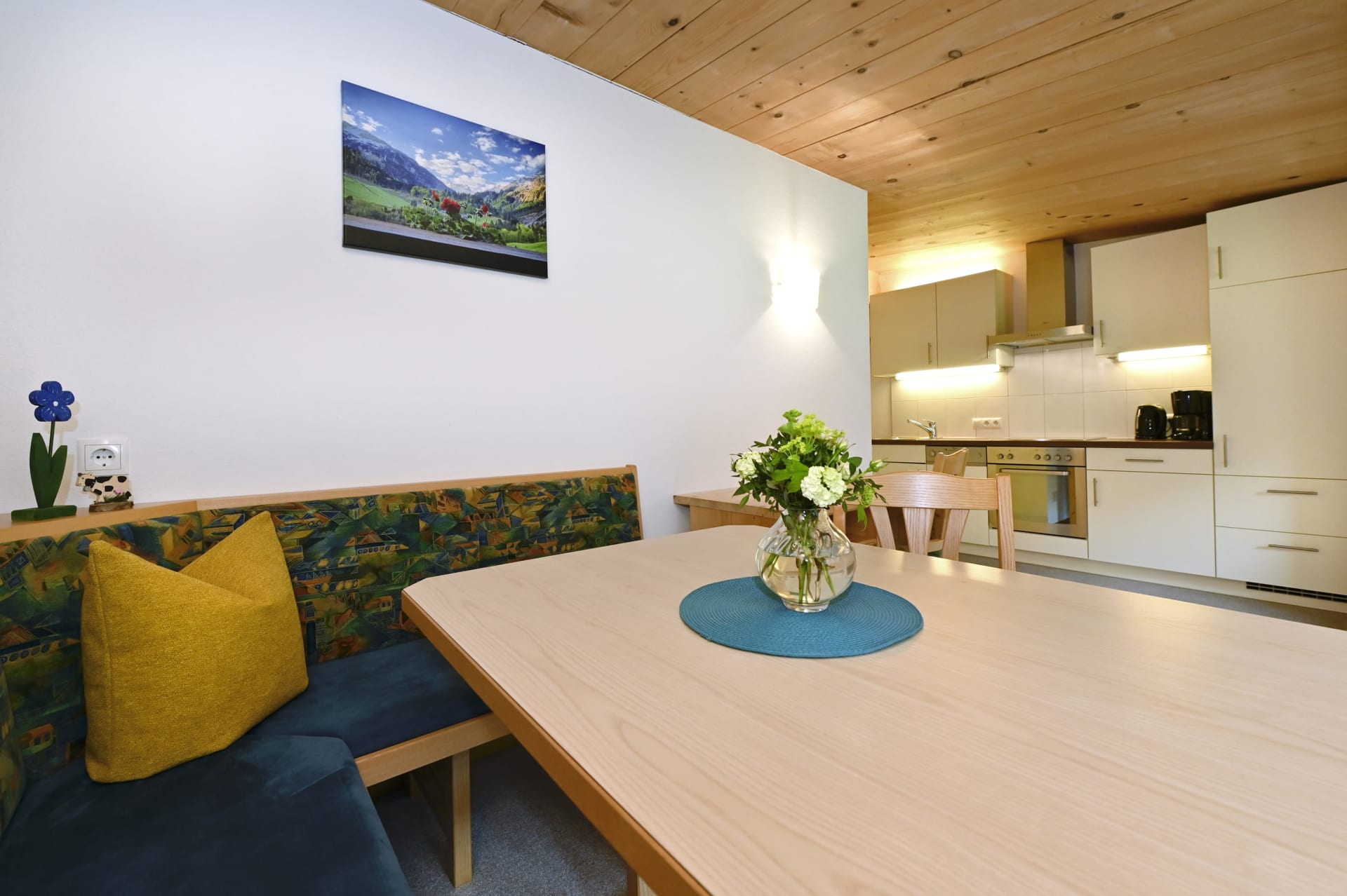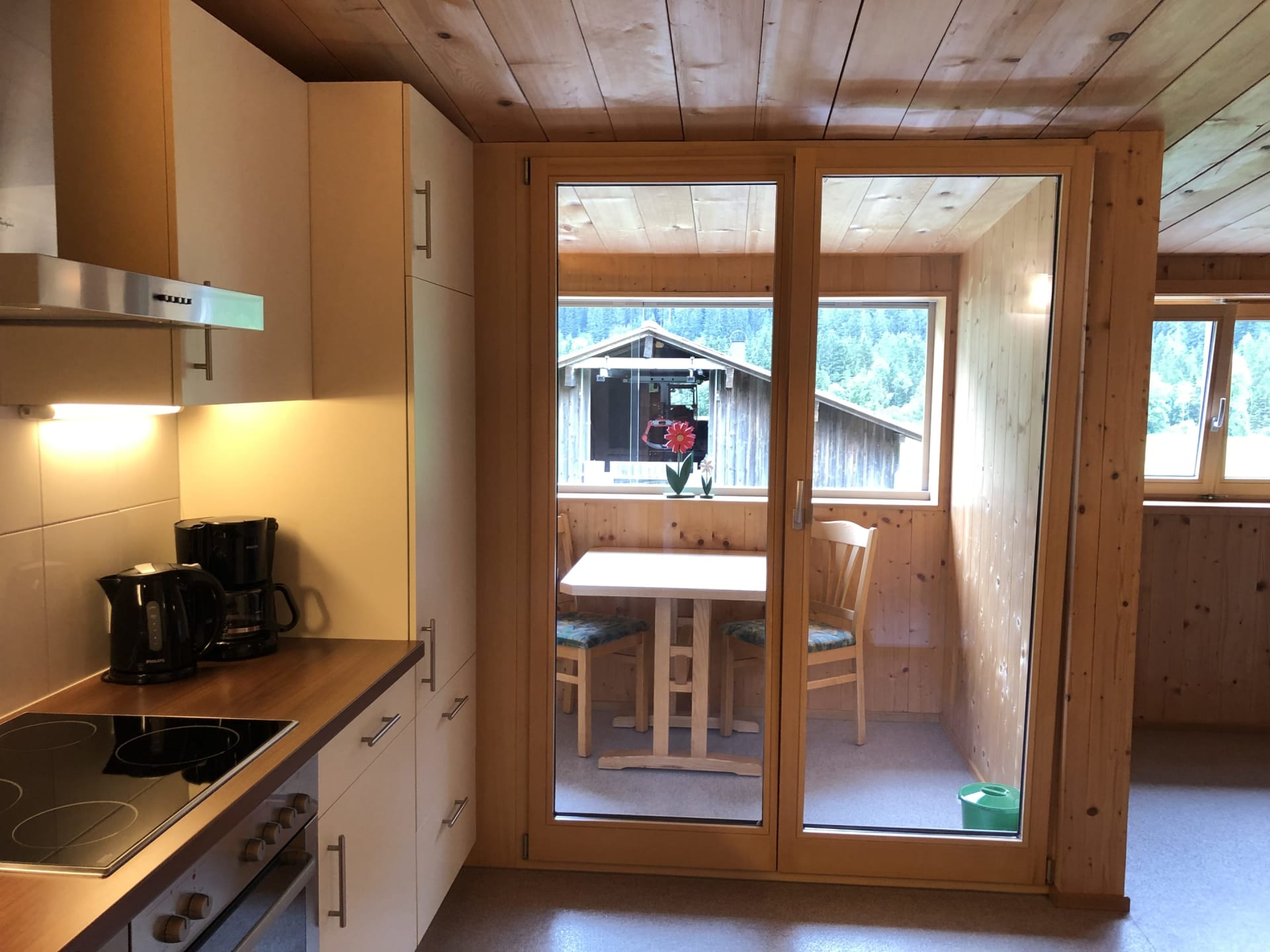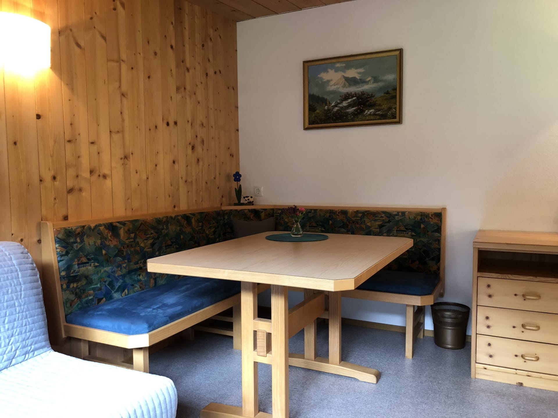Gemütliche, mit Holz ausgebaute, 44m² große Ferienwohnung mit komplett ausgestatteter Küchenzeile, Balkon, zwei Doppelzimmern, Badezimmer mit Doppelwaschbecken sowie Dusche/WC, Kabel-TV und WLAN. Mit Blick auf die Üntschenspitze bereits beim Frühstück.