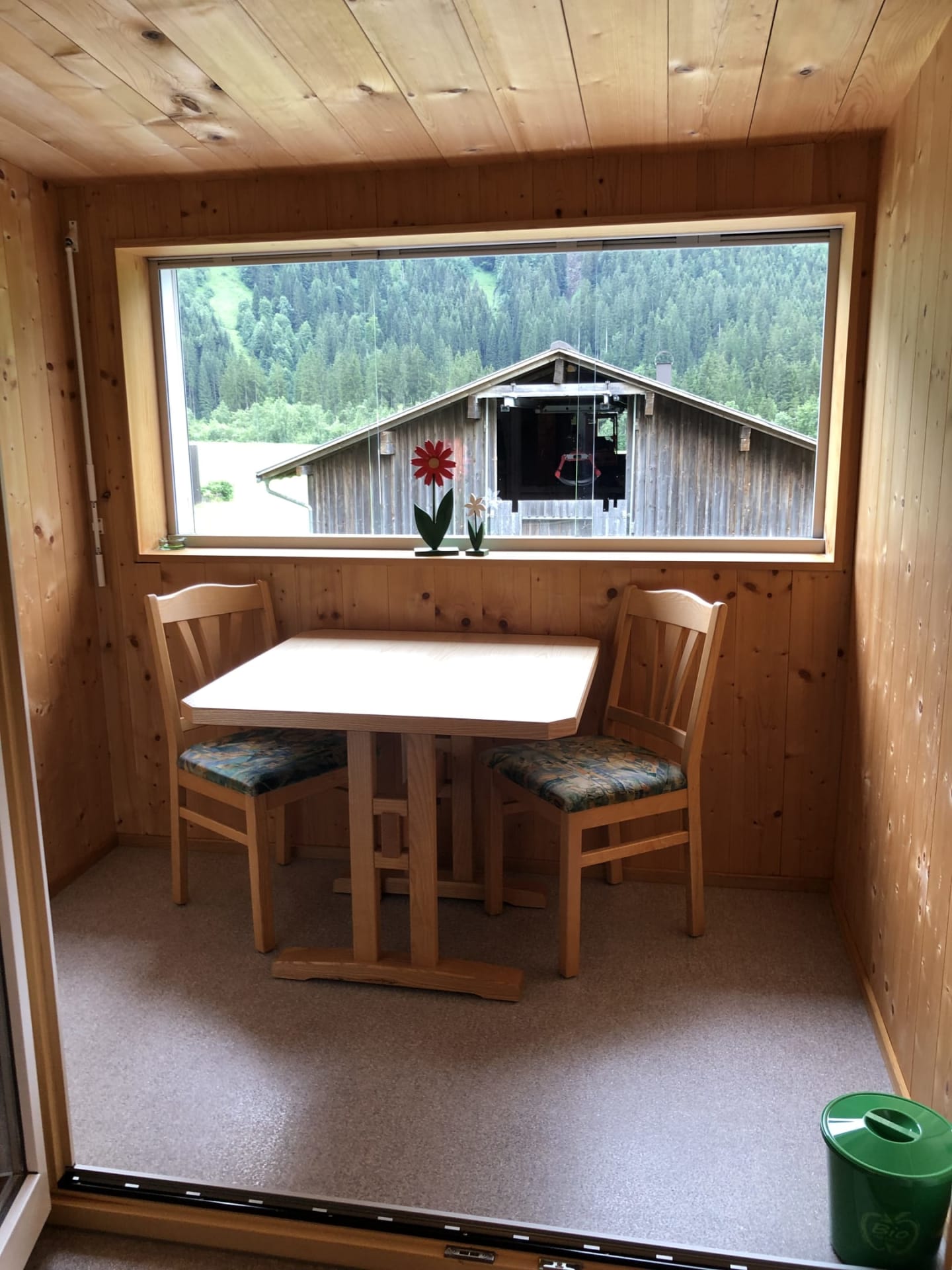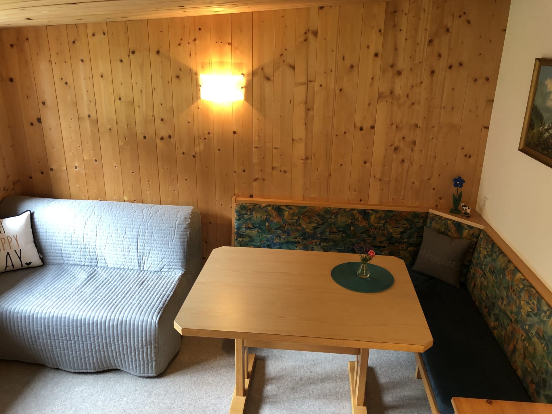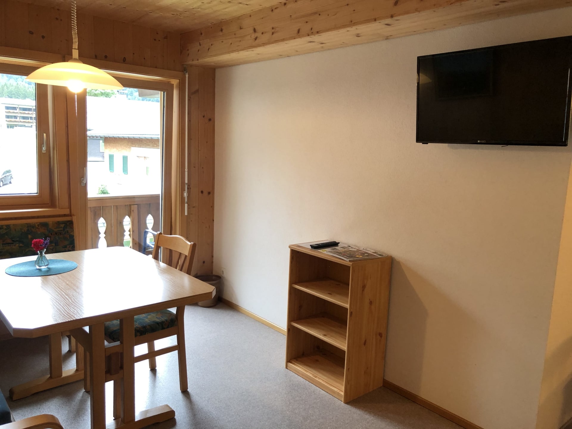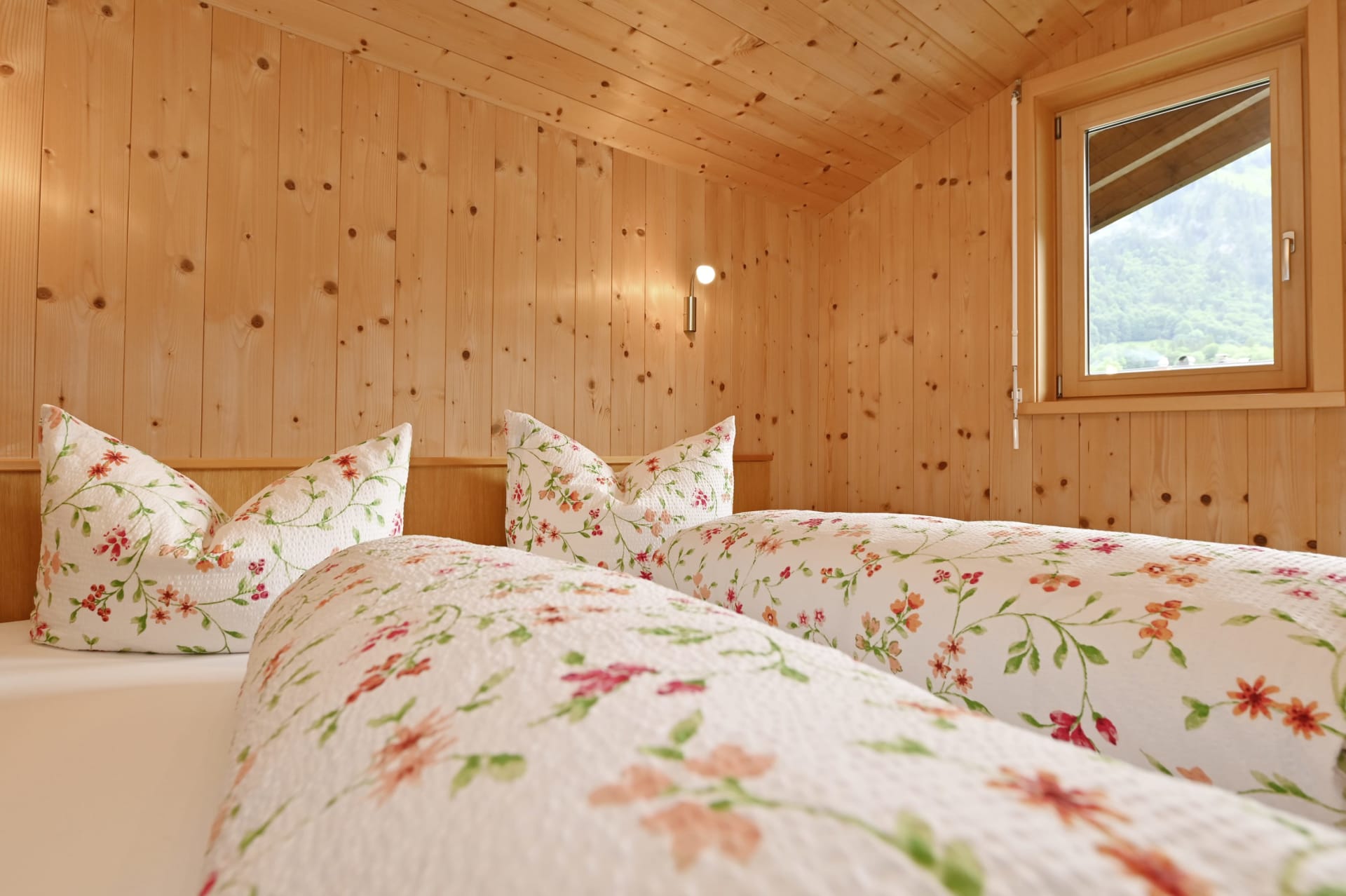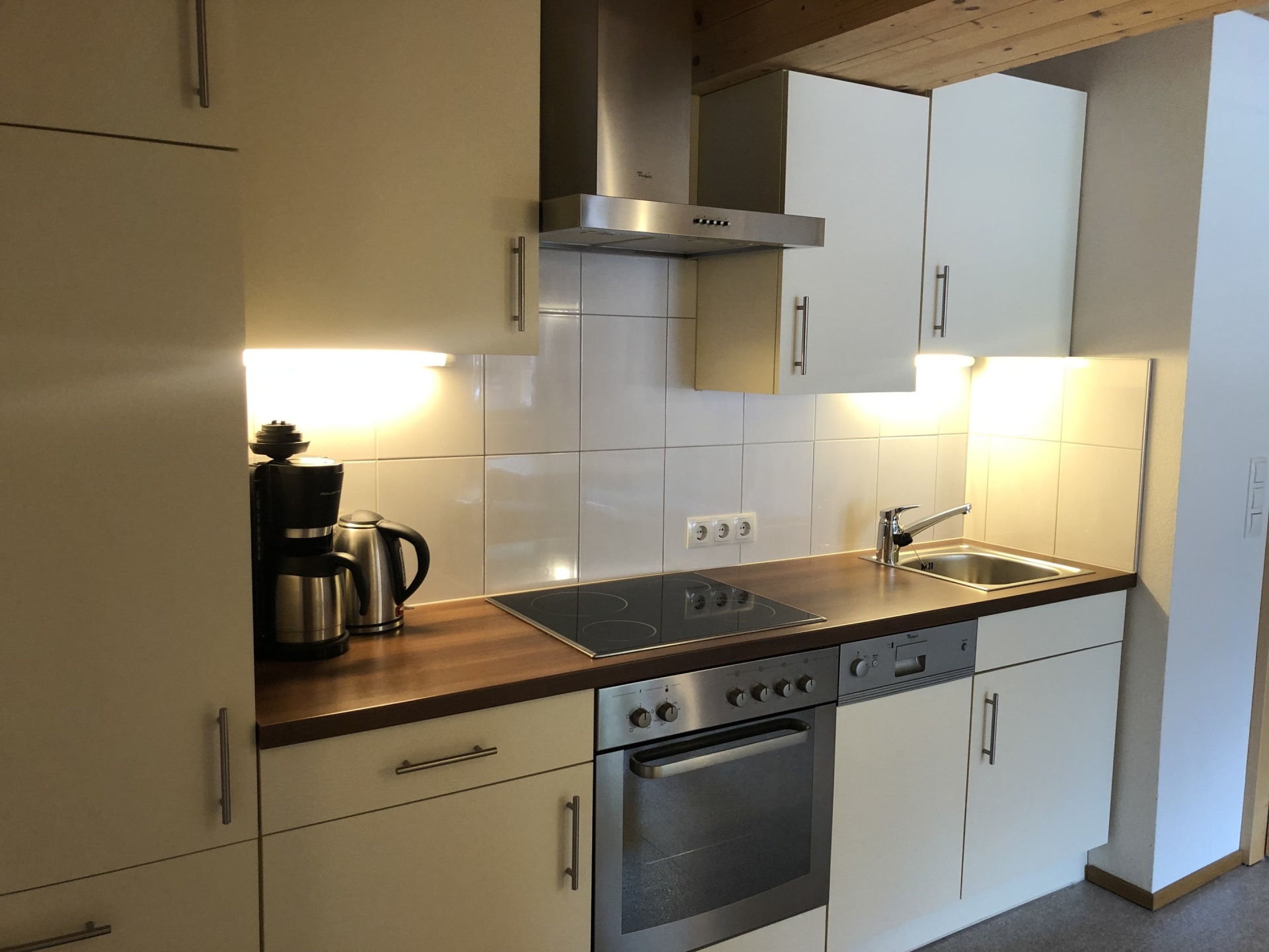 Gemütliche, mit Holz ausgebaute, 44m² große Ferienwohnung mit komplett ausgestatteter Küchenzeile, Balkon, zwei Doppelzimmern, Badezimmer mit Doppelwaschbecken sowie Dusche/WC, Kabel-TV und WLAN. Mit Blick auf die Üntschenspitze bereits beim Frühstück.