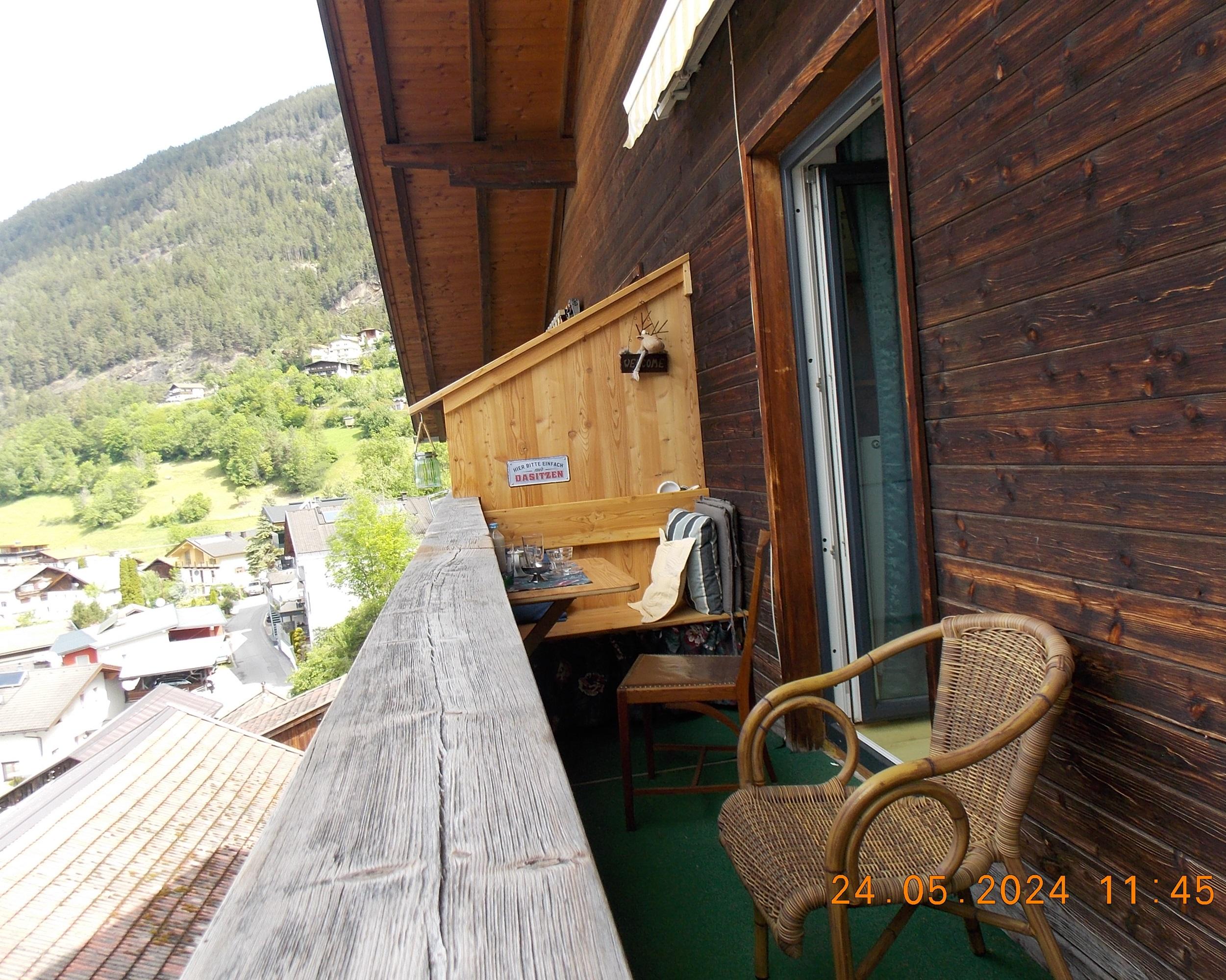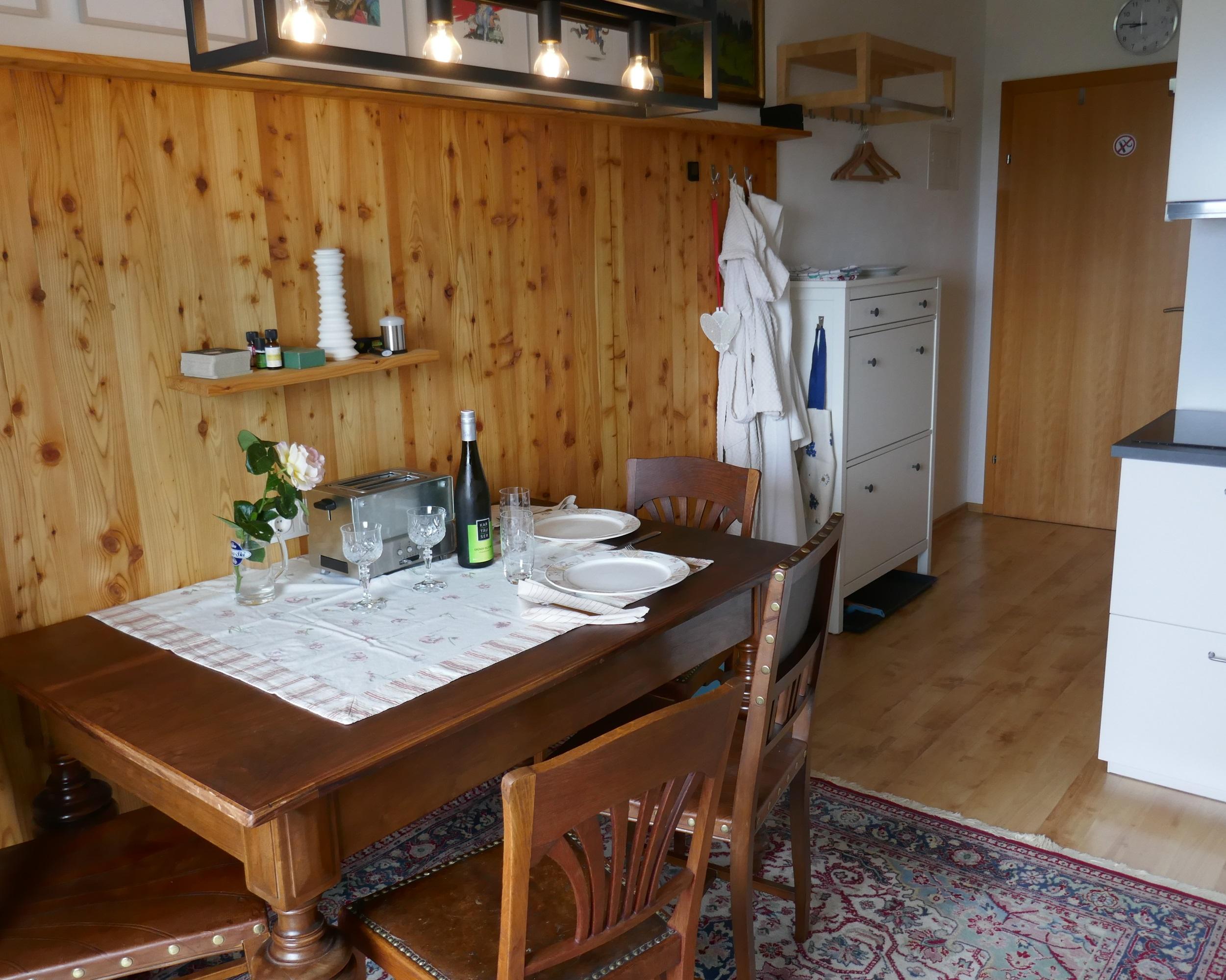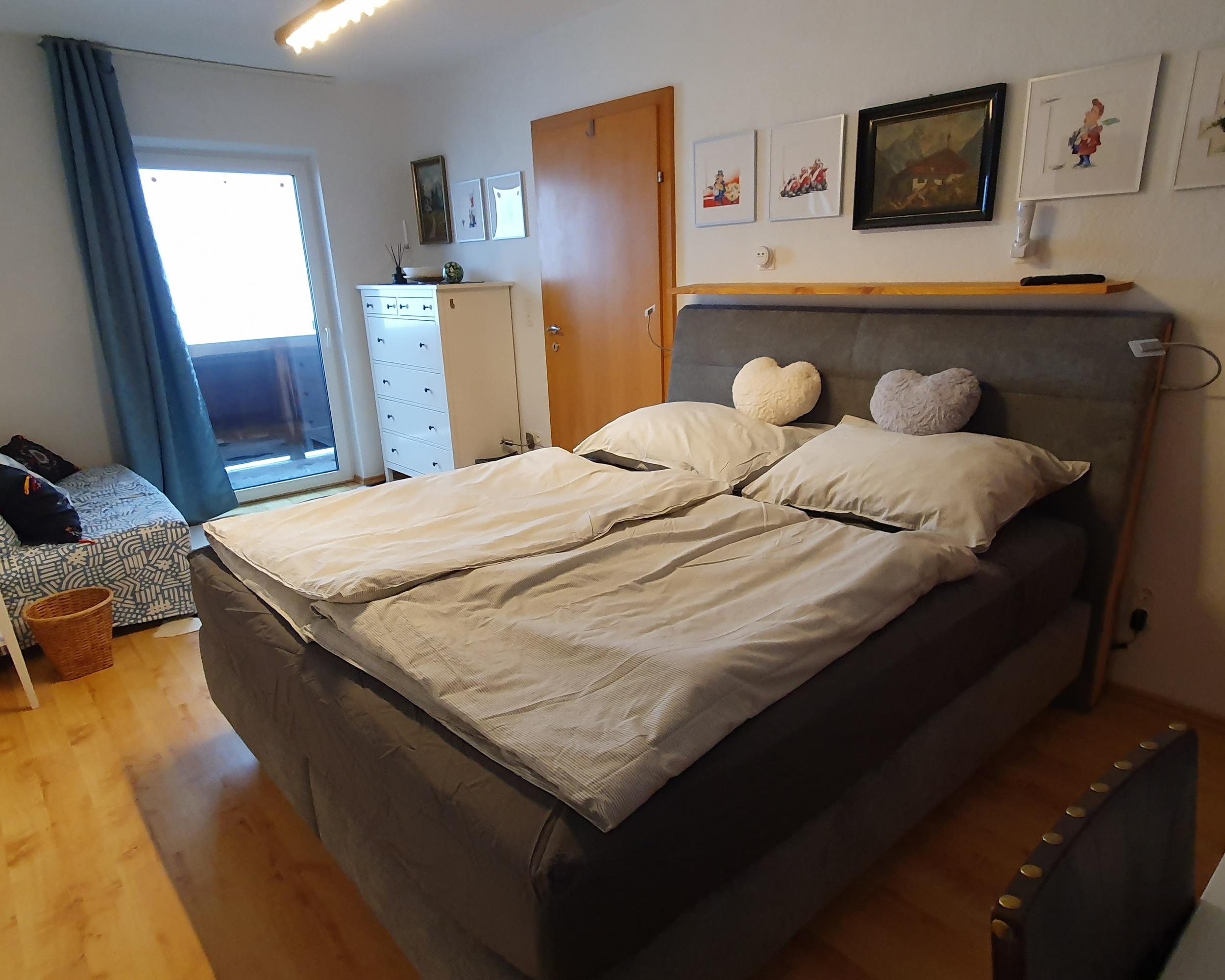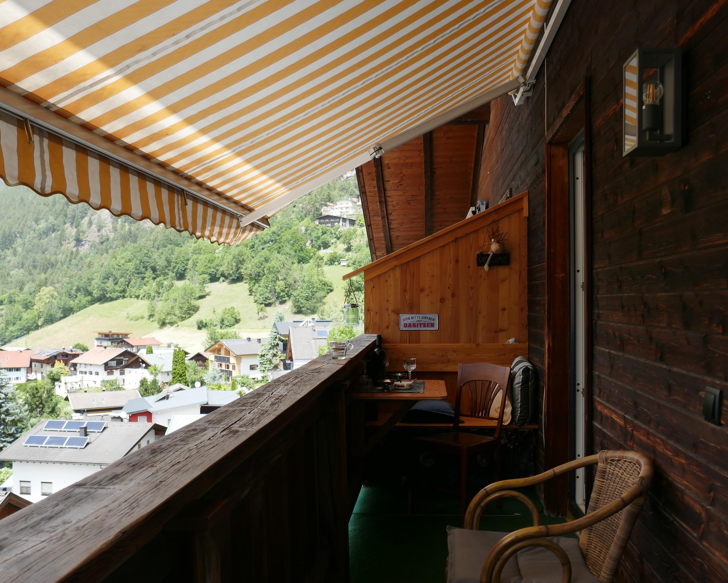 Das Apartement Top 5 mit ca. 32,5 m² besteht aus: 1 Schlafzimmer mit Boxspring-Doppelbett (180 x 200) und einer ausklappbaren Couch (IKEA Lycksele 140 x 188) als weitere Schlafmöglichkeit, Schreibtisch 155x60, Smart-TV, WLAN-Netz, viele Steckdosen und Lademöglichkeiten; Voll ausgestattete Wohnküche mit Essbereich für 3 Personen, Wasserkocher, KEIN Backofen, Staubsauger, Schuhkommode; 1 Badezimmer mit WC und Dusche. Westbalkon mit ca. 6 m², Sitzecke und motorischer Abschattung. Einige antike Möbelstücke, viele Ablagen. Schöne unverbaute Aussicht vom Balkon aus, siehe erster Teil des Panoramavideos. Matratze: 7-Zonen Tonnen-Taschenfederkern Naturelle TF1000PM Härte H3