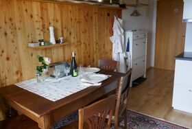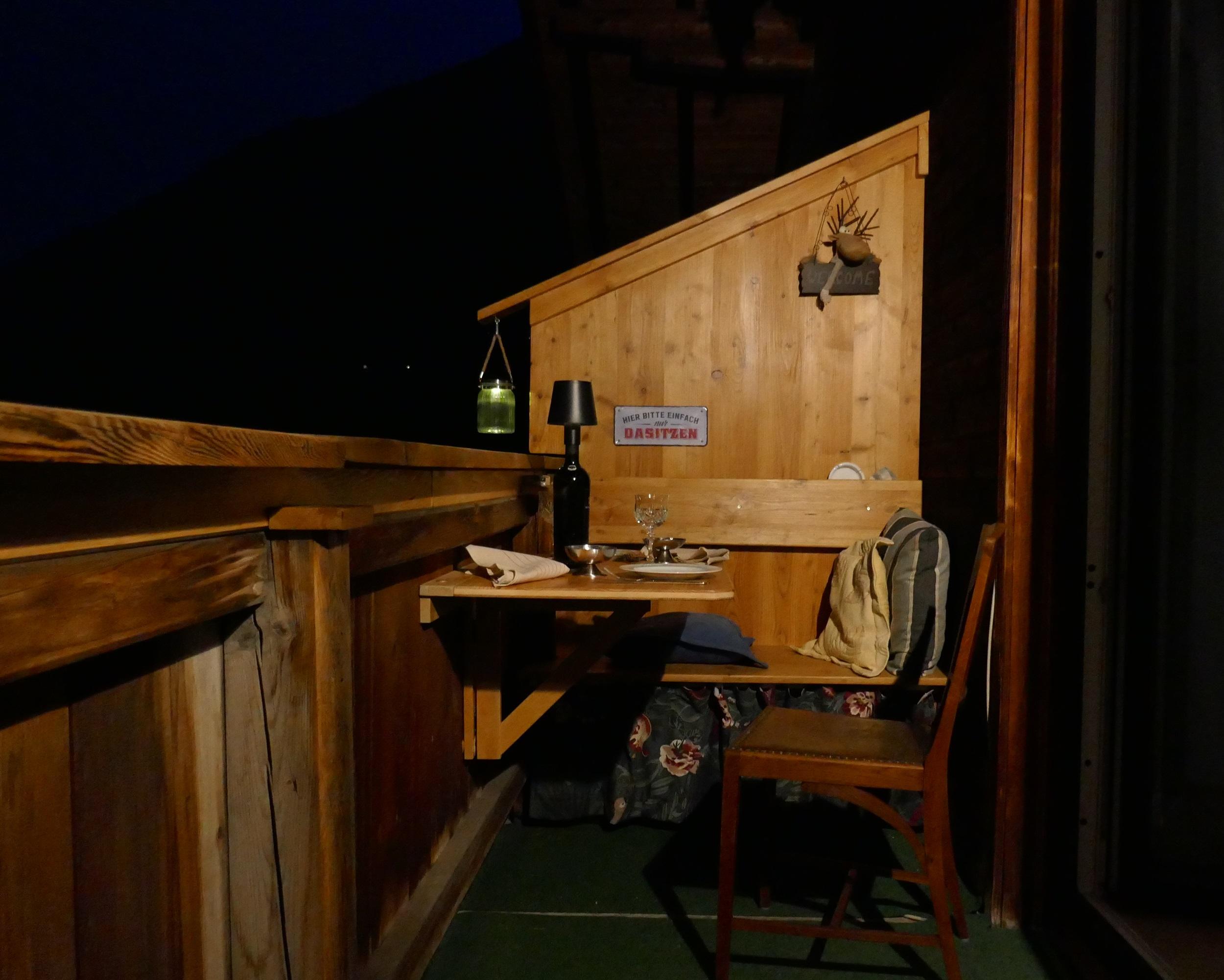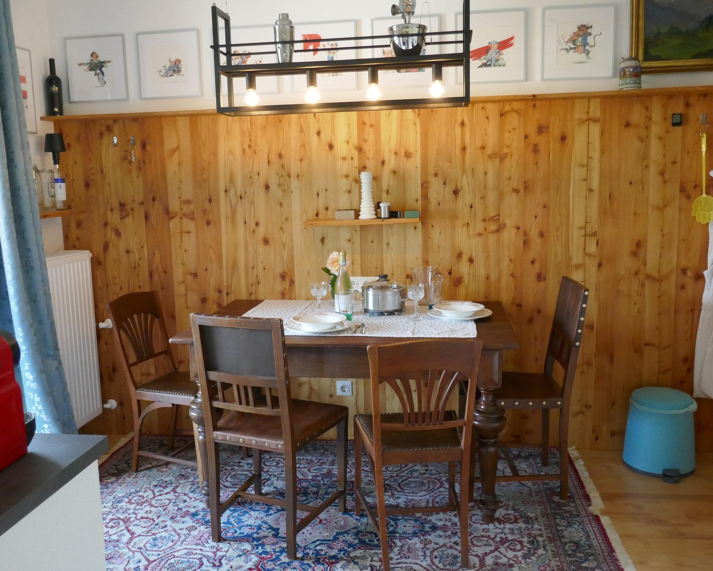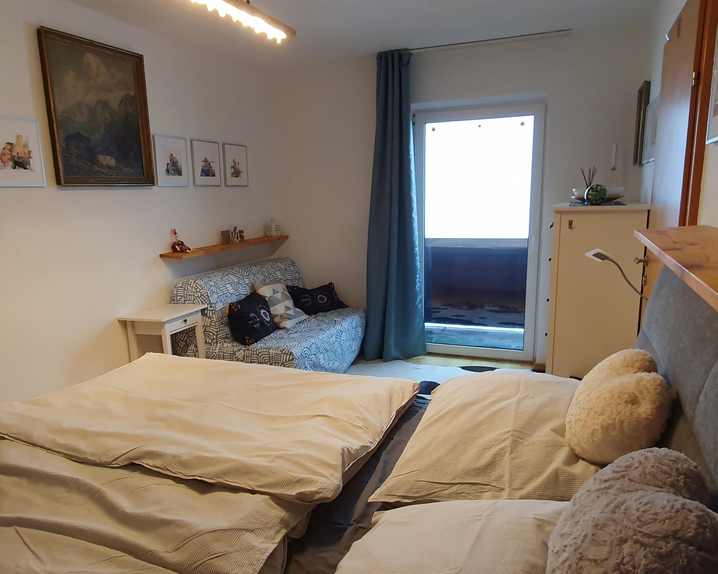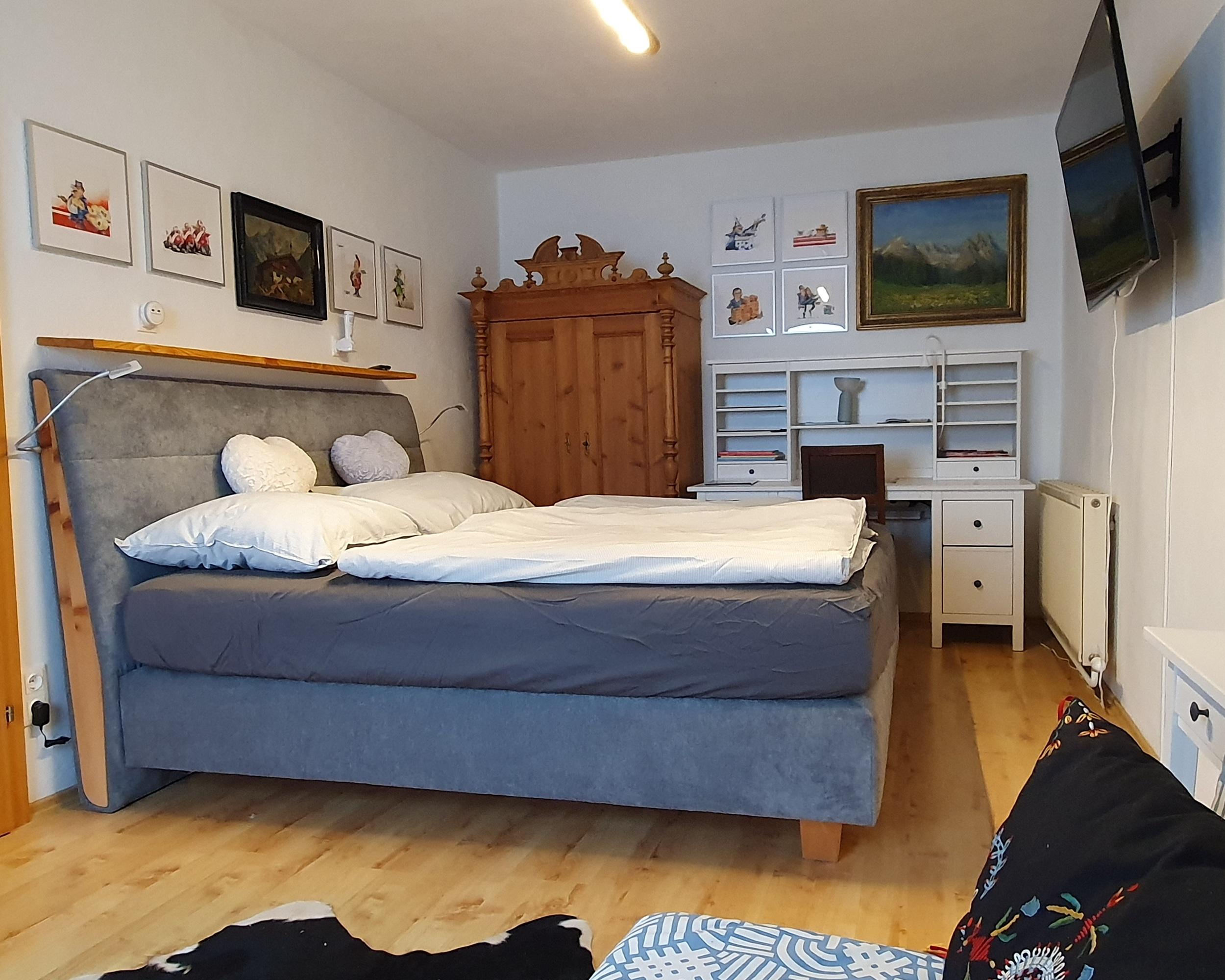 Das Apartement Top 5 mit ca. 32,5 m² besteht aus: 1 Schlafzimmer mit Boxspring-Doppelbett (180 x 200) und einer ausklappbaren Couch (IKEA Lycksele 140 x 188) als weitere Schlafmöglichkeit, Schreibtisch 155x60, Smart-TV, WLAN-Netz, viele Steckdosen und Lademöglichkeiten; Voll ausgestattete Wohnküche mit Essbereich für 3 Personen, Wasserkocher, KEIN Backofen, Staubsauger, Schuhkommode; 1 Badezimmer mit WC und Dusche. Westbalkon mit ca. 6 m², Sitzecke und motorischer Abschattung. Einige antike Möbelstücke, viele Ablagen. Schöne unverbaute Aussicht vom Balkon aus, siehe erster Teil des Panoramavideos. Matratze: 7-Zonen Tonnen-Taschenfederkern Naturelle TF1000PM Härte H3