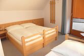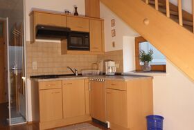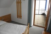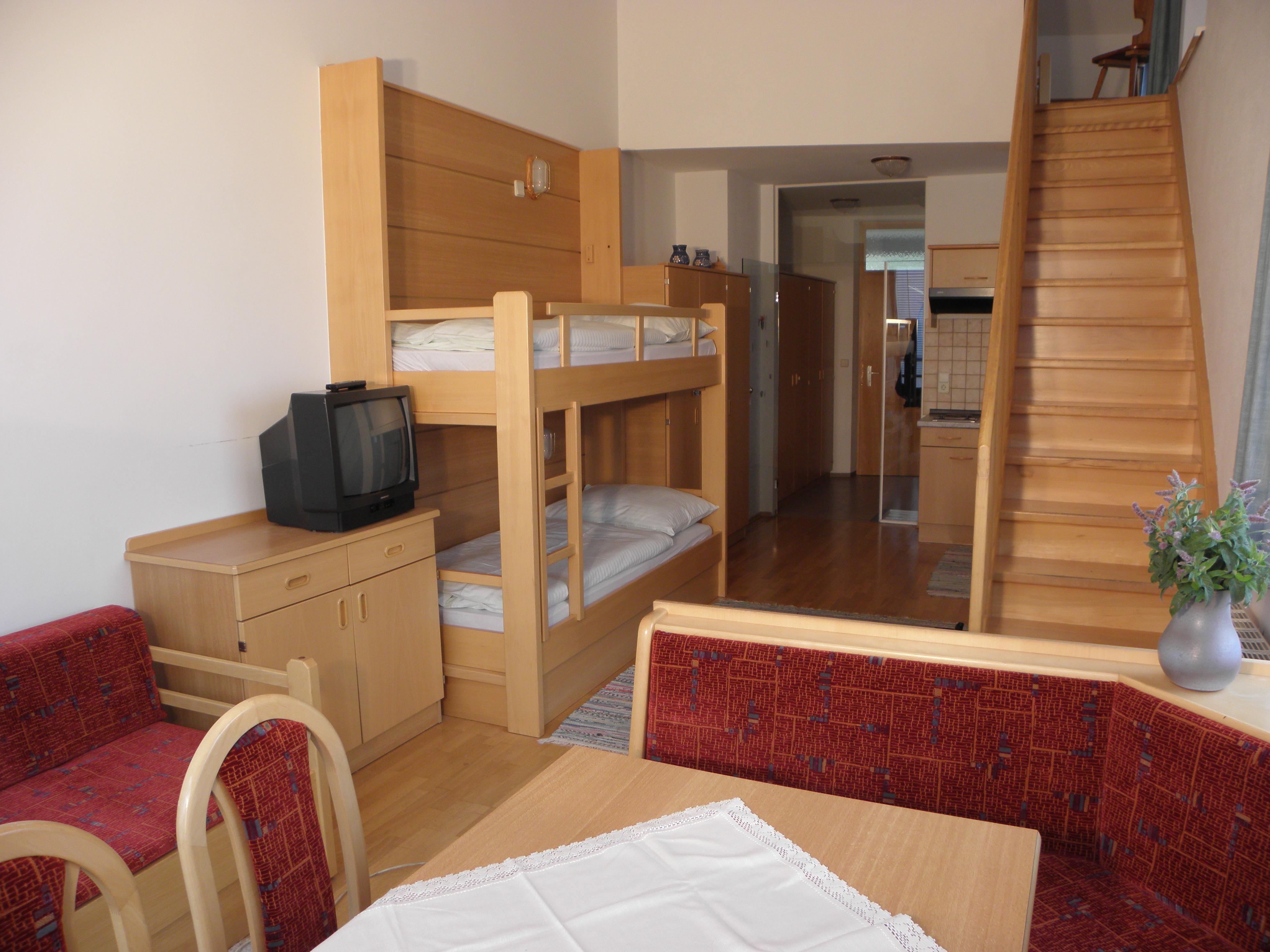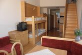 Das Appartement bietet ein Badezimmer mit DU und WC, Vorraum, eine große Wohnküche mit Stockbett und Schlafsofa sowie in der oberen Etage einen Schlafraum mit Doppelbett, Einzelbett und Balkon.