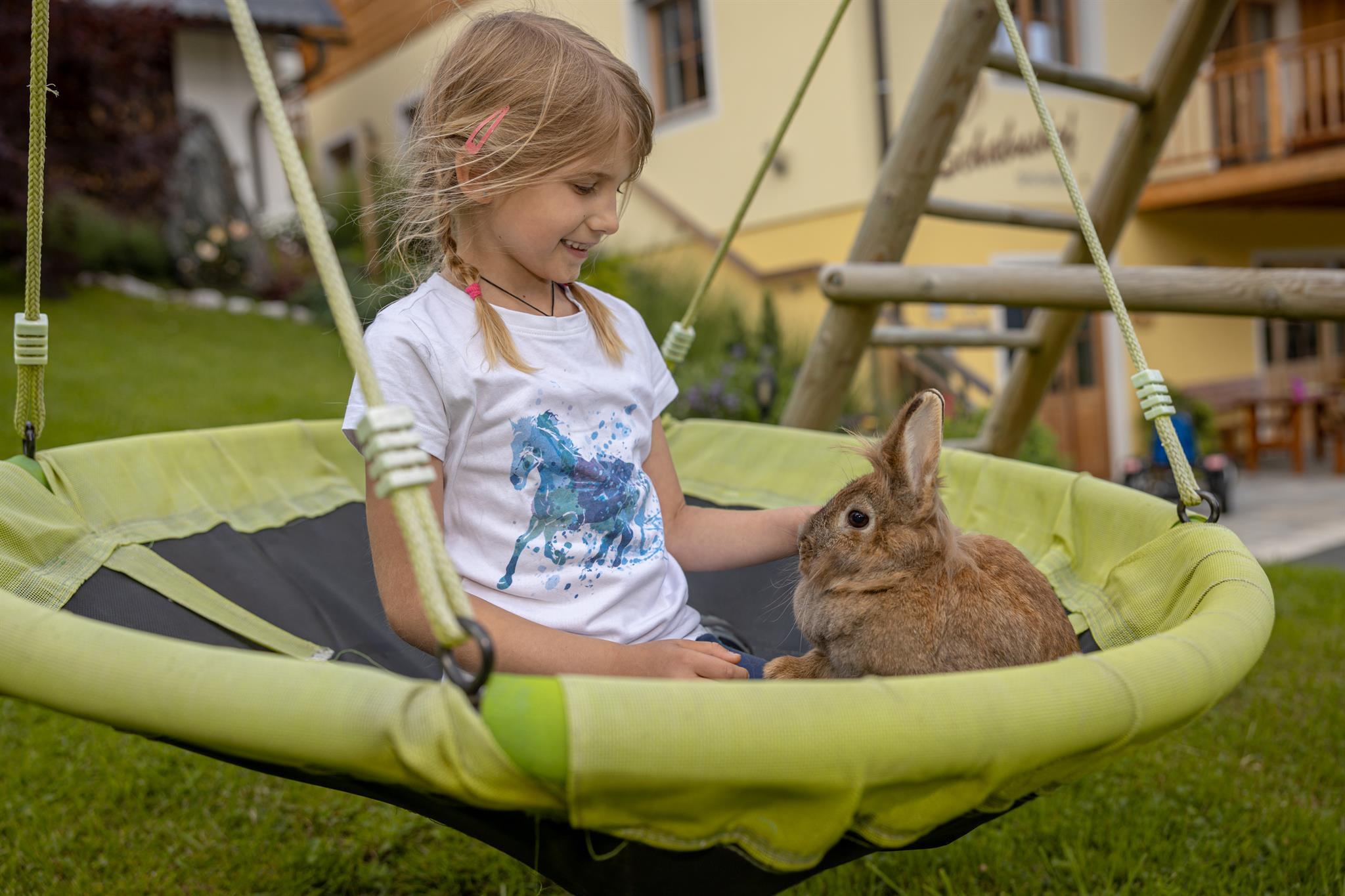 Unser Hof selbst bietet eine Vielzahl von tierischen Freunden – von Hasen über Katzen, Hühner, Rinder bis hin zu Pferden und Ziegen . Wenn Ihre Kinder beim Tiere füttern mithelfen oder auf dem Kinderspielplatz toben, können Sie sich auf der Liegewiese entspannen, während der Duft von Kräutern und frischen Blumen in der Luft liegt.