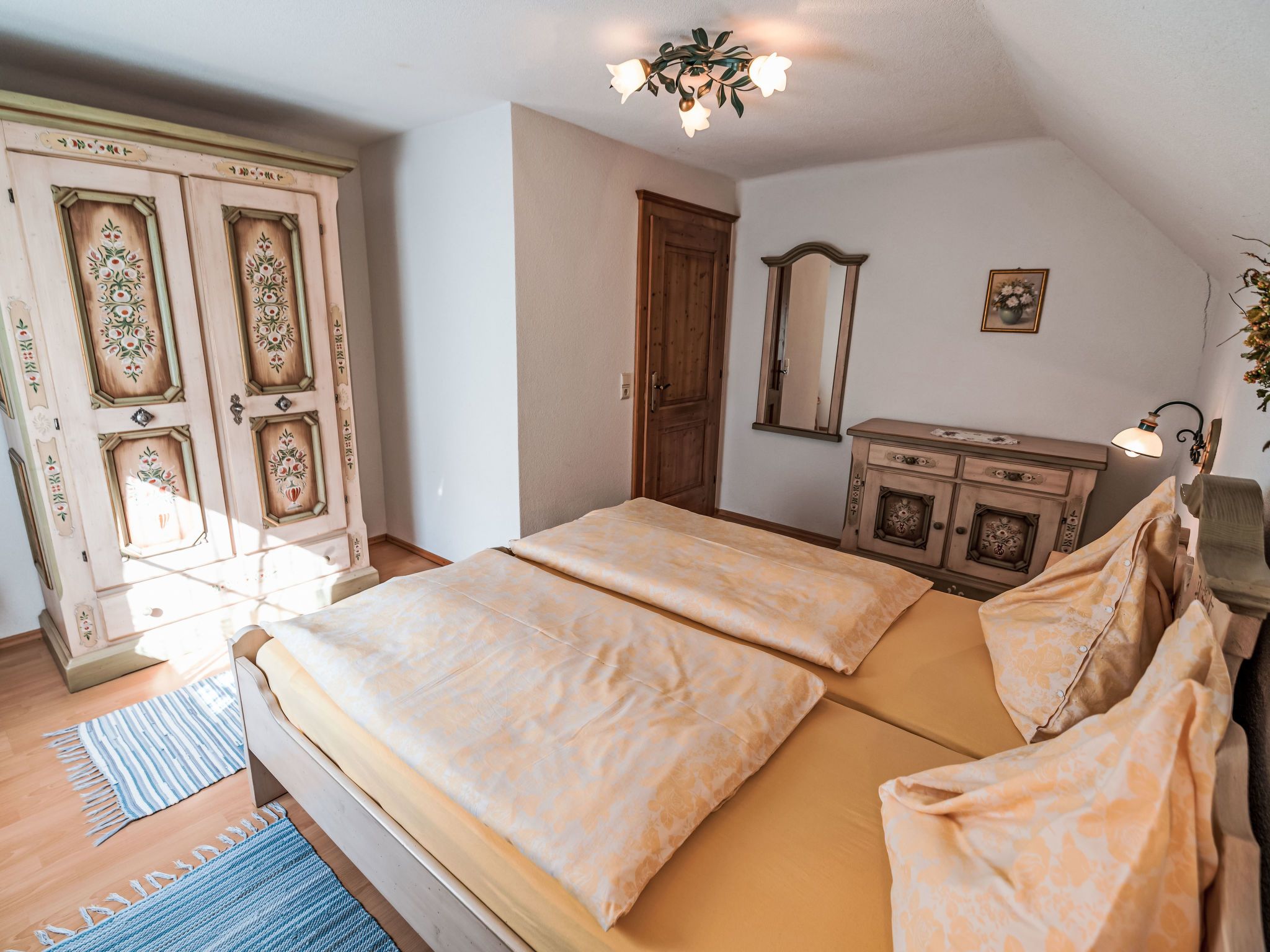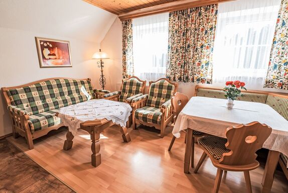Grimming, 3-Zimmer-Wohnung 76 m2 im 1. Stock. Teilweise abgeschrägt, gemütlich eingerichtet: Wohn-/Esszimmer mit Essecke, Sat-TV und Internationale TV-Sender. 2 Doppelzimmer. Offene Küche (Backofen, Geschirrspüler, 4 Glaskeramikplatten, Toaster, Wasserkocher, Mikrowelle, elektrische Kaffeemaschine). Dusche, sep. WC. Heizung. Parkettboden. Zur Verfügung: Internet (Wireless LAN, gratis). Bitte beachten: Nichtraucher-Unterkunft.