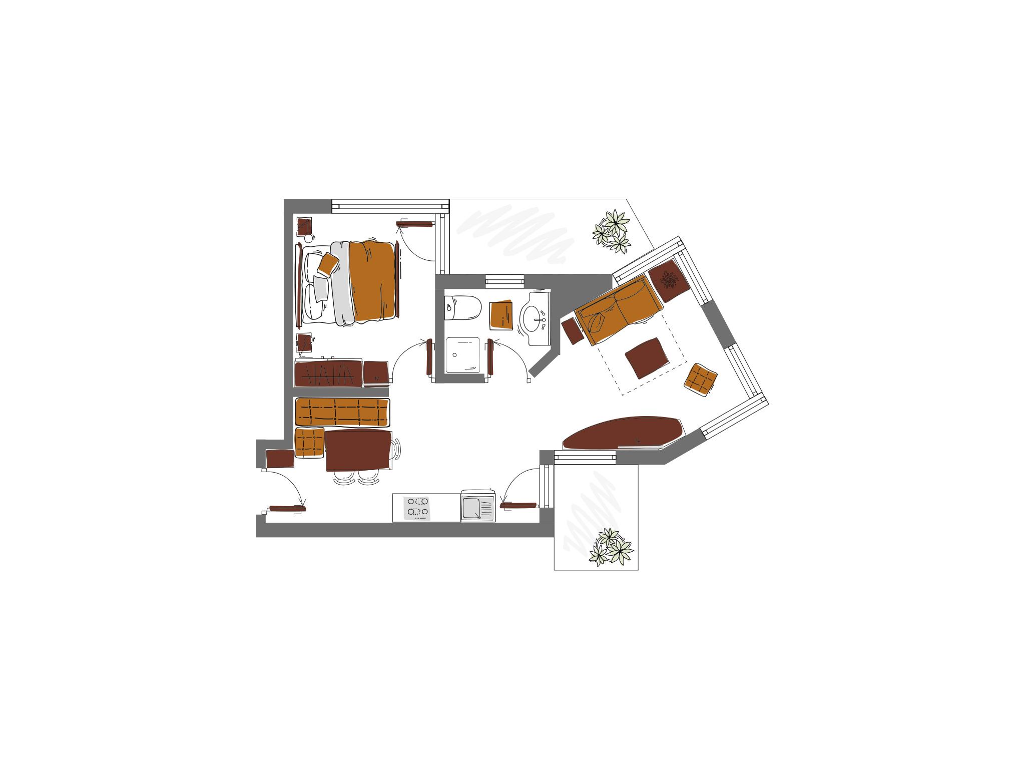 Appartment für 2-4 Personen mit 1 Doppelzimmer, Wohnraum mit Schlafsofa, kleiner Balkon, Flat-TV, Safe, Telefon, komplett ausgestattete Küche (4-Platten-Herd, Kühlschrank, Geschirrspüler, Kaffeemaschine, Wasserkocher, Sodastream, Toaster, Mikrowelle, Geschirr, Besteck, Kochgeschirr), Badezimmer mit Dusche/WC. Größe ca. 48 m²