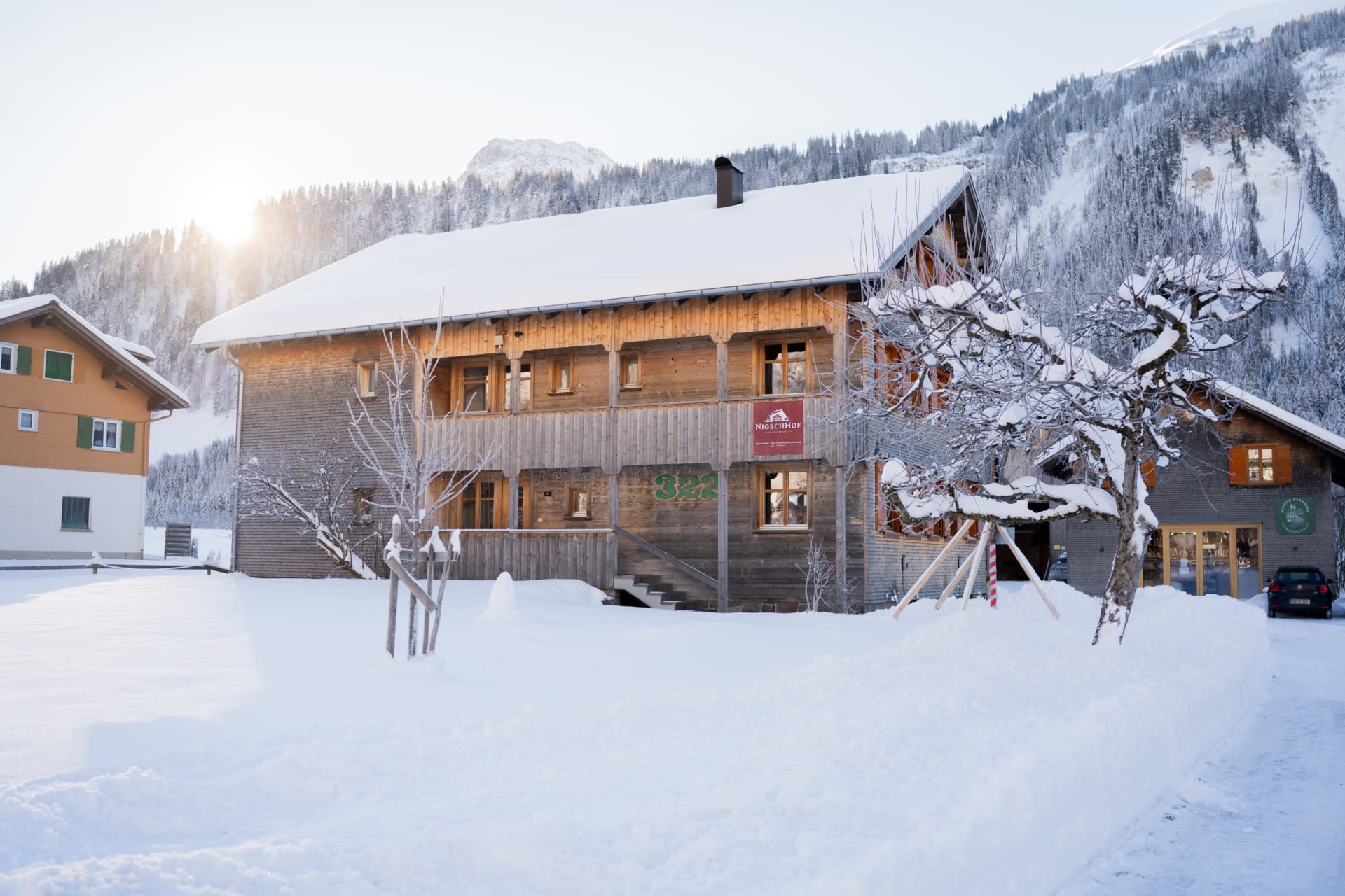 Wintersport? Unsere Lage: 600 Meter von der Talstation und der Skischule des Skigebiets Diedamskopf entfernt, laden wir Sie zum Skifahren ein. 150 Meter von der Skibushaltestelle entfernt. Das größte Skigebiet Österreichs (Warth-Lech-Zürs-St. Anton) ist mit dem Bus leicht zu erreichen. Auch zum größten Skigebiet des Bregenzerwaldes (Mellau-Damüls) sind es nur 10 Minuten mit dem Bus.