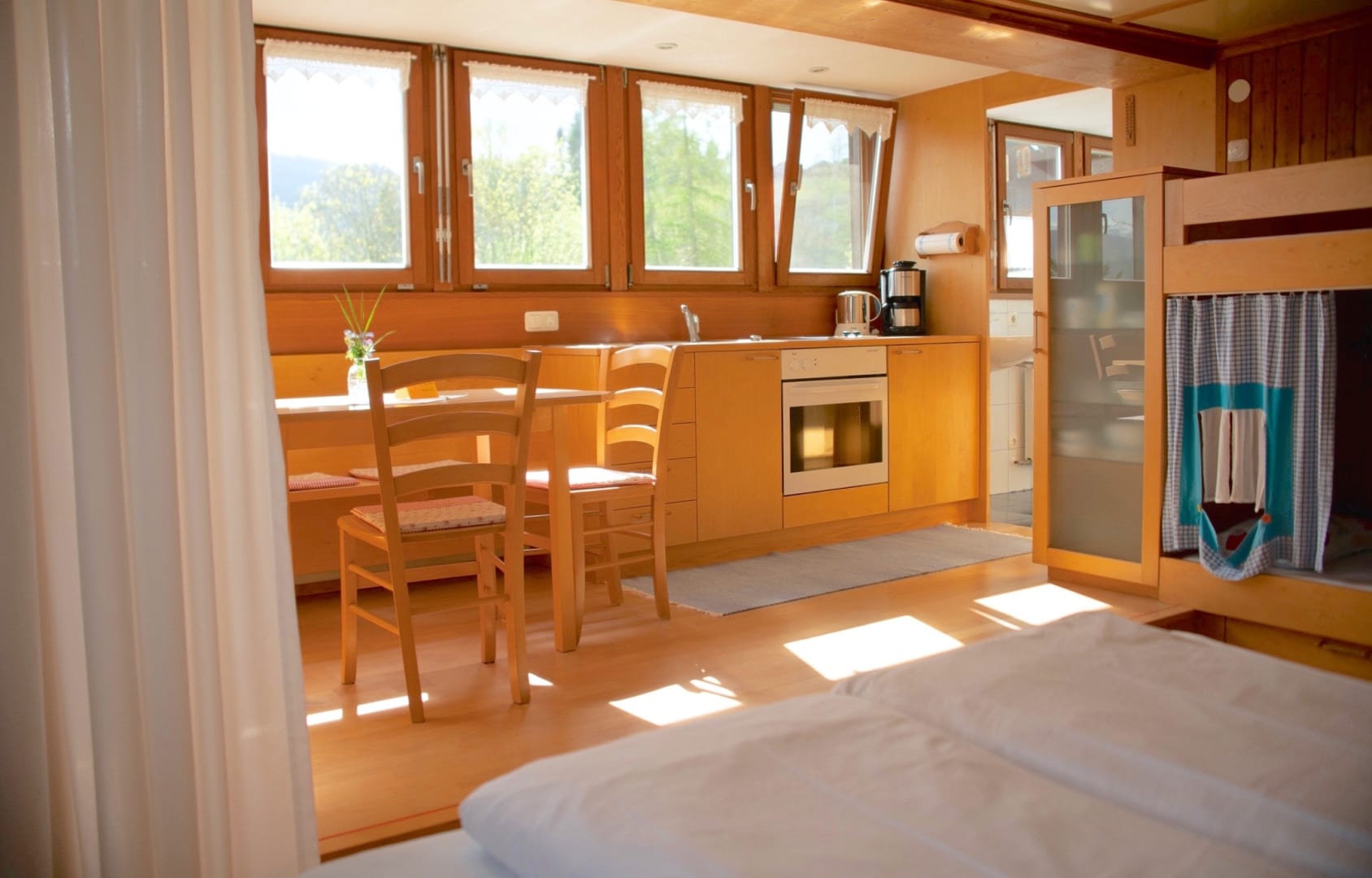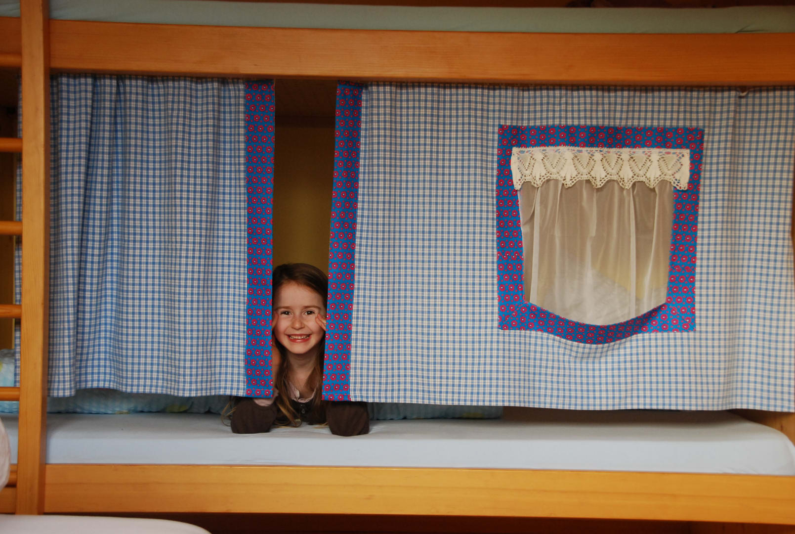 • Doppelbett und Kinderetagenbett mit Vorhang bis 6 Jahren