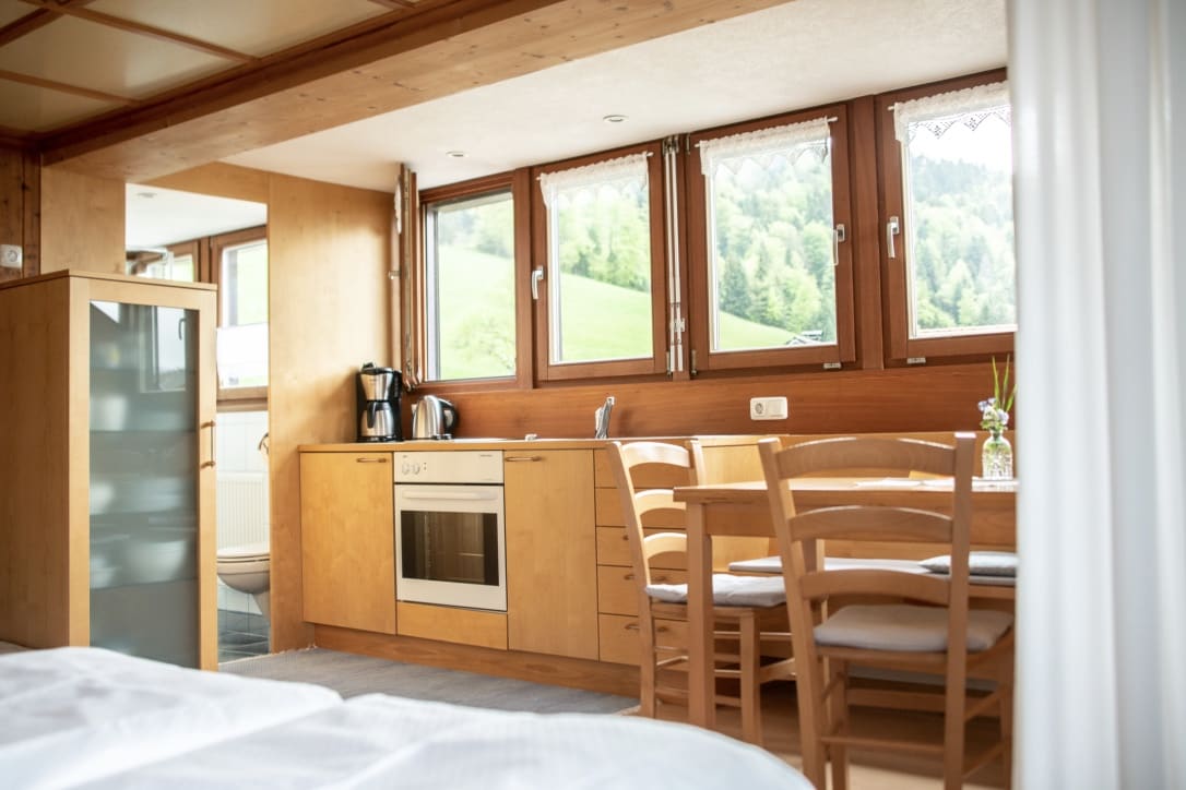 Die vier stilvoll renovierten Wohnungen & die Sauna mit wohltuenden Kräuterdüften in unserem ca. 300 Jahre alten Bregenzerwälder-Holzhaus bringen viel Licht und Wärme in Ihre Winterurlaubstage.
