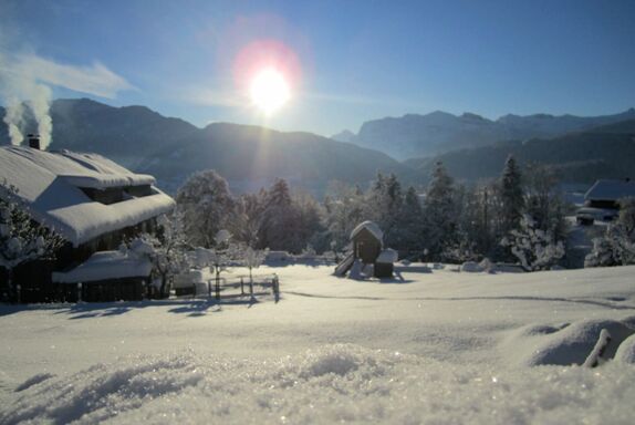 Die vier stilvoll renovierten Wohnungen & die Sauna mit wohltuenden Kräuterdüften in unserem ca. 300 Jahre alten Bregenzerwälder-Holzhaus bringen viel Licht und Wärme in Ihre Winterurlaubstage.