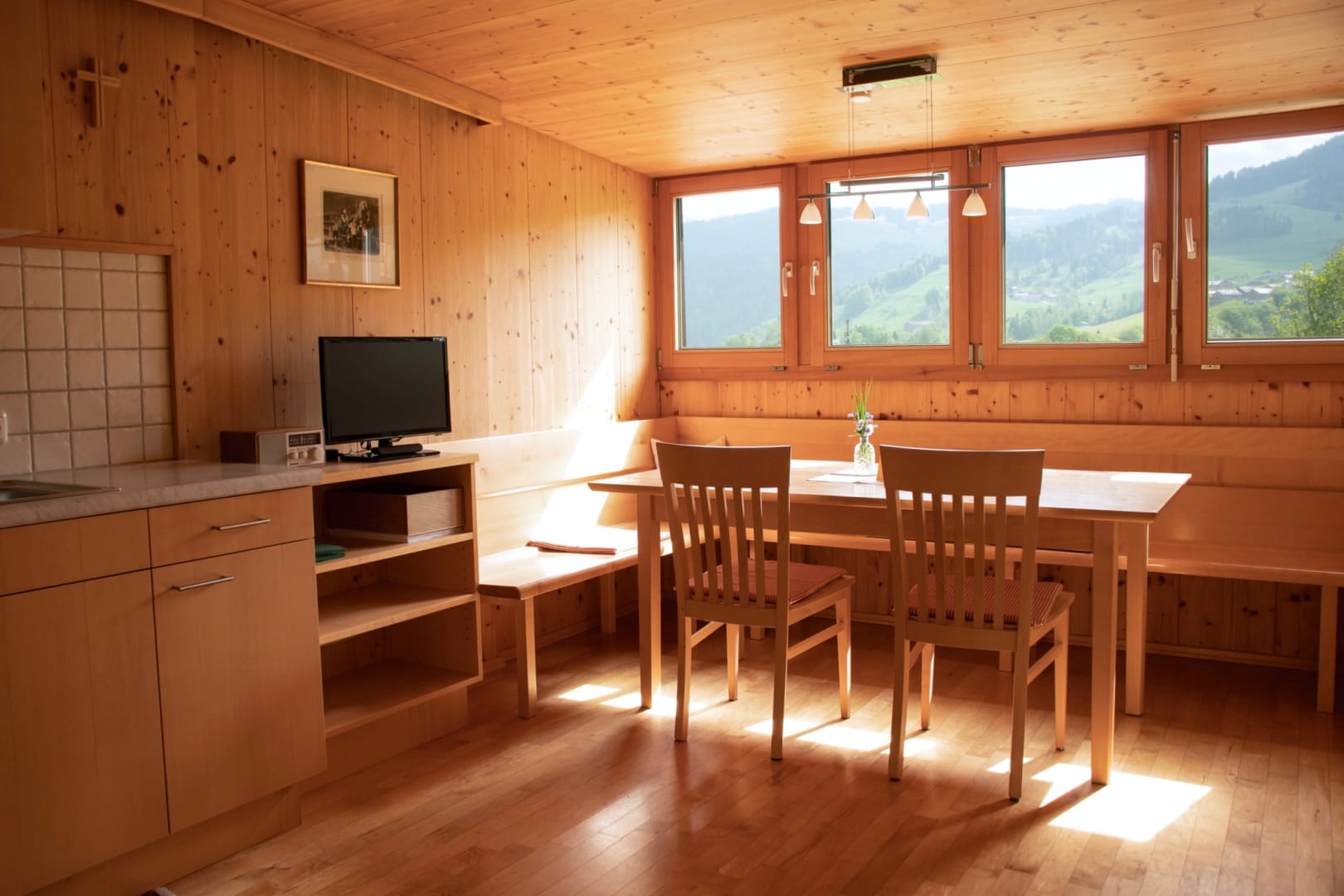 • gemütlicher Wohnraum mit großem Ahorntisch und langer Holzbank