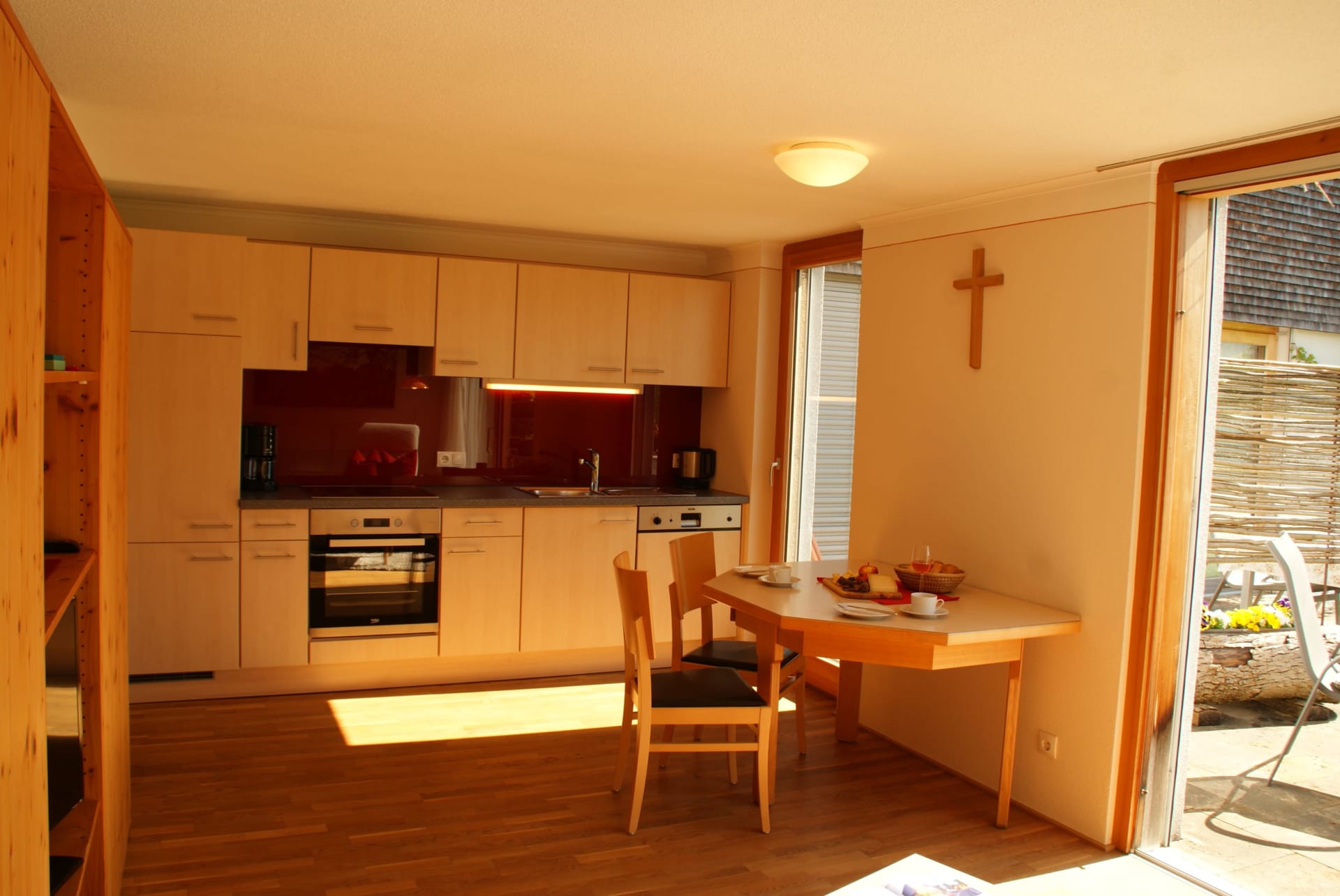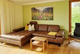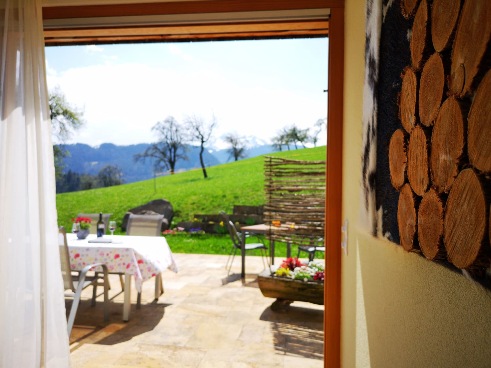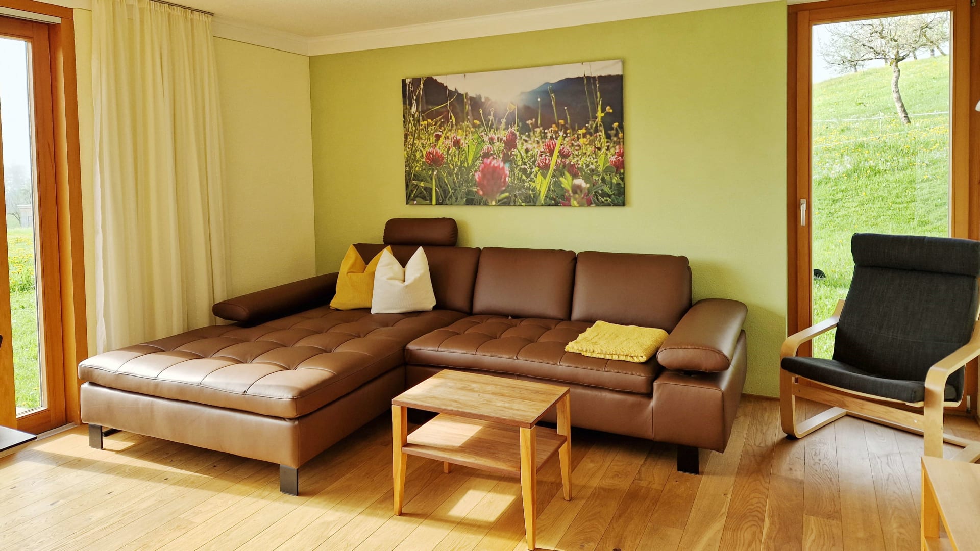 Ebenerdige, geradlinige und modern ausgestattete Ferienwohnung mit großzügigen und raumhohen Glasfronten, welche die Natur ins Haus holen. Ein direkter Ausgang zur privaten Natursteinterrasse eröffnet den Blick auf das Bergpanorama und saftige Wiesen.