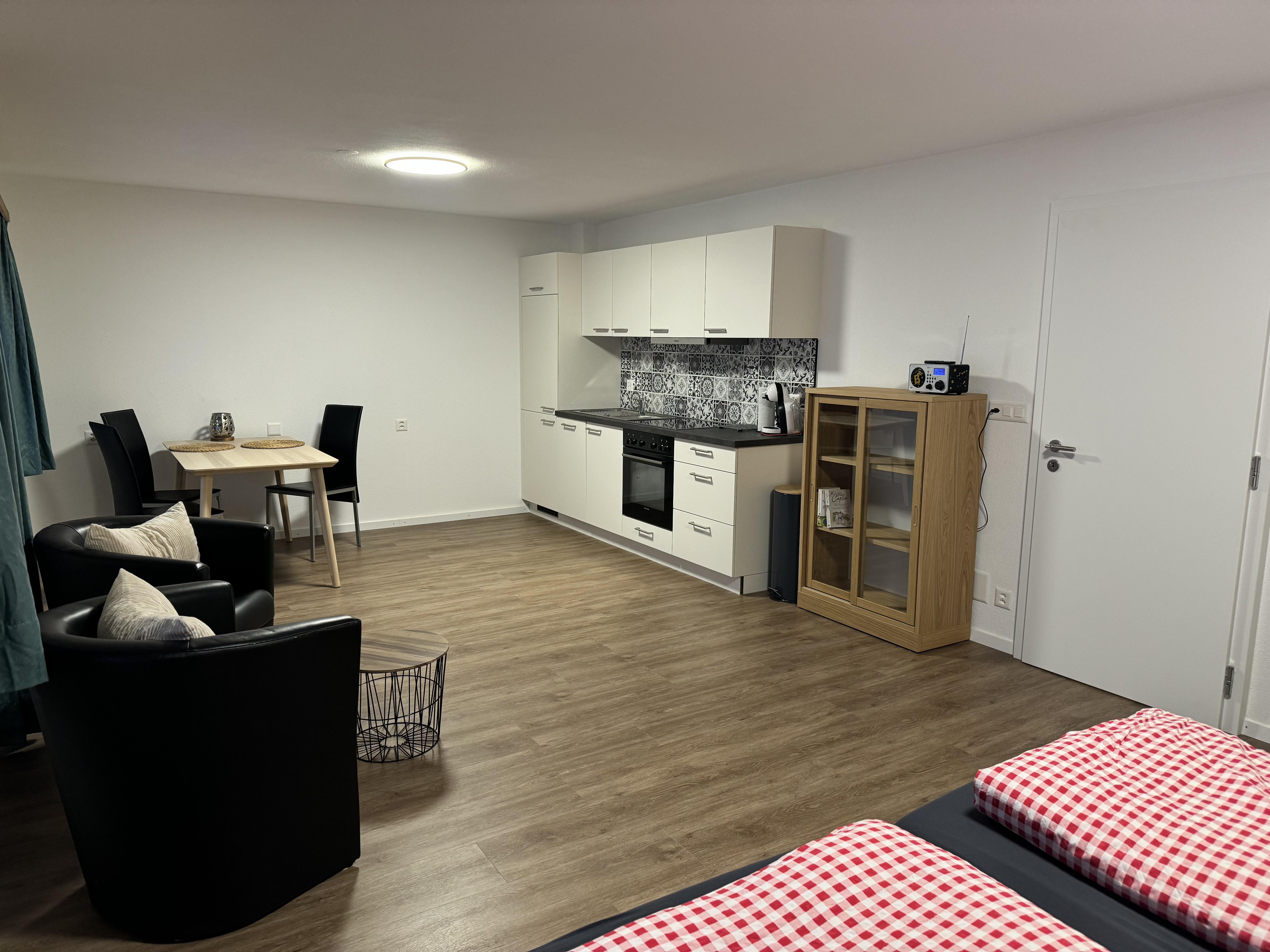 Willkommen in unserem neu renovierten 1-Zimmerwohnung, ideal für zwei Personen. Die gut ausgestattete Küche verfügt über einen Backofen, Geschirrspüler, einen Dolce Gusto Kaffeeautomat und ein Fondue-Set, perfekt für kulinarische Abende. Kostenloses WLAN und ein TV stehen für Ihre Unterhaltung bereit. Ein gemütlicher Esstisch lädt zu gemeinsamen Mahlzeiten ein.