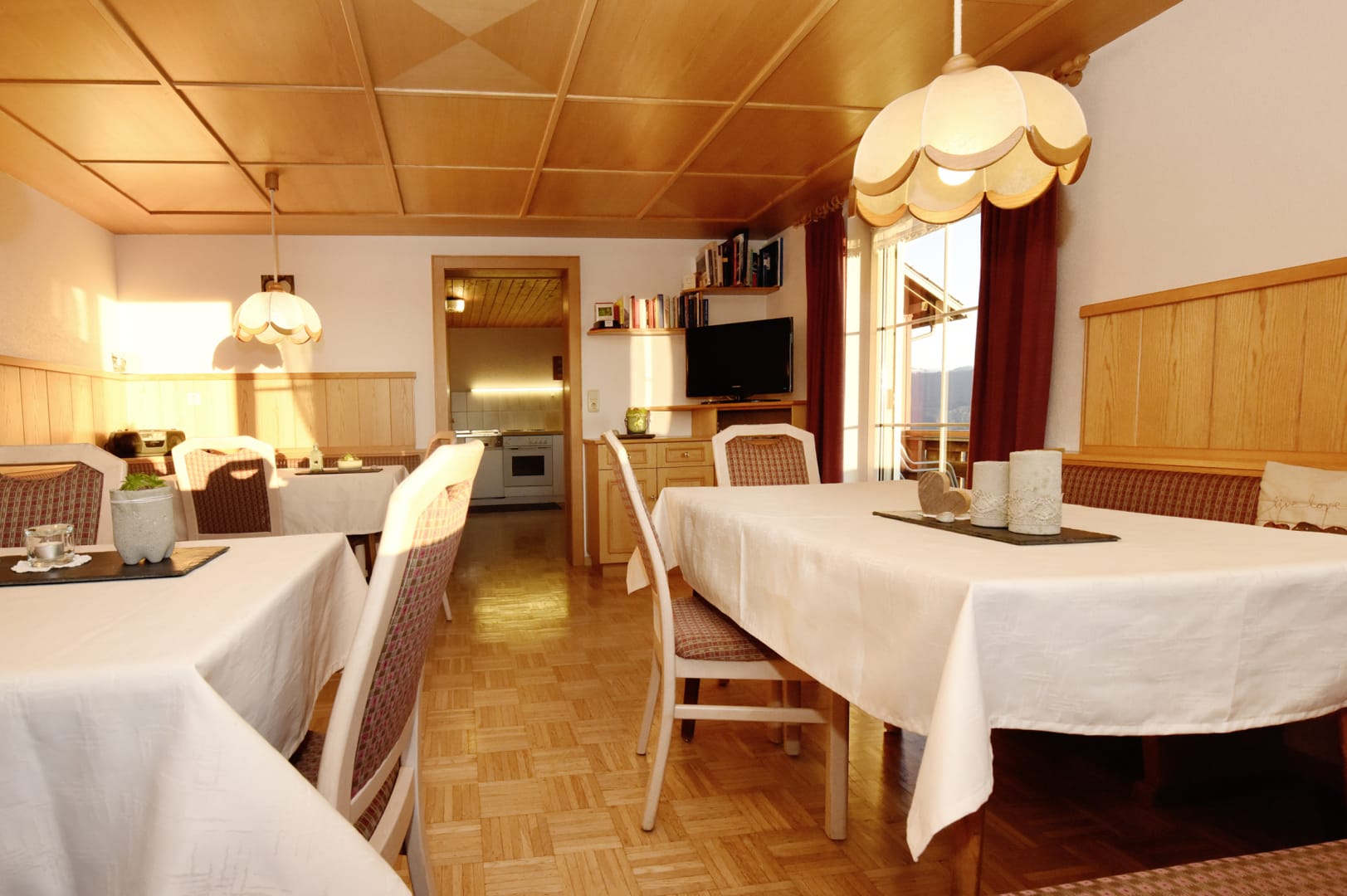 Aufenthalts- Frühstücksraum mit Balkon auf der Süd- und Westseite, Gästeküche