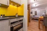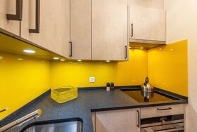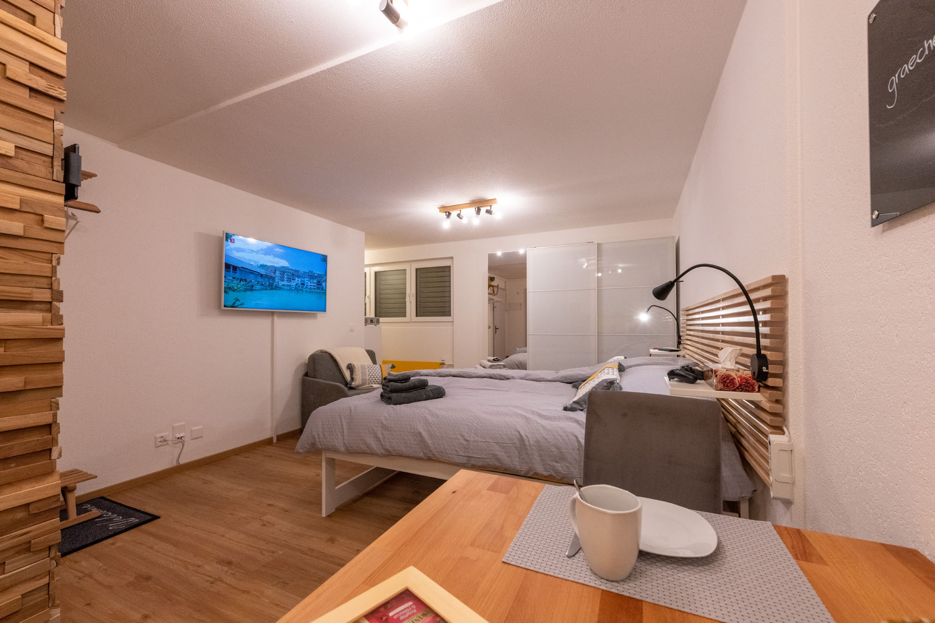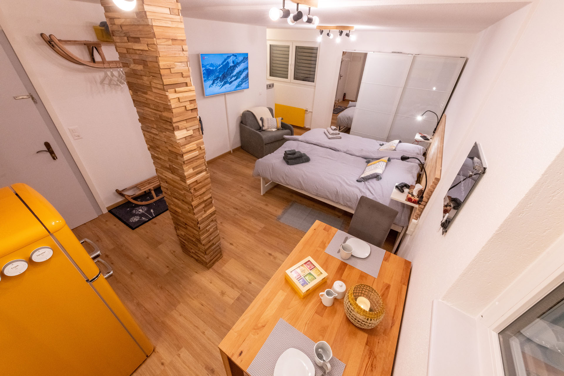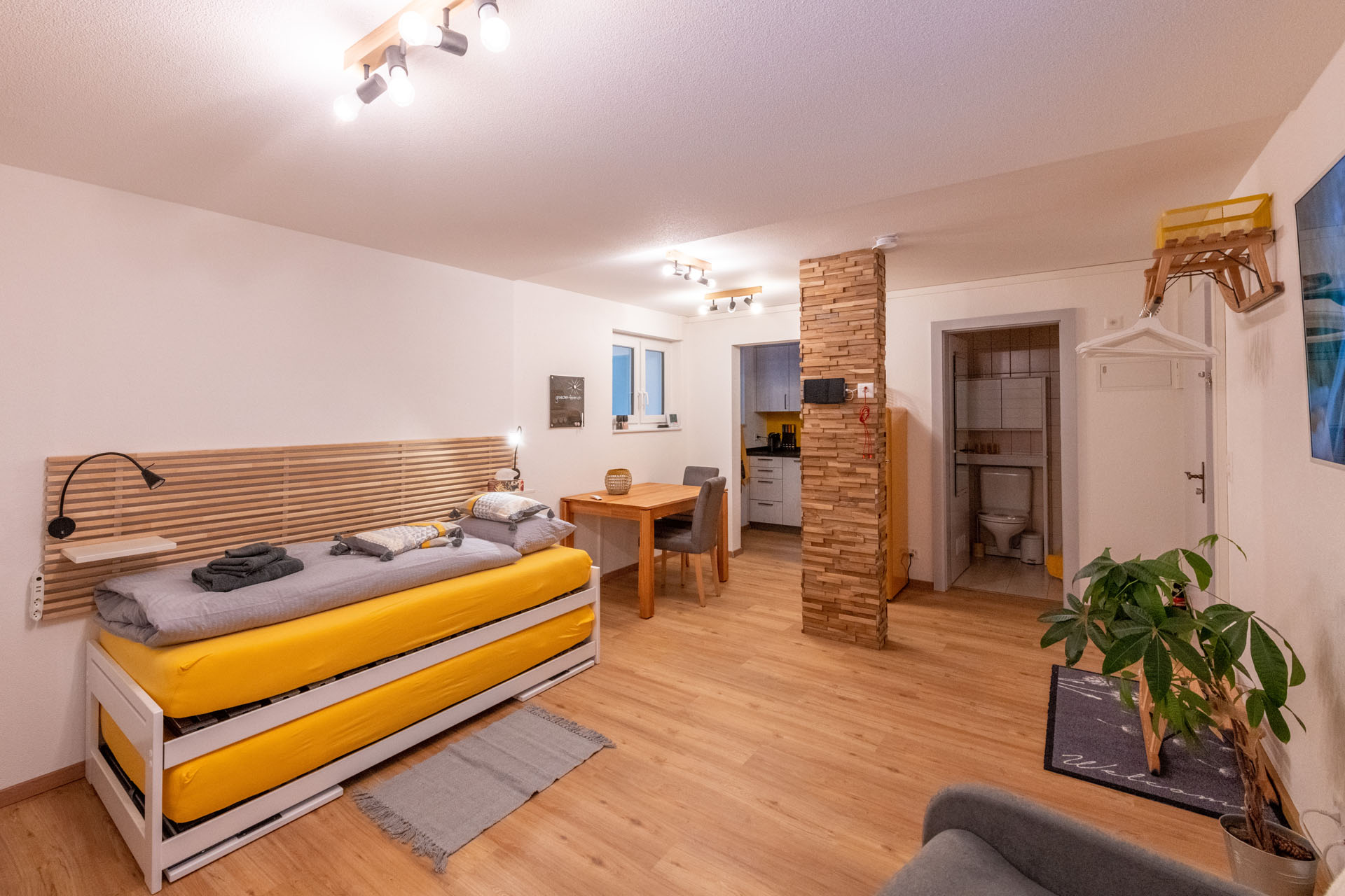 Das modern eingerichtete, im Jahr 2019 komplett renovierte Studio befindet sich im Erdgeschoss des 4-stöckigen „Haus Ambassador“ im Zentrum von Grächen. Ein kleiner Gartensitzplatz vor dem Haus steht zur alleinigen Benützung zur Verfügung. Die ausgesprochen gut ausgestattete, separate Küche trumpft mit einem Induktions-Kochfeld, einem Backofen-Mikrowellen-Kombigerät, einem freistehenden Kühlschrank mit Gefrierfach und einer Nespresso Kaffeemaschine. Ein auf Ihre Bedürfnisse umfunktionierbares, gemütliches Bett garantiert erholsame Nächte - entweder mit 2 separaten Liegeflächen à 90x200cm oder einem Doppelbett à 180x200cm. Der ansprechende Massivholz-Esstisch lädt zu einem gemütlichen Essen und der Lese- und Relaxsessel zum Verweilen ein. Unser “Yellow Home” punktet zudem mit einem grossen Flat-Screen-TV, PlayStation 4 und gratis Wireless Internet. “Klein aber gelb” ist das Motto der mit Dusche und WC ausgestatteten Nasszelle.