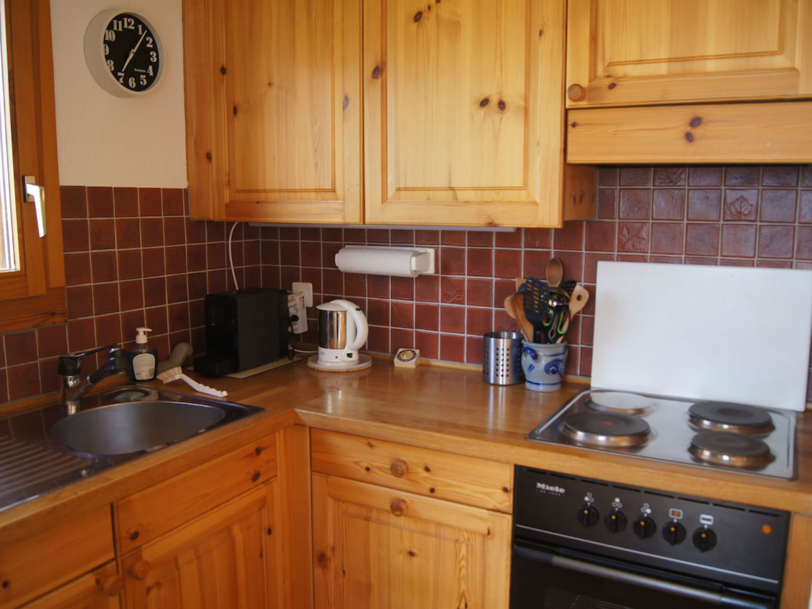Im offenen Wohnraum hat es eine gemütliche Essecke mit Tisch, Eckbank und zwei Stühlen, eine Zweier-Sitzgruppe mit passendem Sessel, einen Salontisch und einen Schwedenofen (Holz für erste Feuerung inbegriffen). Grosser Flatscreen TV (Kabel) und DVD-Player. Grosser Südbalkon (ganzer Tag Sonne) mit Tisch, Stühlen und Liegestühlen.Küche: