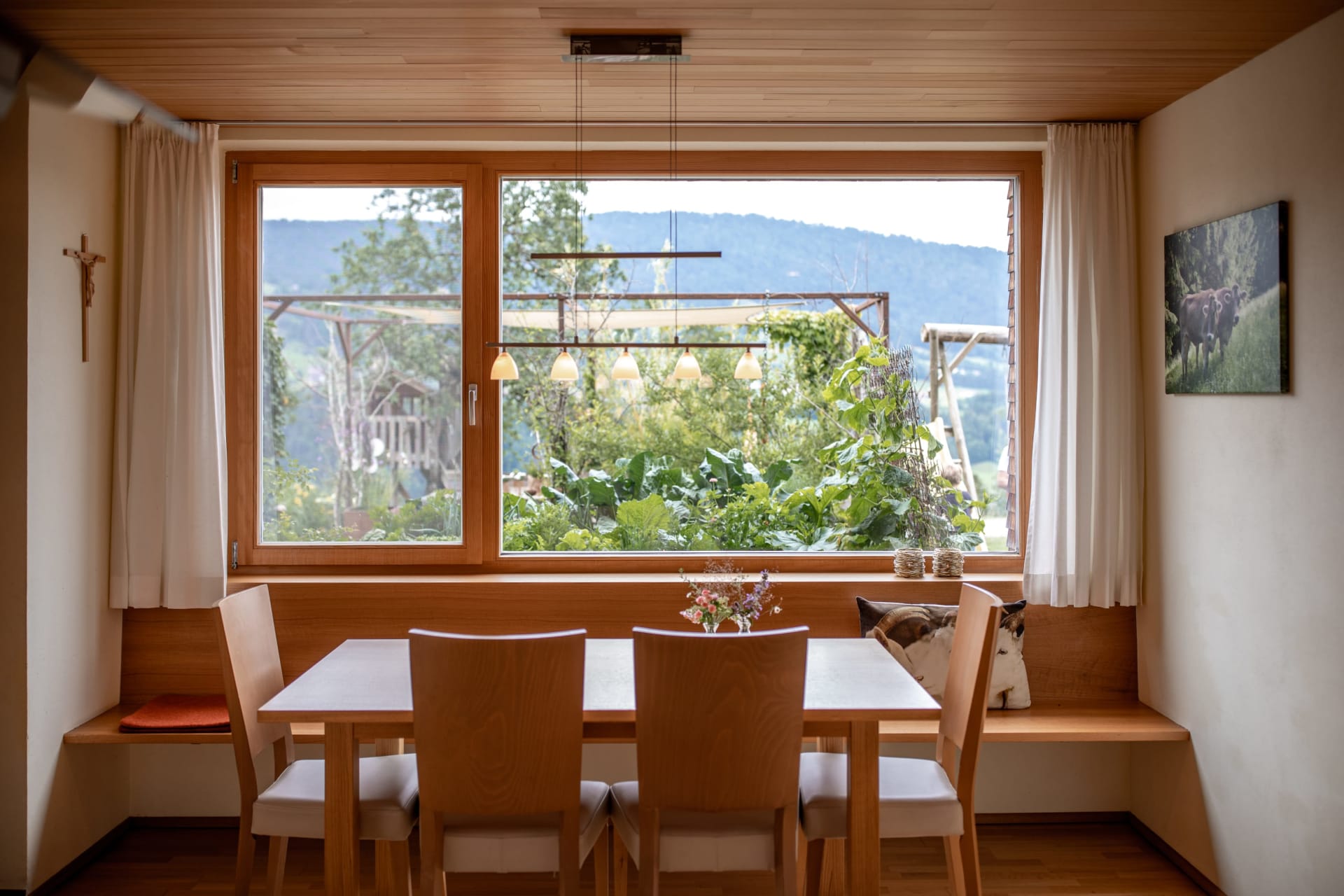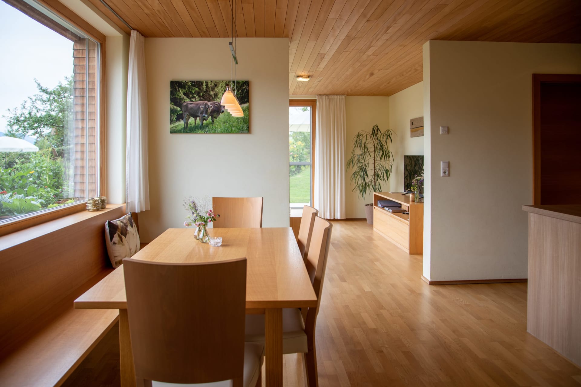 Klare Linien, viel Glas, Holz - überwiegend Weißtanne aus dem eigenen Wald und Eiche sowie feine Stoffe und warme Farbtöne laden Sie zum Genießen ein.
