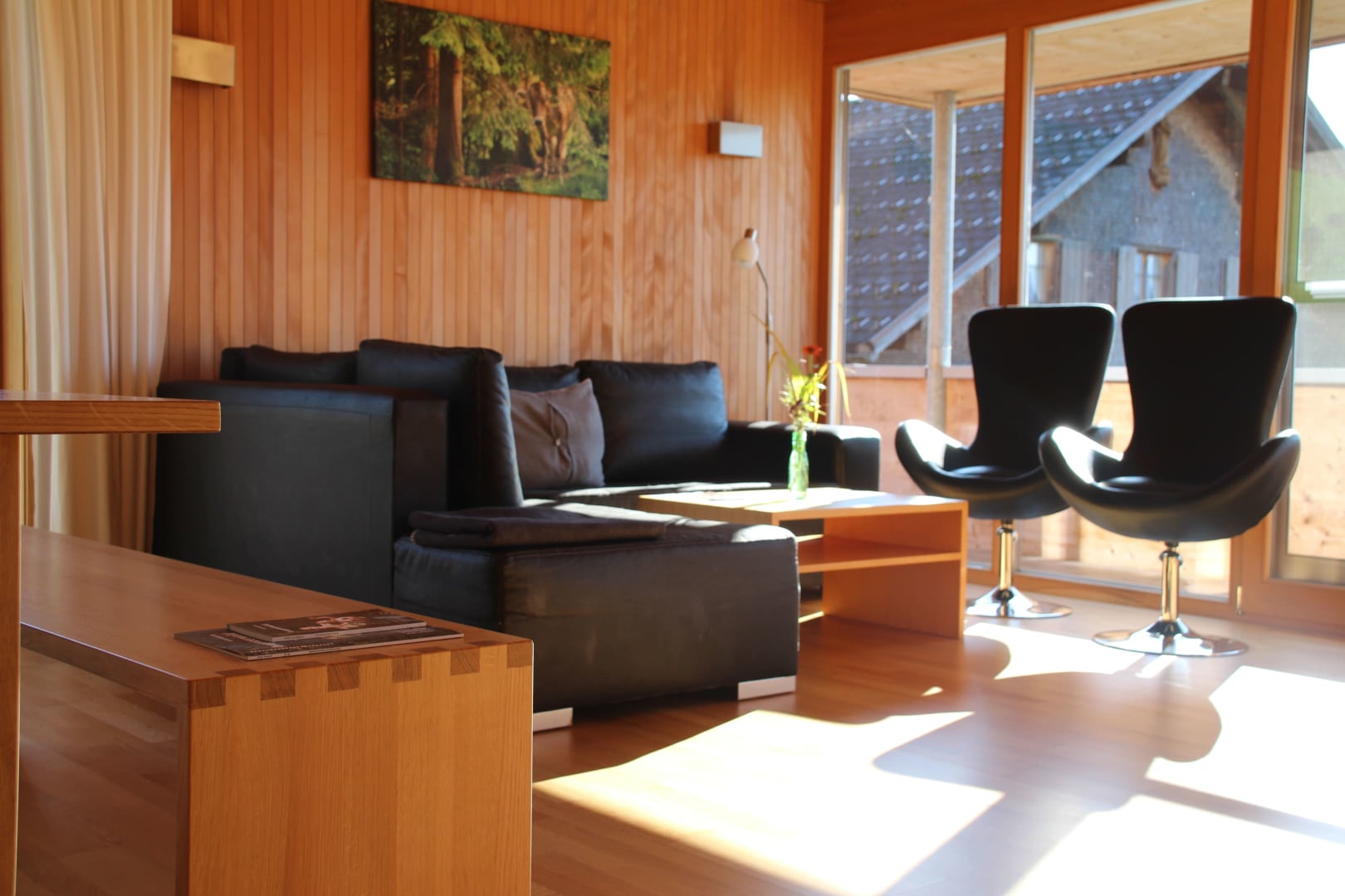 Zwei großzügige, sonnendurchflutete, modern und mit viel Holz eingerichtete Ferienwohnungen mit herrlichem Panoramablick warten darauf, von Ihnen belebt zu werden.