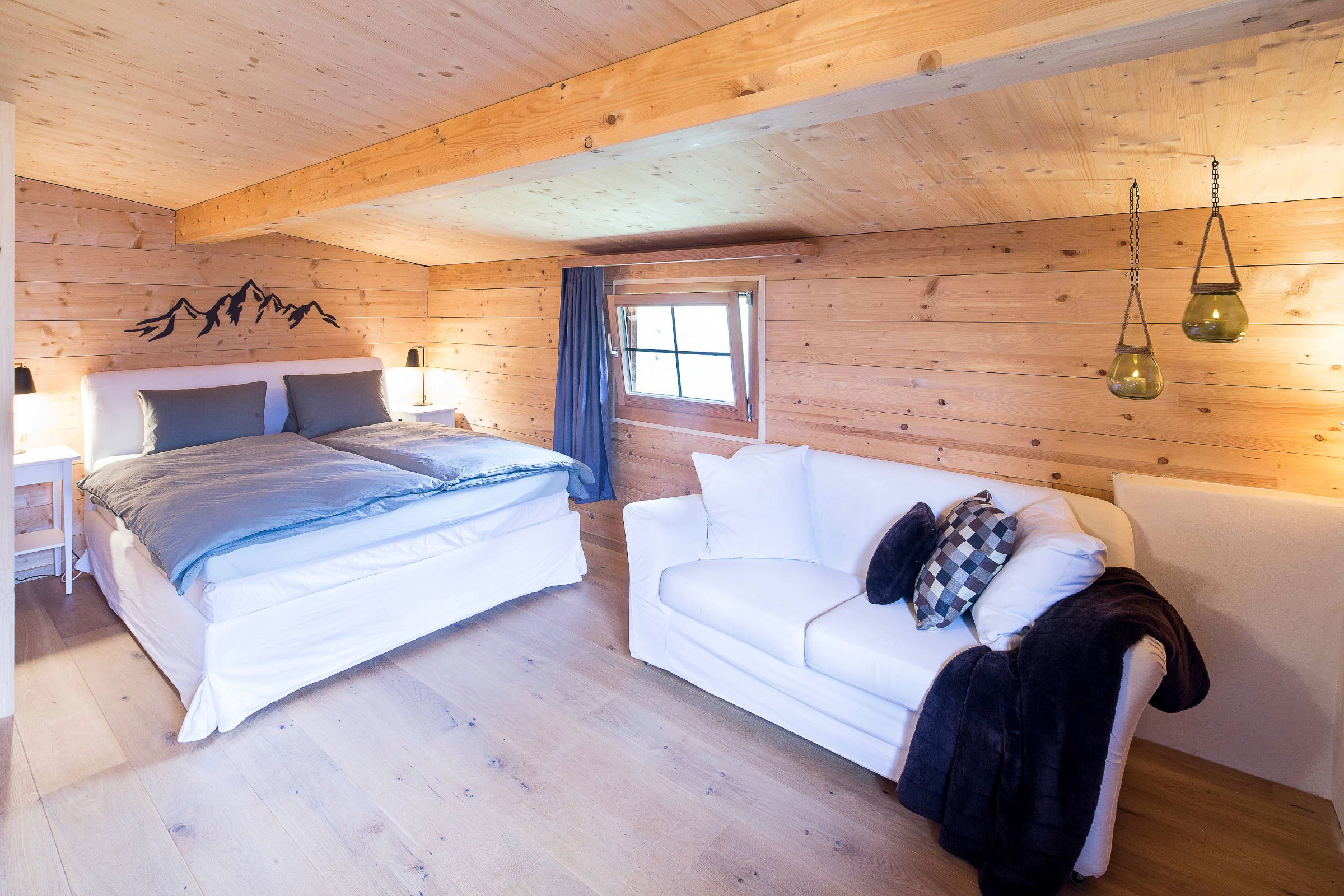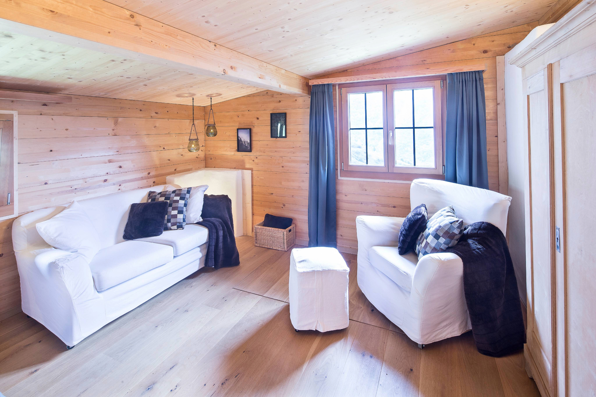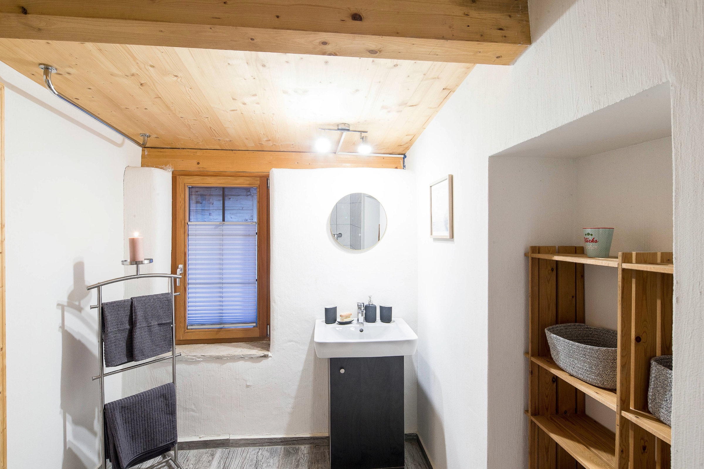 Das Maiensäss ist modern und gemütlich eingerichtet. Das Badzimmer verfügt über ein WC und ein Lavabo. Technische Einrichtung