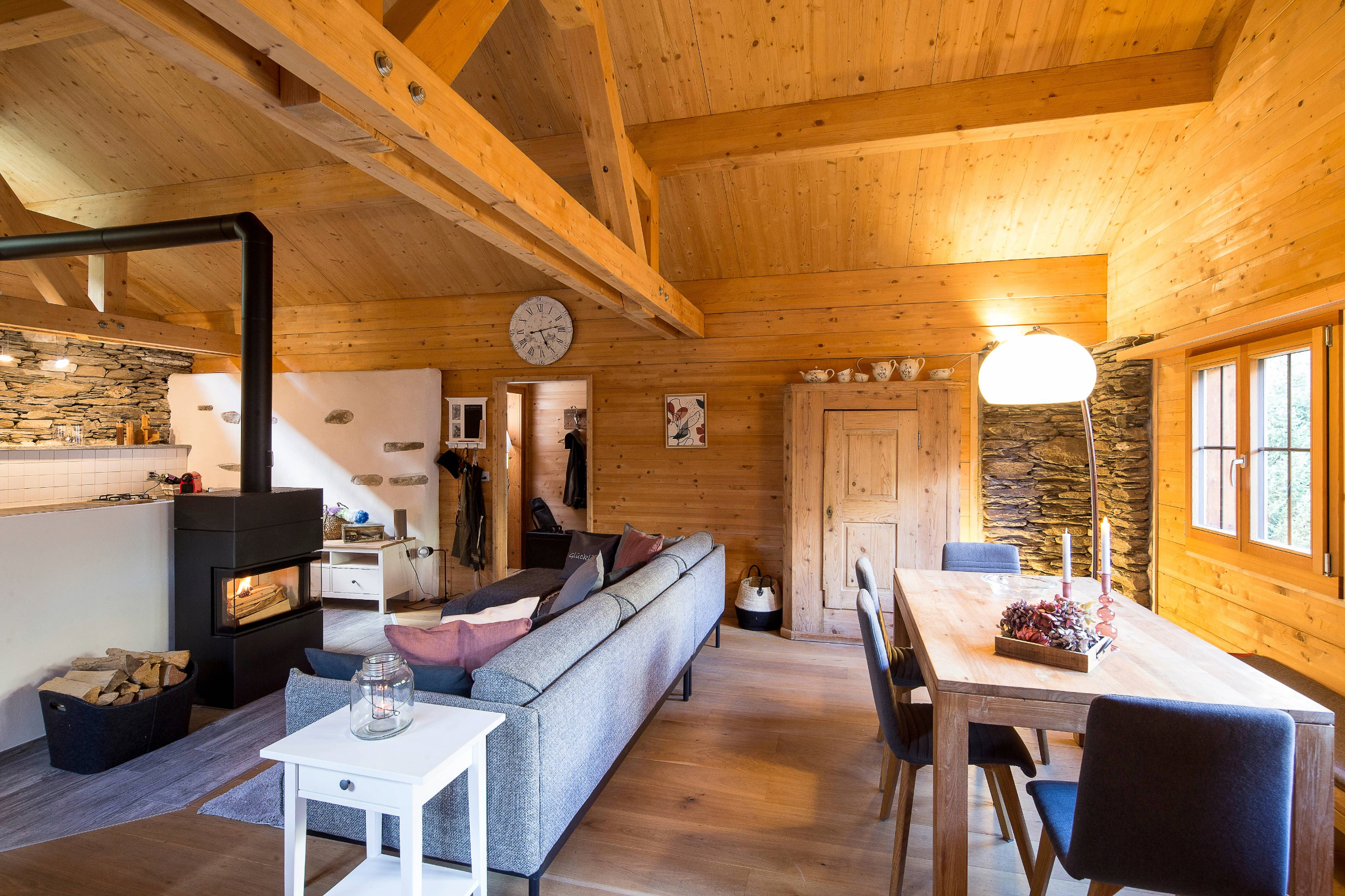 Der grosszügige Raum umfasst Küche, eine gemütliche Sofaecke mit Kamin und einen grossen Esstisch mit Blick ins in die Berge und ins Tal. Seperates Jägerstübli