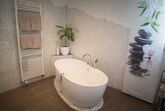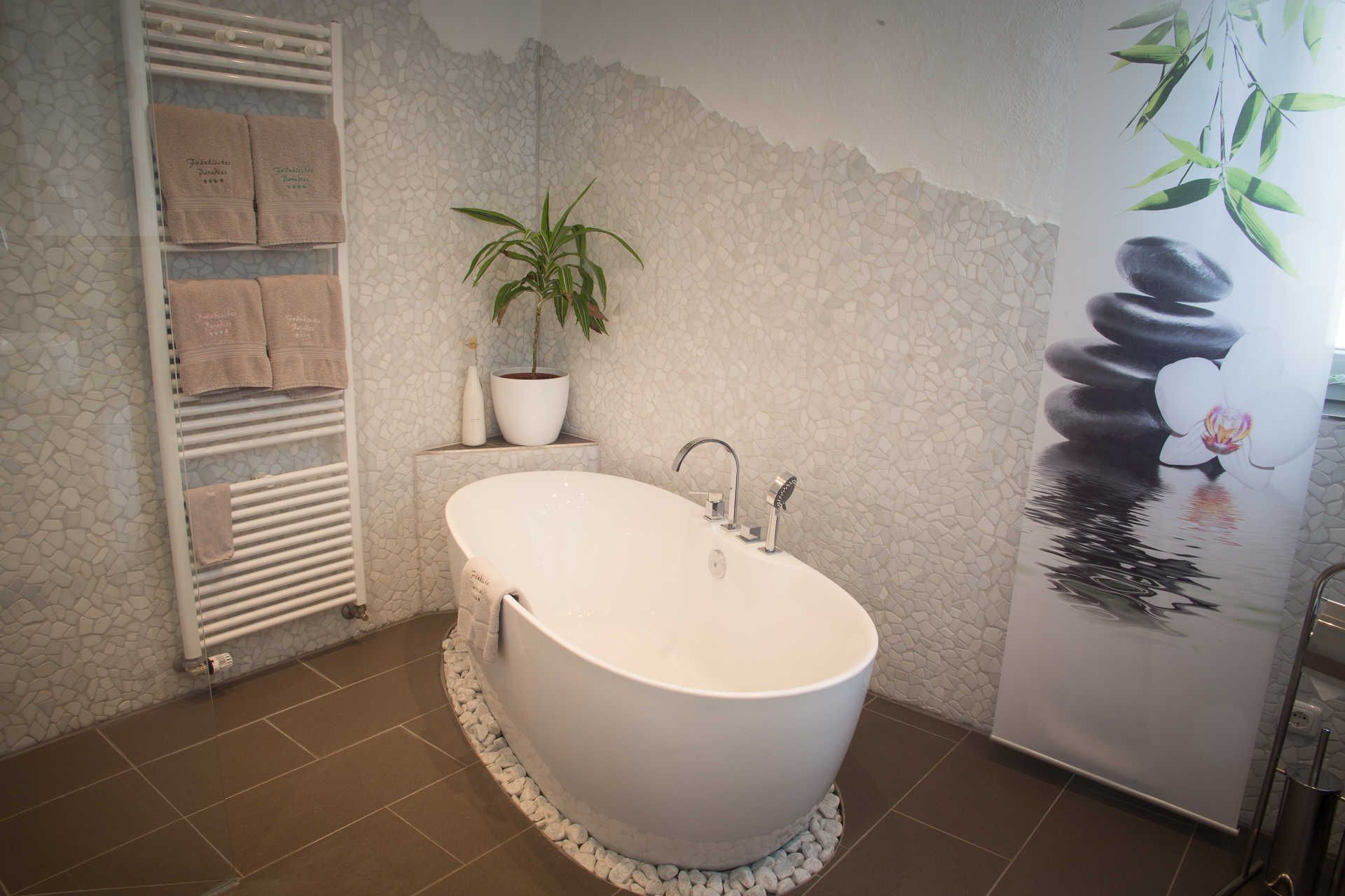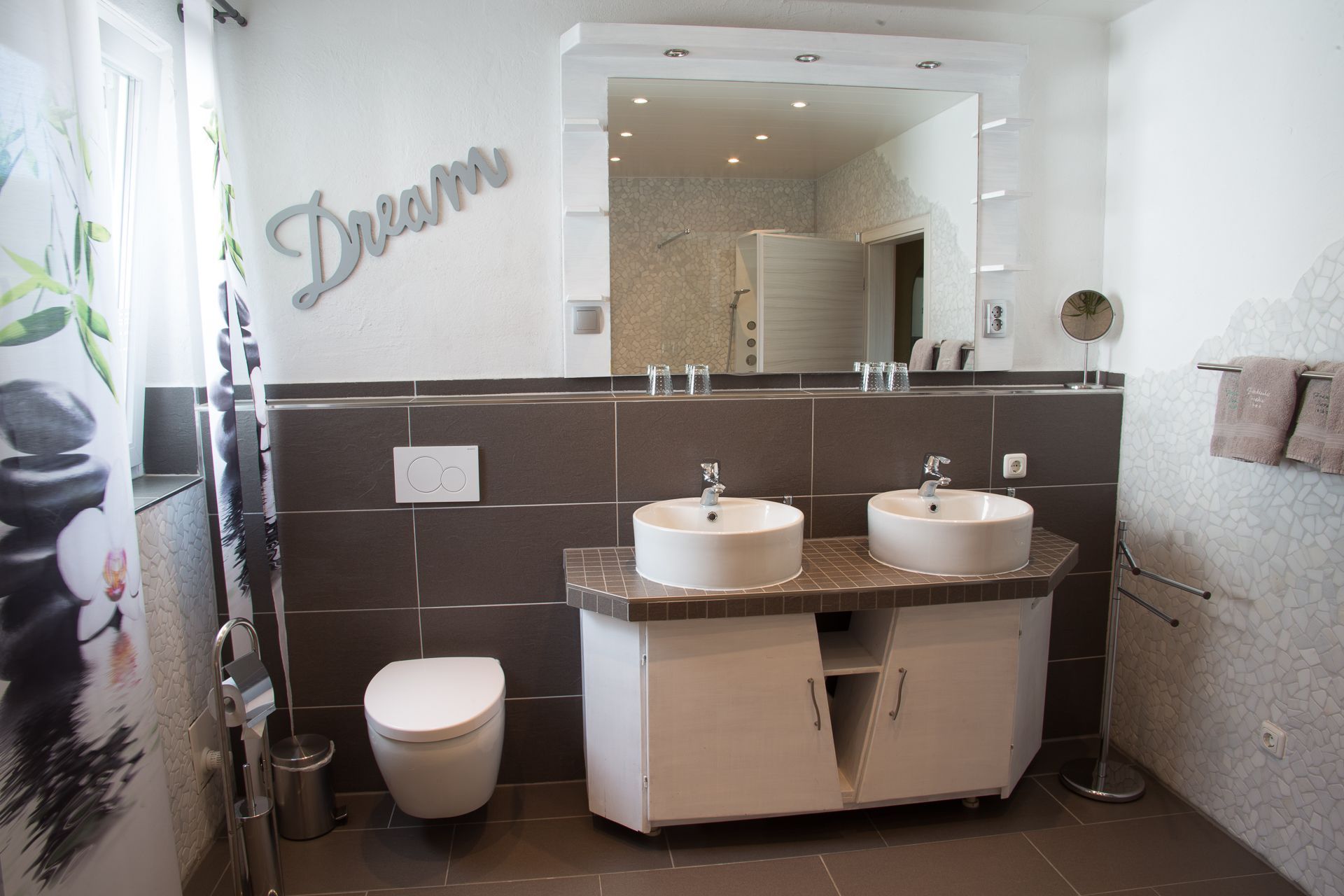 Im neuen Badzimmer finden Sie alles, was Sie zum frisch machen benötigen: Zwei Waschbecken, WC, freistehende Badewanne, Walk-in-Dusche und Handtücher stehen dort für Sie bereit. Gerade bei einer Belegung mit mehreren Personen ist mit Sicherheit das separate Gäste-WC ein kleiner Luxus.