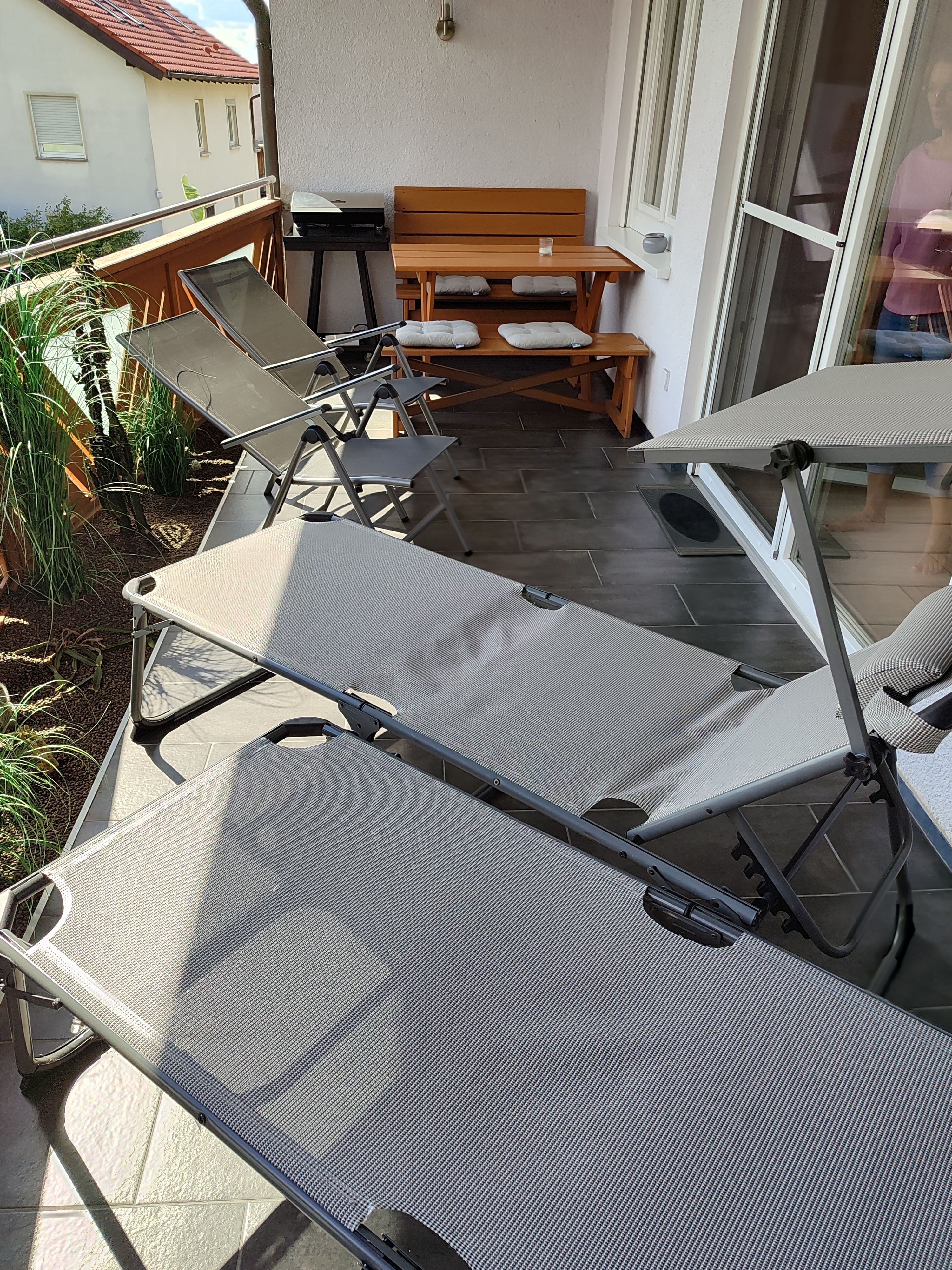 Das Wohnzimmer ist mit gedeckten Farben eingerichtet. Helle und abgestimmte Töne dominieren. Gepflegte Böden, Vorhänge und Leuchten machen die Unterkunft sehr wohnlich. Eine Sofa-Garnitur, eine Essecke im toskanischen Stil und ein Flachbild-TV (mit FireStick) erwarten Sie im Wohnzimmer. Der Südbalkon ist möbliert mit rückengerechten XXL-Sonnenliegen, Relax-Sesseln, Sonneschirm, Essgarnitur und Grillmöglichkeit.