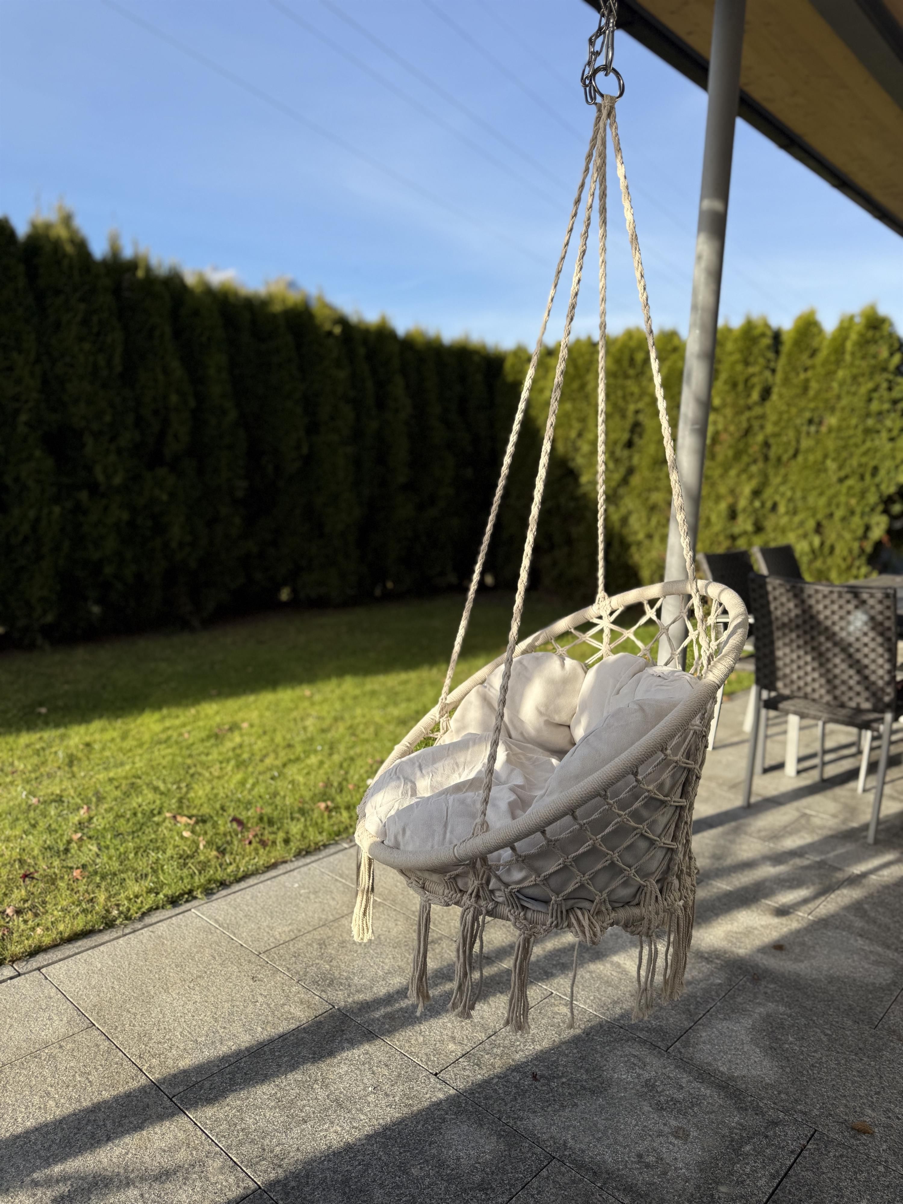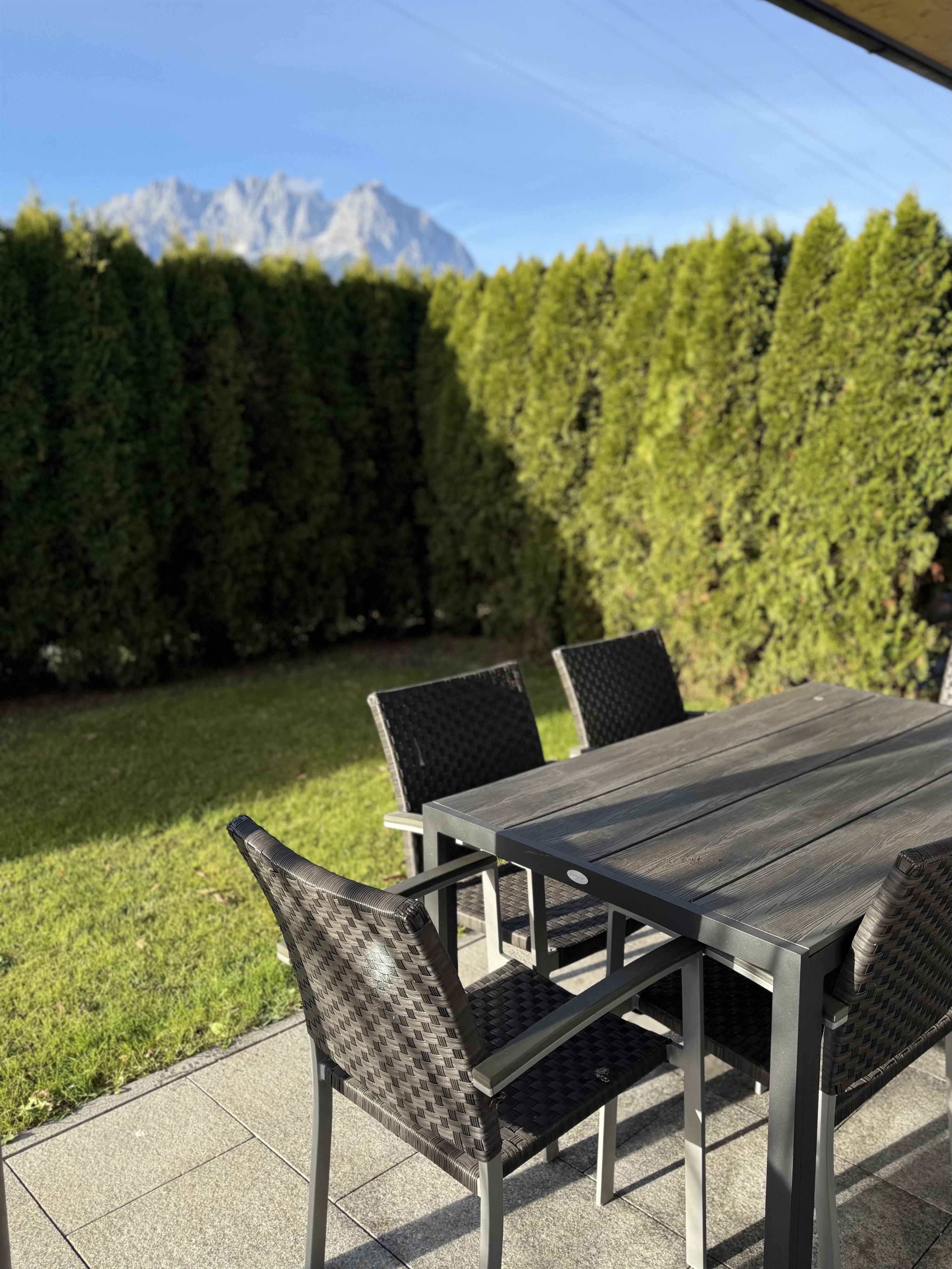 Auf der Terrasse mit Garten genießen Sie einen traumhaften Blick auf den Wilden Kaiser.