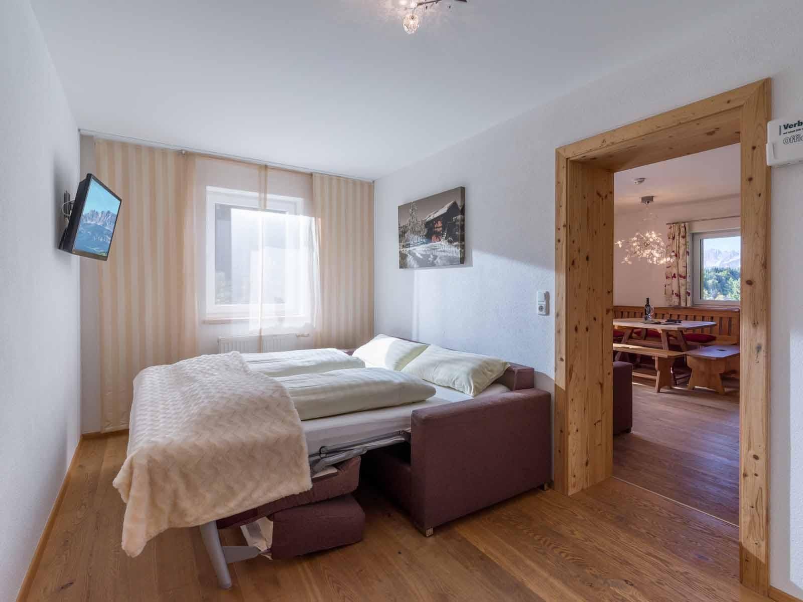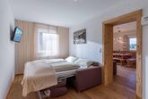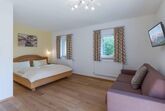 Großes Schlafzimmer mit einem Doppelbett (180 x 200), TV, Bad mit Dusche und WC und zusätzliches hochwertiges Couchbett für 2 Personen.
