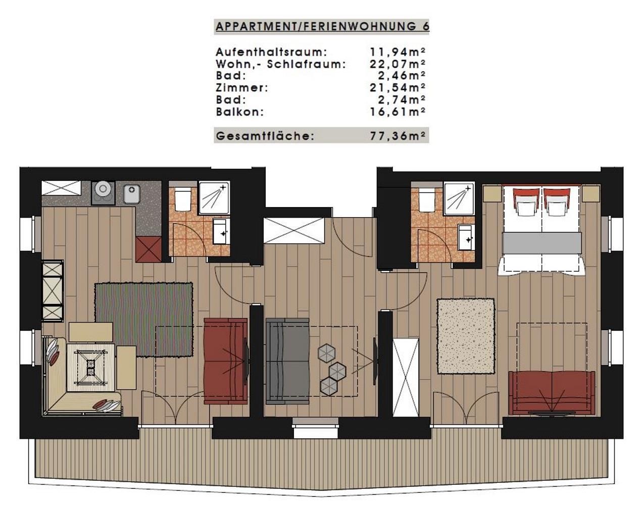 Eine supergemütliche gehoben ausgestattete Wohnung mit 77 m² für 4 bis 8 Personen mit edlem Eichenholzboden mit 2 Schlafzimmern und 2 Bädern, großem Balkon mit Kaiserblick.