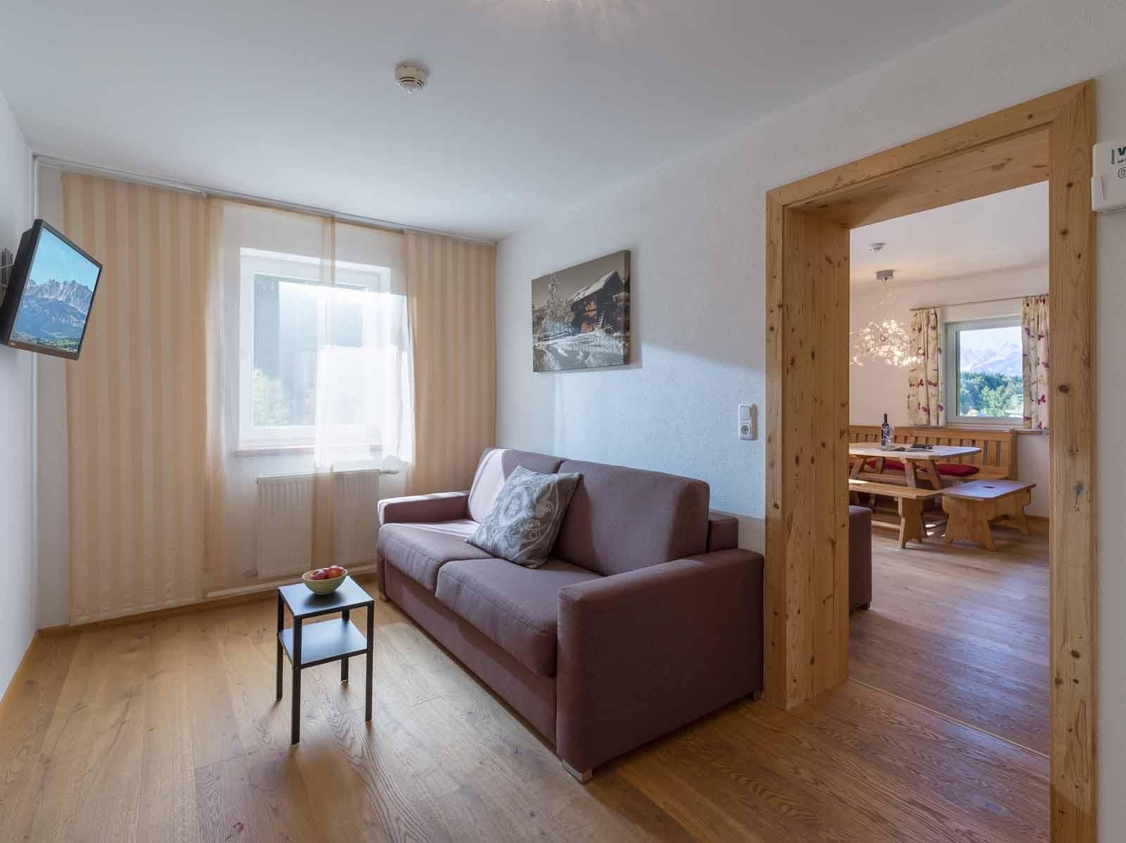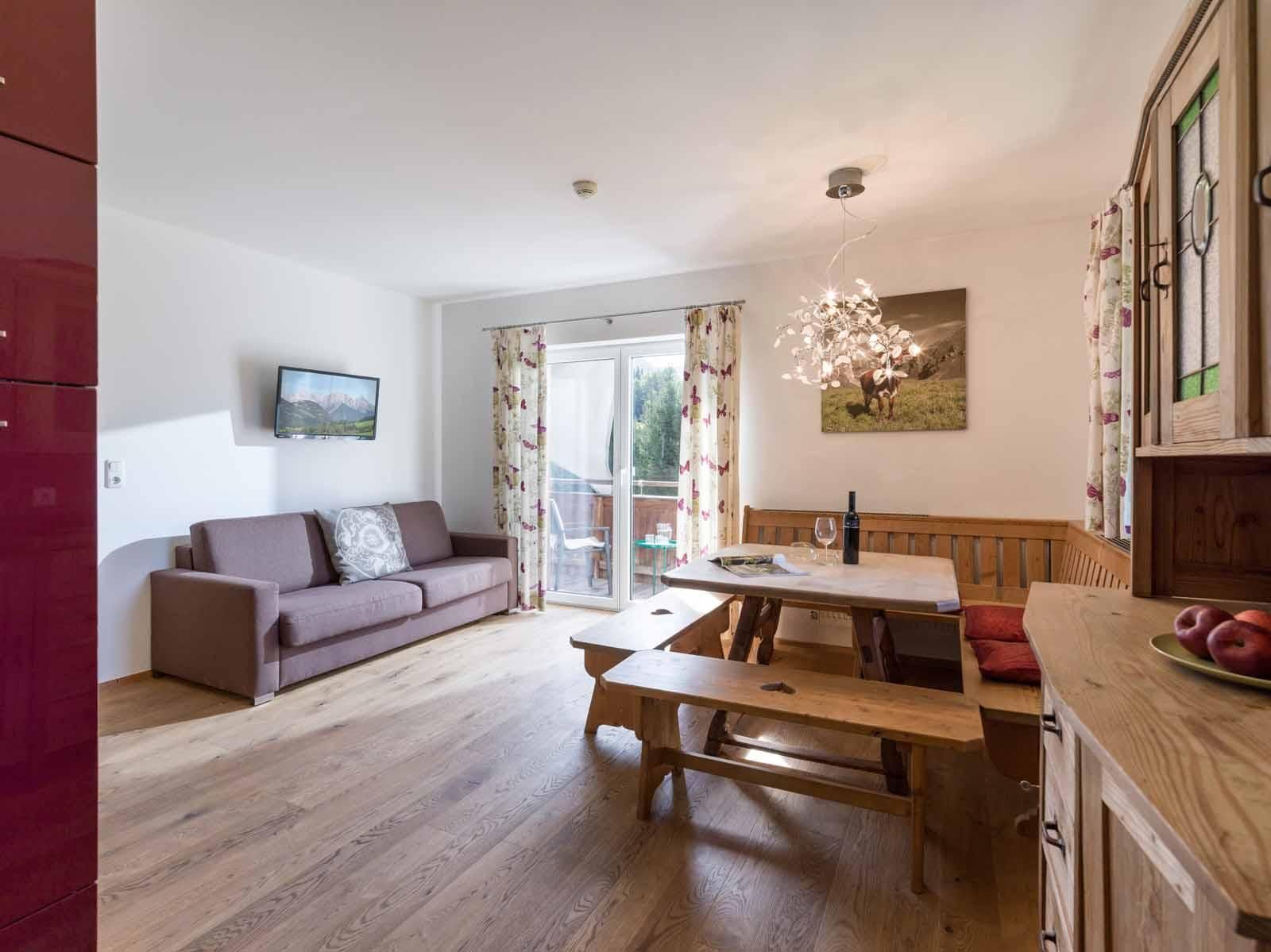 Voll ausgestattete Wohnküche mit hochwertigem Couchbett für 2 Personen und rustikaler Essecke, TV-Gerät und Bad mit Dusche und WC.