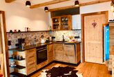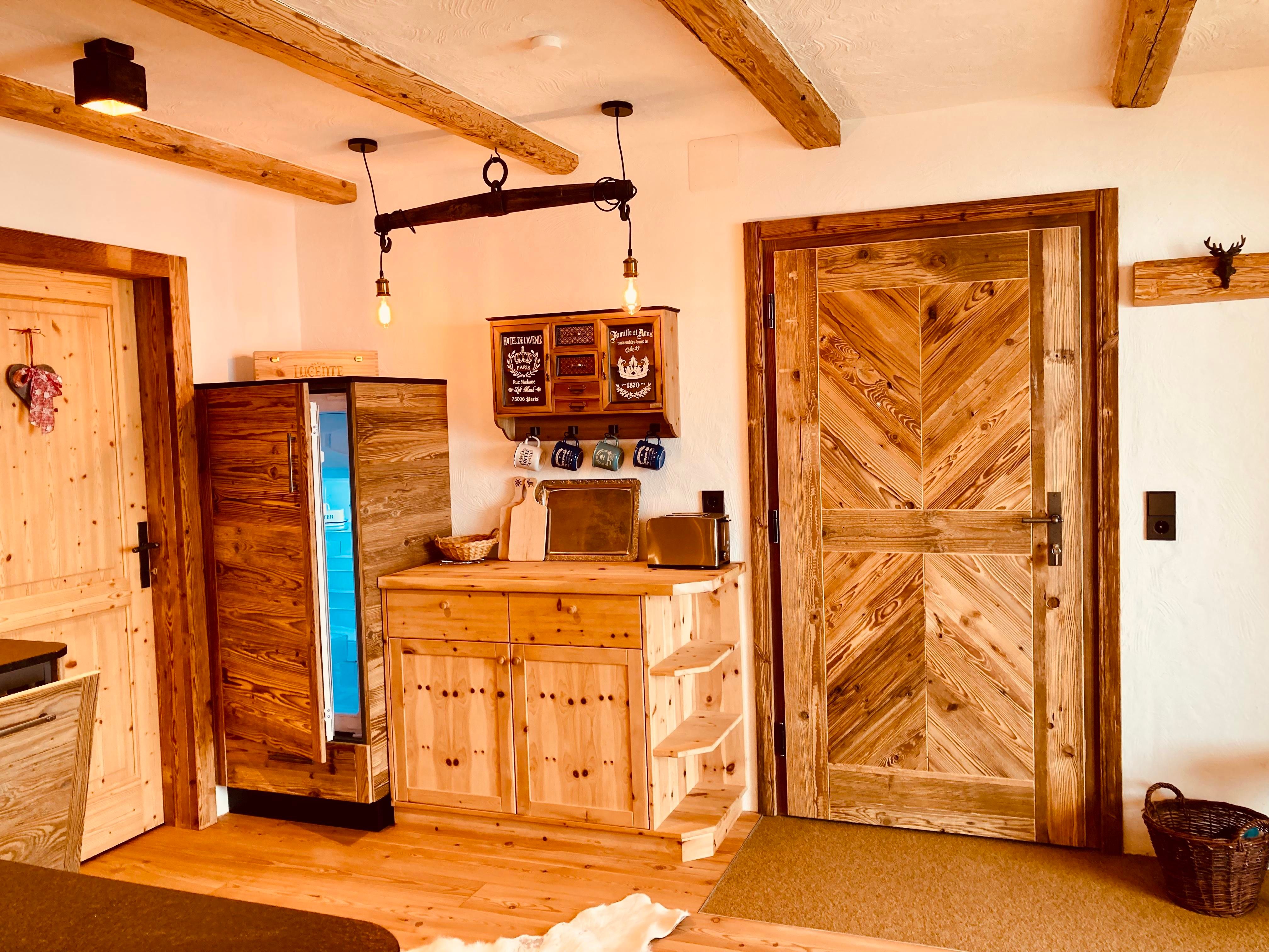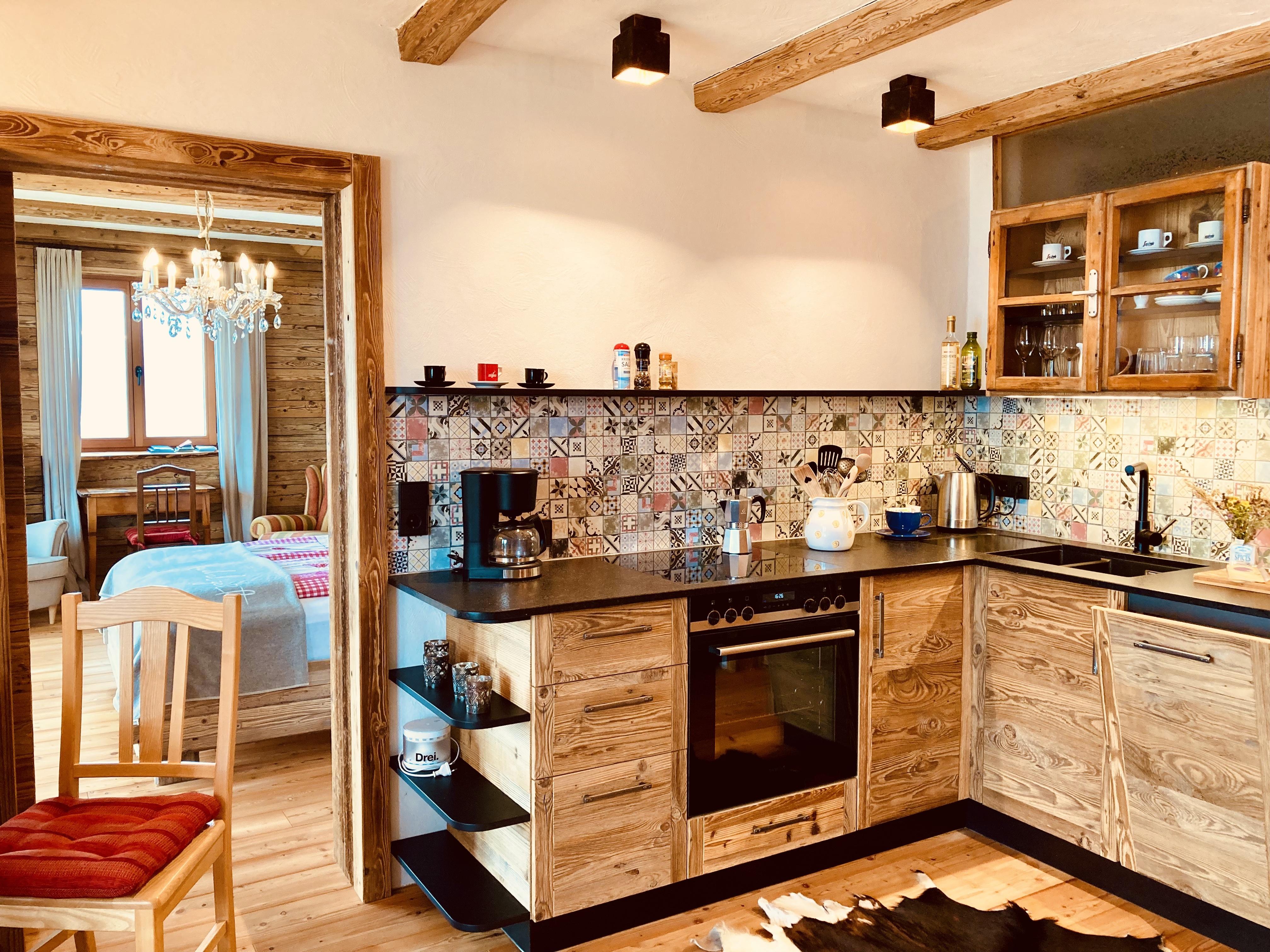 Die gemütliche Wohn-Küche aus Altholz ist voll ausgestattet.