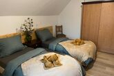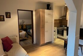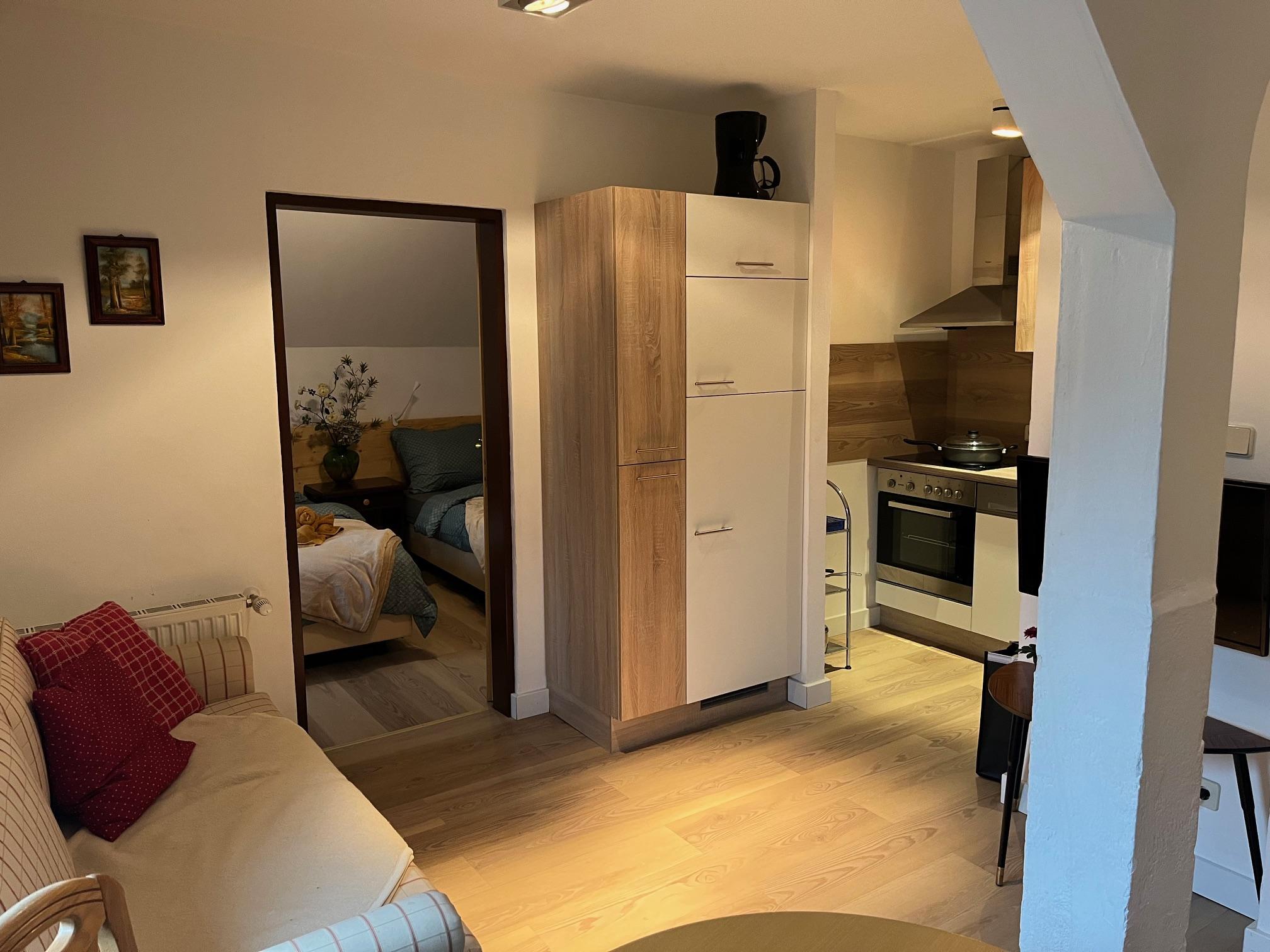 Appartement 57 m2, 3 Räume, Schlafzimmer mit Doppelbett und Zusatzbett, Schlafzimmer met Doppelbett, Wohnraum mit moderne Kuche und einem Essbereich, geeignet für 5 Personen, Bad - Wc / Kabel – Tv, großer Balkon zur Strasse und Garten.