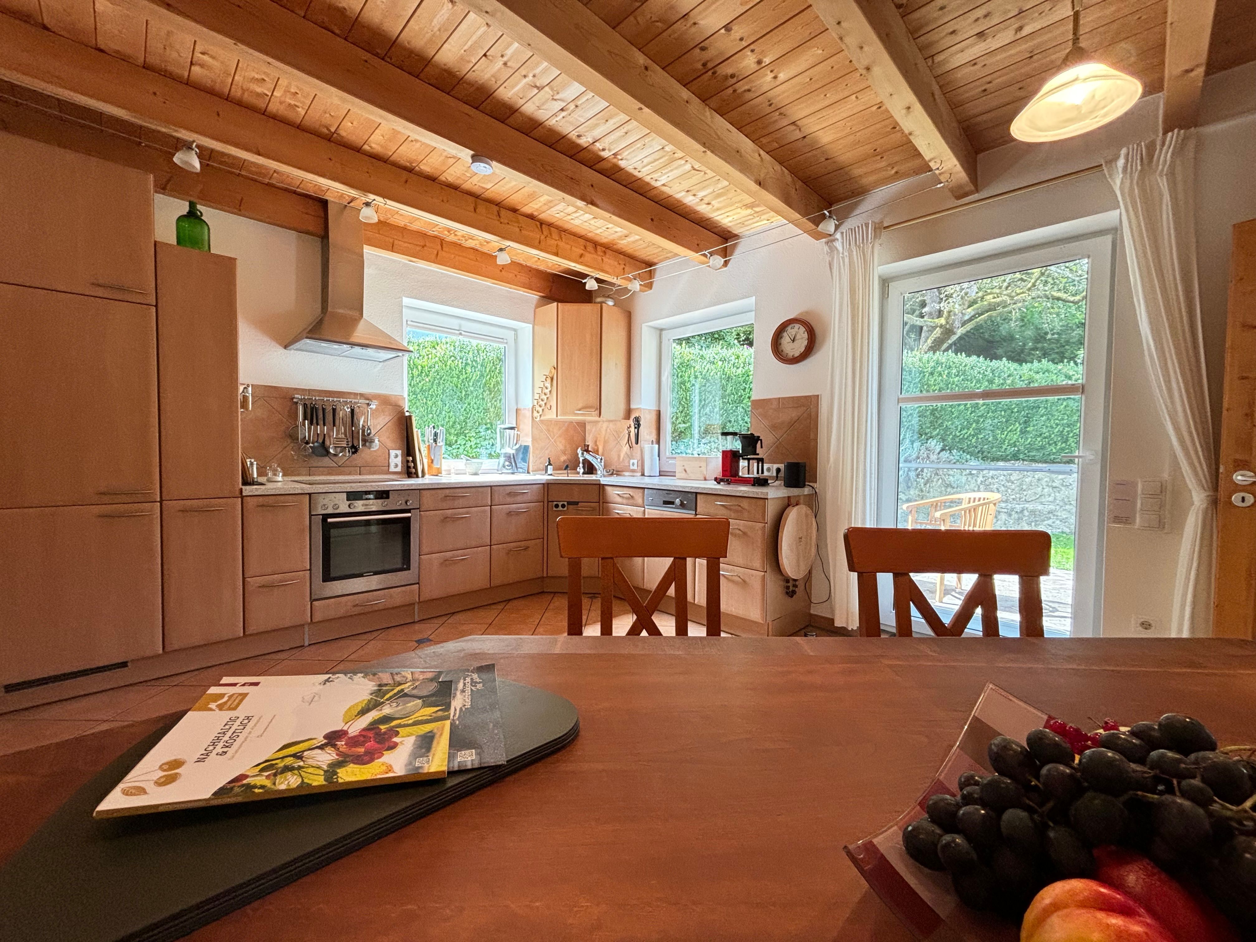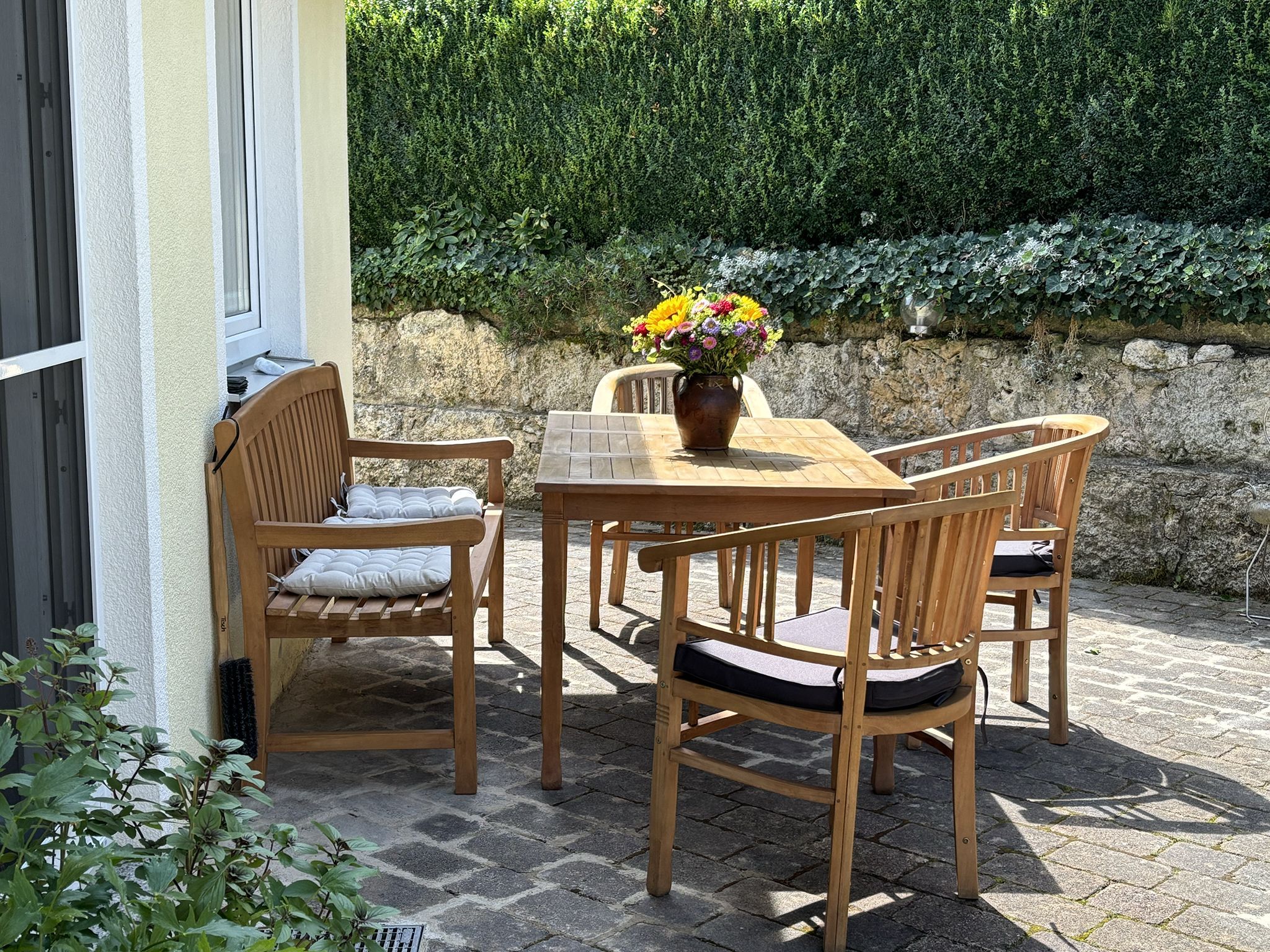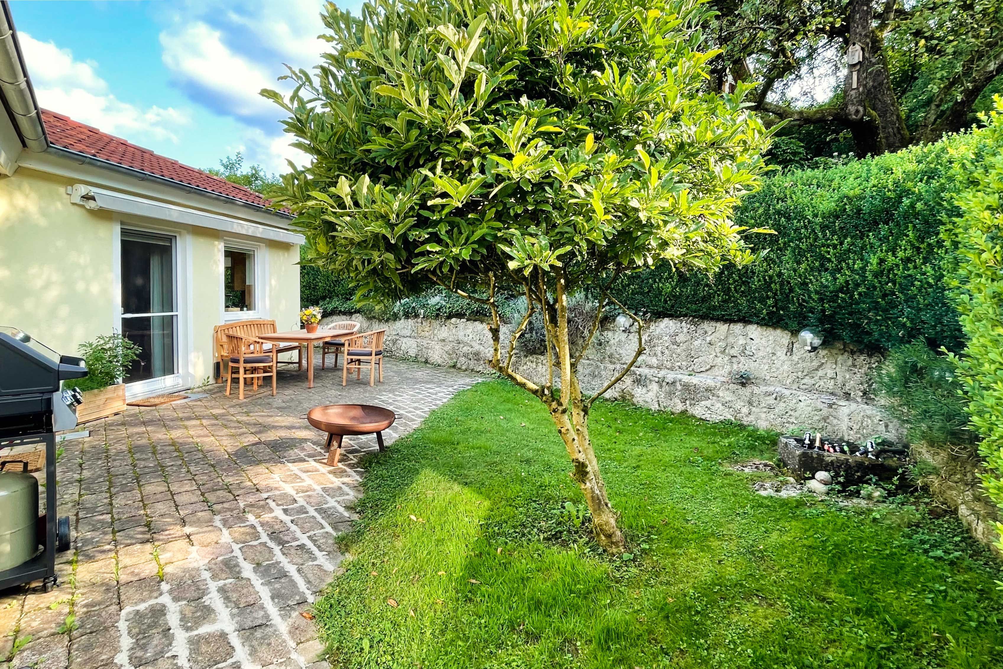 Die Terrasse mit Grillplatz, Feuerschale und Vollholzsitzgarnitur kann durch eine elektrische Markise zum angenehmen Schattenplatz umfunktioniert werden. Ob Sie auf dem Rasen Sonnenbaden oder sich in der Quelle ein kühles Getränk holen, Sie sollen sich rundum wohlfühlen.