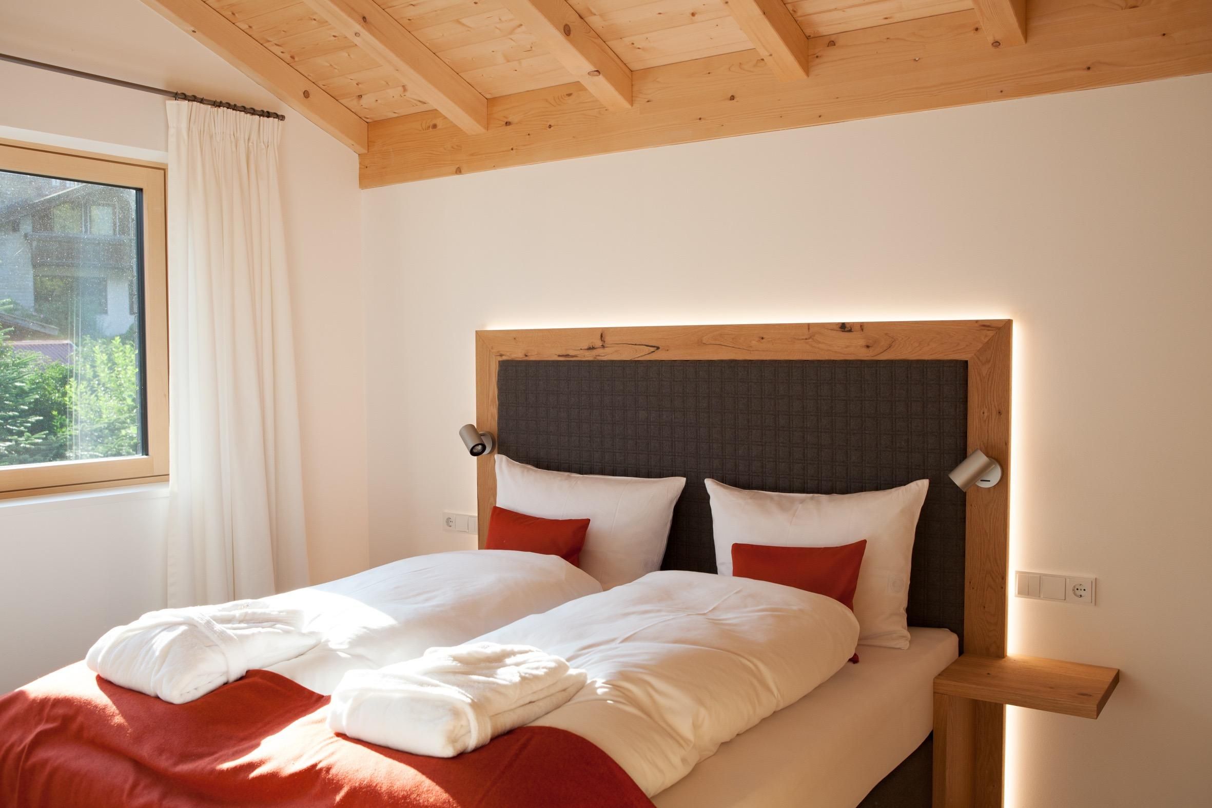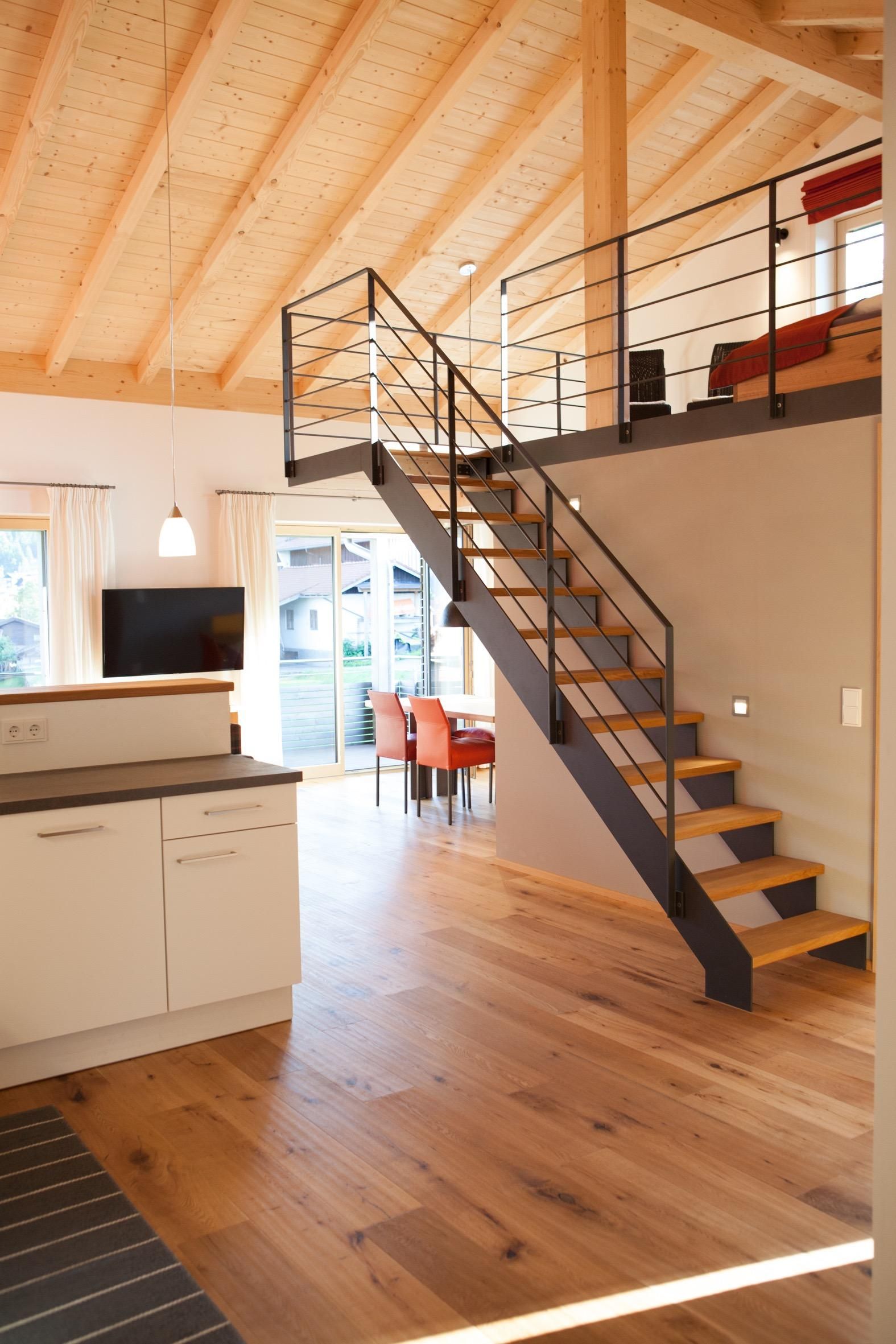 Unsere Wohnung „Auszeit“ befindet sich im Dachgeschoss und besticht mit einem traumhaften, offnen Dachstuhl und einem herrlichen Blick rein in die Berge. Verteilt auf zwei Ebenen befindet sich im unteren Bereich neben dem Schlafzimmer und dem Badezimmer mit Sauna auch die Küche mit angrenzendem, offenen Wohn- und Essbereich. Hier haben Sie Platz zum gemeinsamen kochen, essen und verweilen. Die Ausstattung ist hochwertig, stimmig und trägt dazu bei, sich rundum wohl zu fühlen. Die Galerie bietet mit einem Doppelbett Platz für weitere Gäste oder lädt zum entspannen ein.