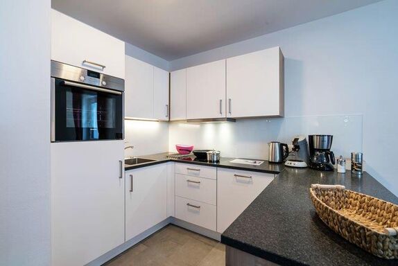 Apartment A hat ein Wohnzimmer mit voll ausgestatteter Küche, Essbereich und ein Luxus Schlafsofa fur 2. Ein Schlafzimmer mit ein boxspring für 2, ein Badezimmer, ein separate Toilette und unten ein Schlafzimmer mit ein boxspring für 2 mit ein eigenem Badezimmer