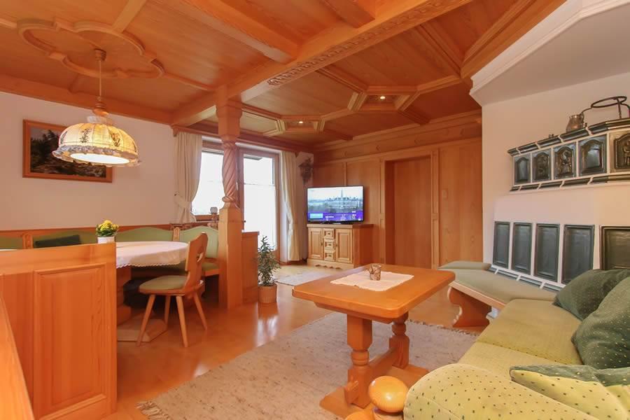 Entspannen Sie sich in unserer wunderschönen 80 m² großen Ferienwohnung für bis zu 4 Personen mit Vorraum, Wohnküche, Naturholz-Wohnzimmer mit gemütlichem Kachelofen, großem FLAT-TV und direktem Zugang zur herrlichen Sonnenterrasse mit Garten und Liegewiese. Badezimmer mit Badewanne und Duschkabine, separate Toilette und ein großes Schlafzimmer bestehend aus einem Doppelbett und einer gemütlichen Couch, welche als Einzel- oder zu einem Etagenbett umfunktioniert werden kann. Ski- und Schuhraum mit Skischuhheizung, absperrbarer Raum für Fahrräder und Garage.