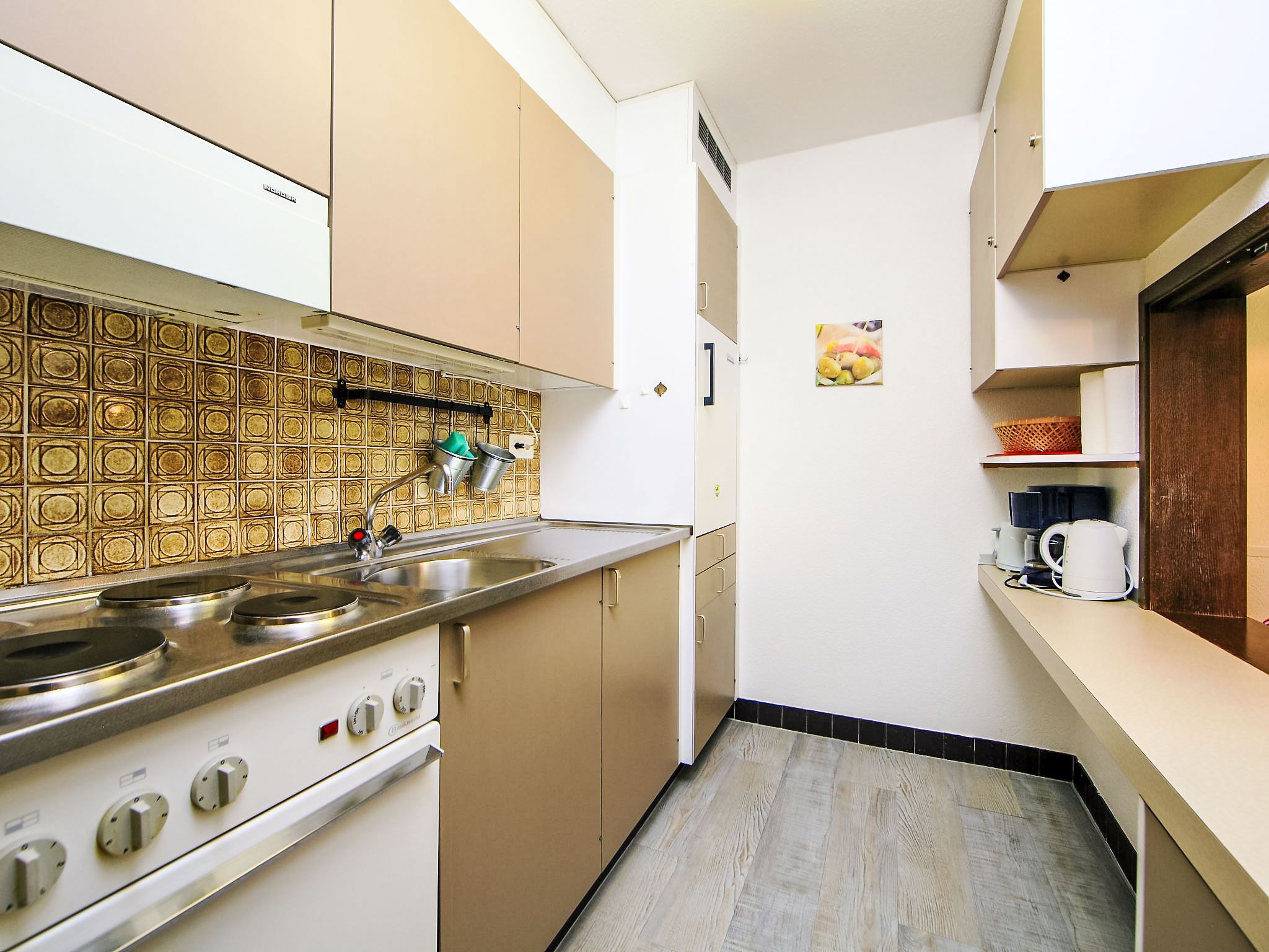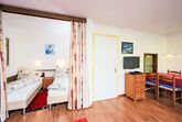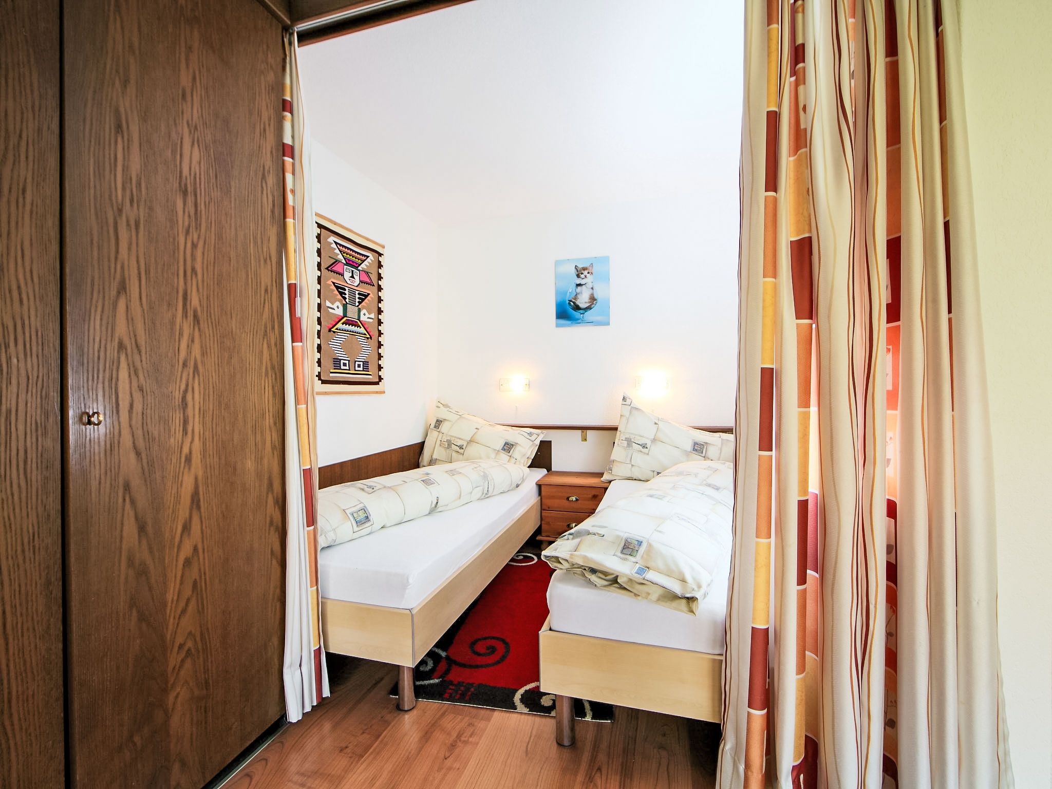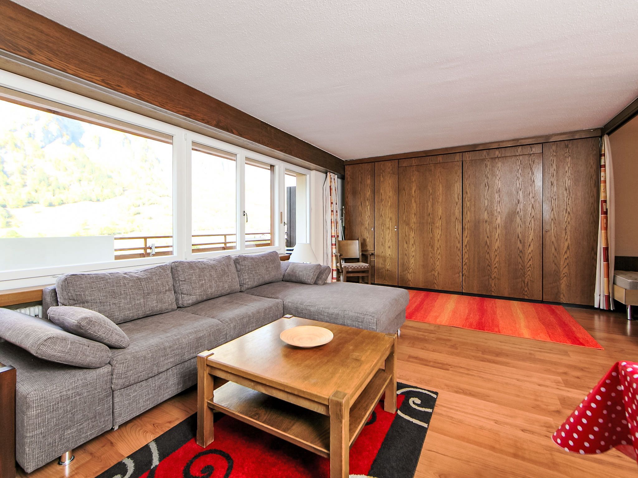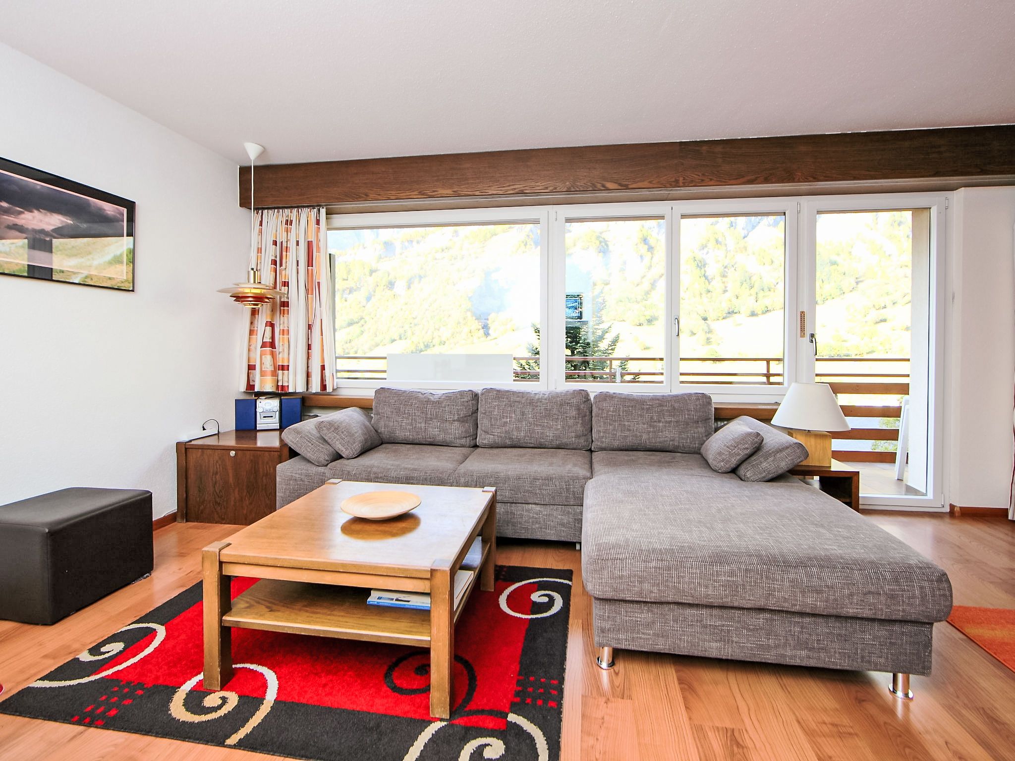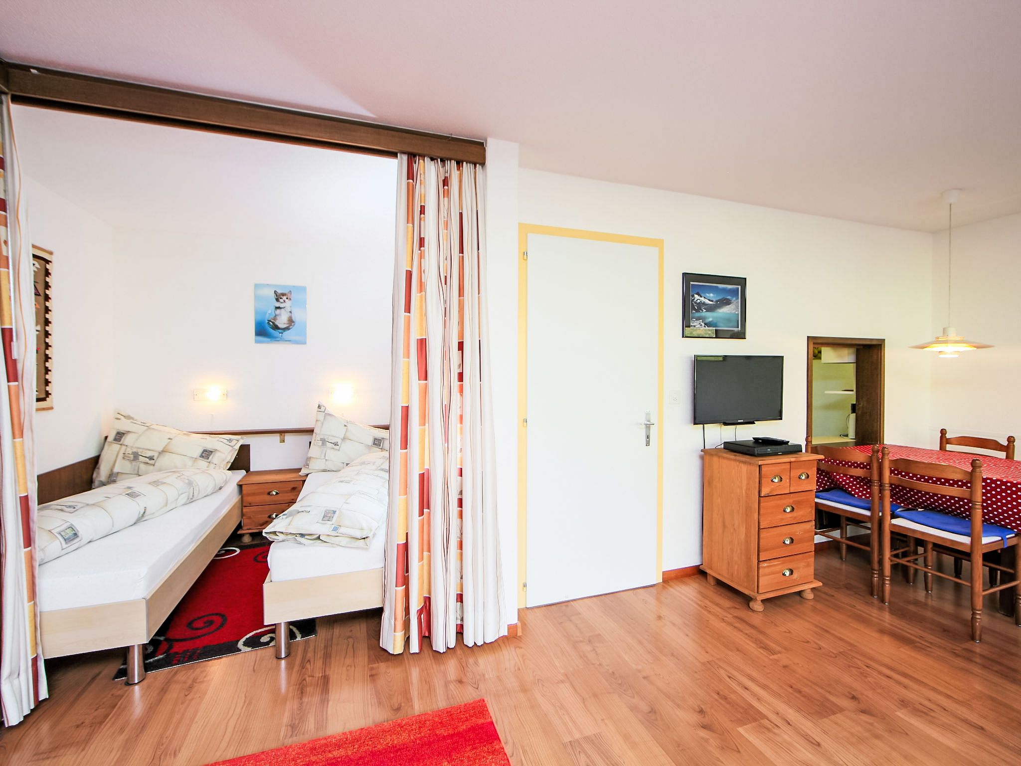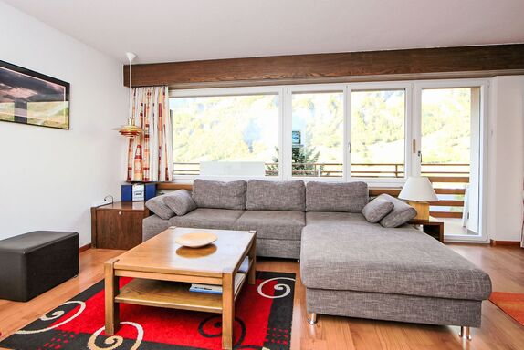 1-Zimmer-Wohnung 50 m2 im 3. Stock. Zweckmässig eingerichtet: Wohn-/Esszimmer mit 2 Wandschrankbetten und Kabel-TV (Flachbildschirm), Stereoanlage. Schlafnische mit Vorhang mit 2 Betten. Küche (3 Kochplatten, Backofen, elektrische Kaffeemaschine, Kapseln für die Kaffeemaschine (Nespresso) extra). Bad/WC. Balkon. Terrassenmöbel. Sicht auf die Berge und das Tal. Zur Verfügung: Internet (Wireless LAN, gratis). Bitte beachten: Nichtraucher-Unterkunft.