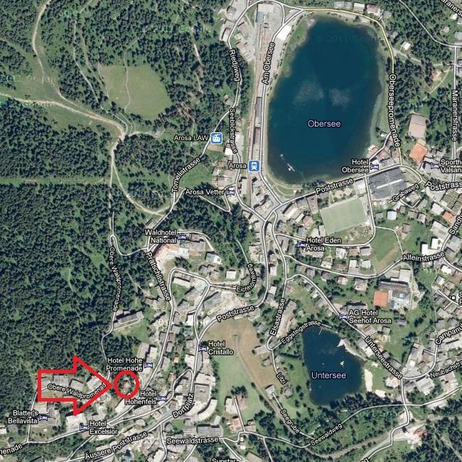 Das Chalet befindet sich trotz zentraler Lage an einem ruhigen Ort, am Waldrand. Sowohl Einkaufsmöglichkeiten als auch Skipiste und öffentliche Verkehrsmittel befinden sich in Gehdistanz.Im Sommer steht ein ungedeckter Aussenparkplatz direkt vor dem Haus zur Verfügung. Im Winter hingegen ist die Zufahrt zum Haus nicht möglich und das Auto muss in einem öffentlichen, gebührenpflichtigen Parkhaus abgestellt werden.