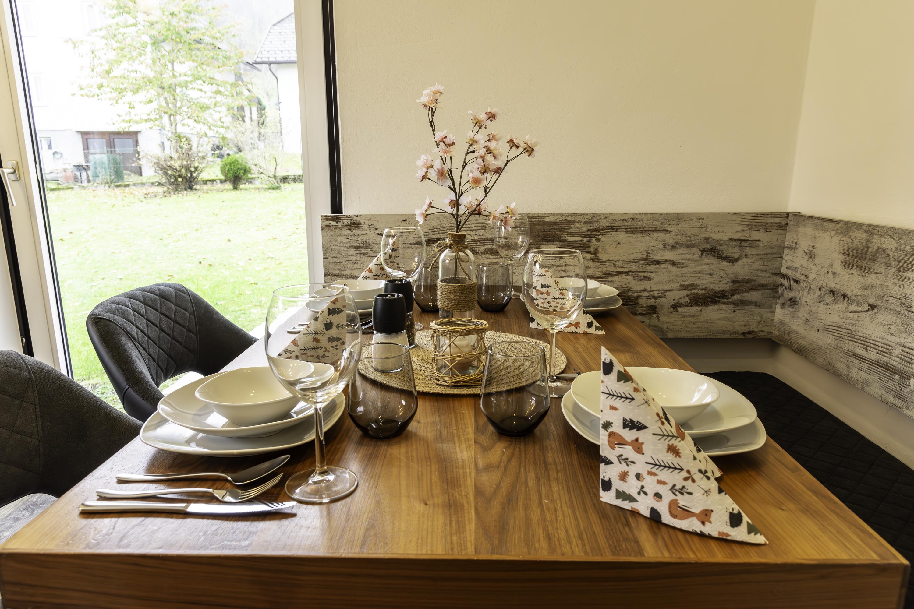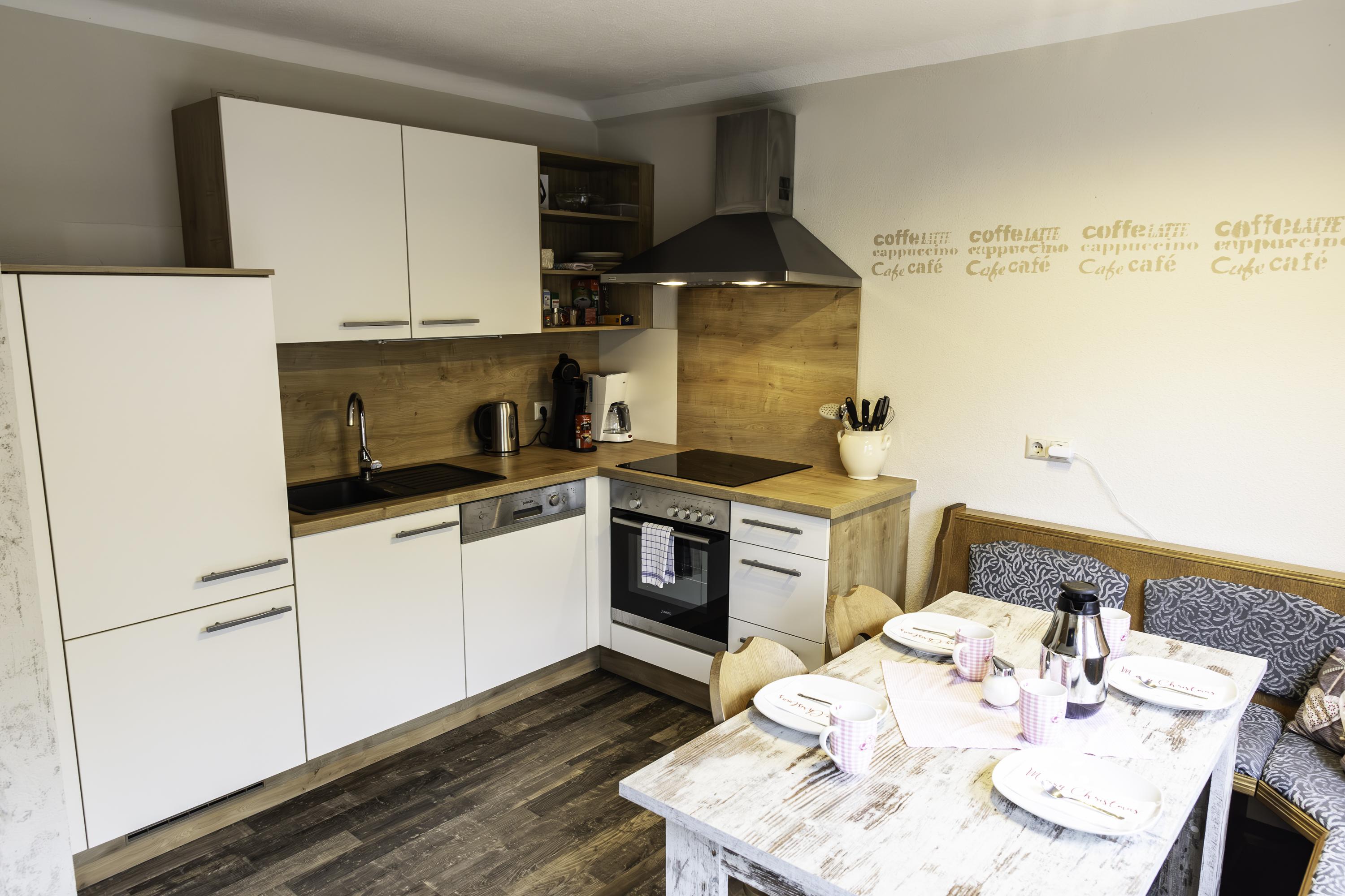 Unsere 90 m² großes Apartment 1 im Obergeschoss bietet Platz für bis zu 6 Personen. Es verfügt über 3 getrennte Schlafzimmer (jeweils mit Flat-TV) und eine voll ausgestattete Küche mit gemütlicher Essecke. Zwei der Schlafzimmer befinden sich auf einer Ebene, das dritte Schlafzimmer erreicht man über eine Treppe. Die Wohnung verfügt außerdem über ein Badezimmer mit großer Dusche und Blick auf das Dachstein-Massiv. Das WC ist separat. Der kleine Balkon mit Sitzgelegenheit, erreichbar über die Küche, bietet einen Blick in unseren schönen Garten.