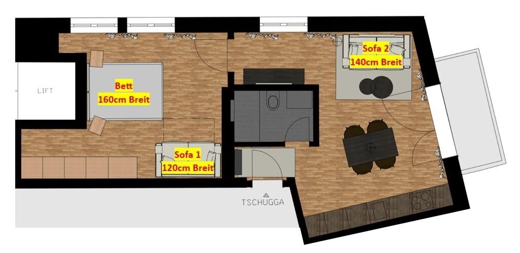 • 1 Schlafzimmer (1x Doppelbett 160 x 200cm und 1x Schlafcouch 120cm)