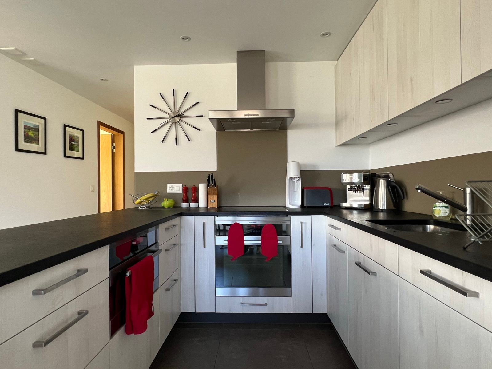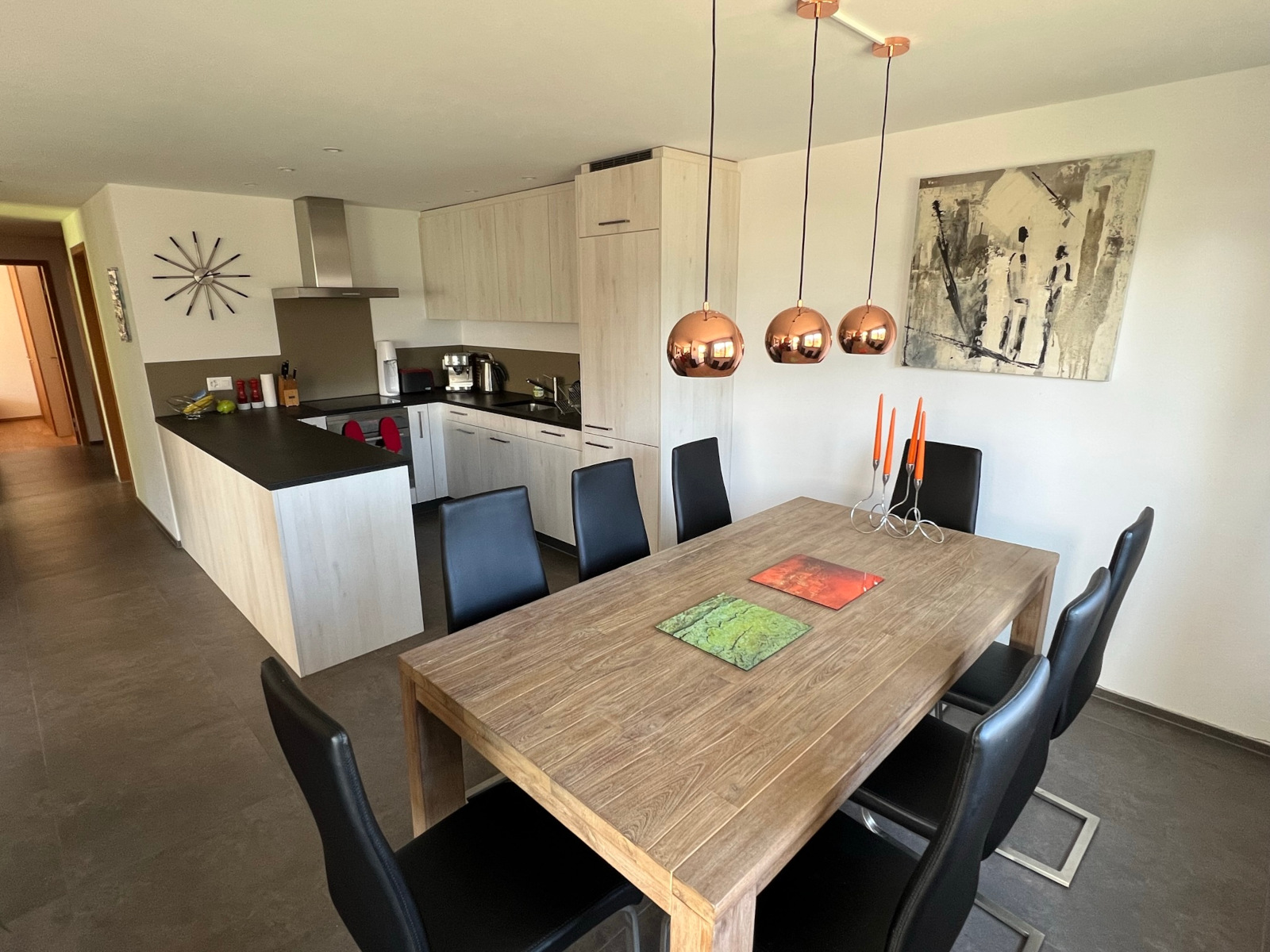 Die Küche ist sehr gut ausgestattet mit Backofen, Mikrowelle, Induktionskochfeld, Geschirrspüler, Kühlschrank, Gefrierschrank, Kaffeemaschine, Toaster, Getränkeautomat, Wasserkocher usw. sowie Töpfen, Pfannen, Geschirr und Besteck. Fondue- und Raclette-Ausrüstung ist ebenfalls vorhanden. Der Essbereich verfügt über einen großen ausziehbaren Tisch, an dem bequem 8 Personen Platz finden.