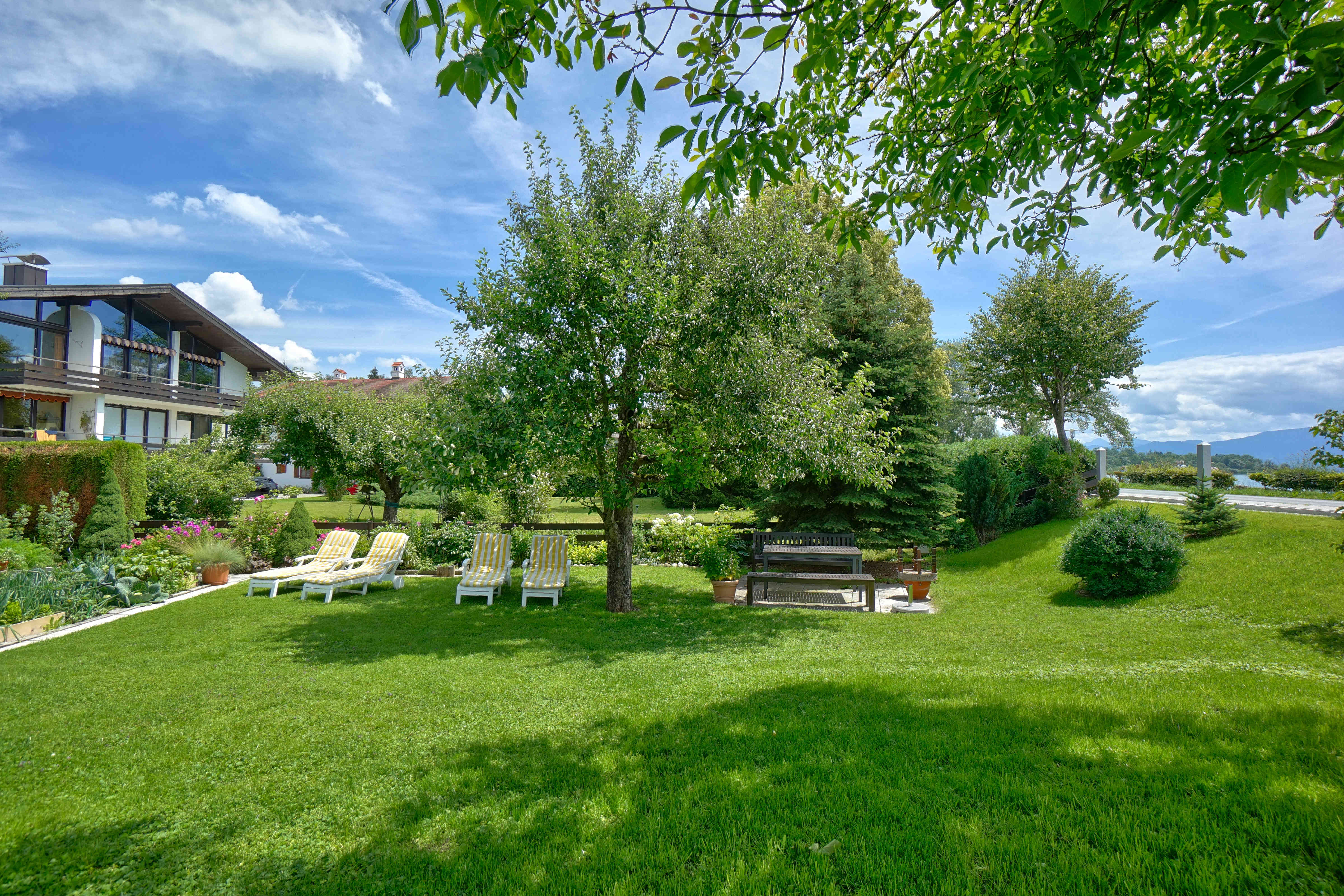 Unser Haus liegt direkt am Chiemsee und wir haben einen herrlichen Blick auf die bayerischen Alpen.