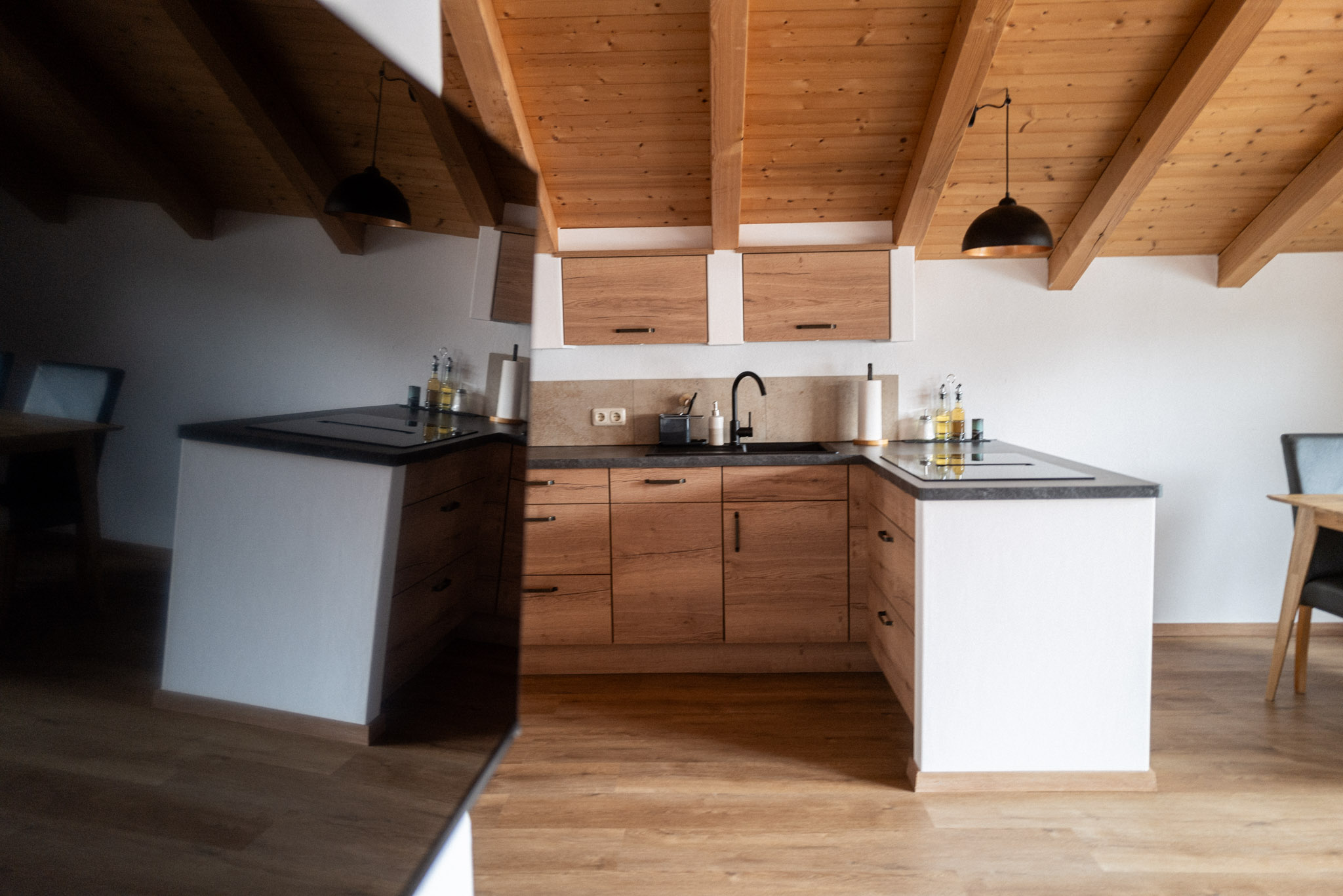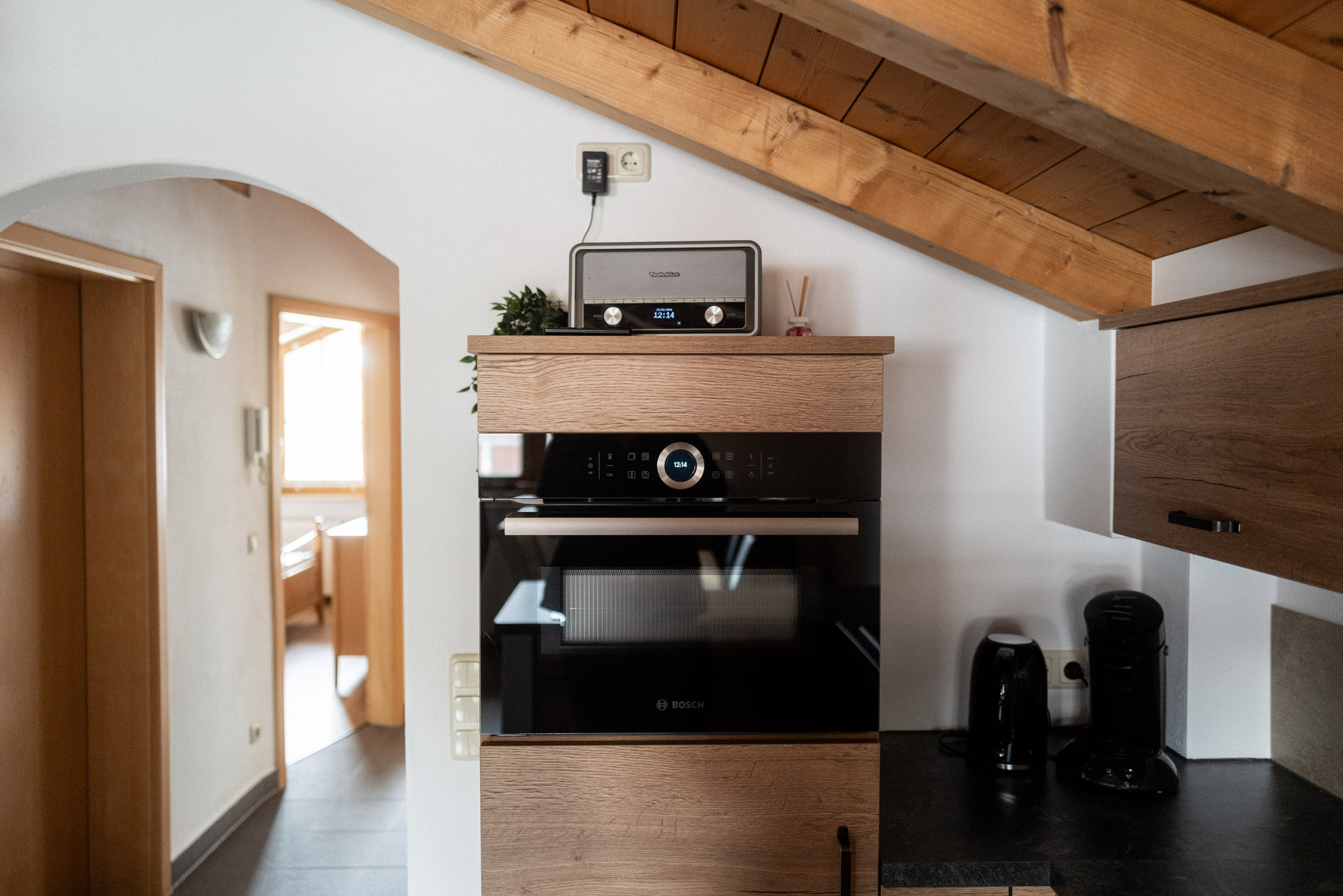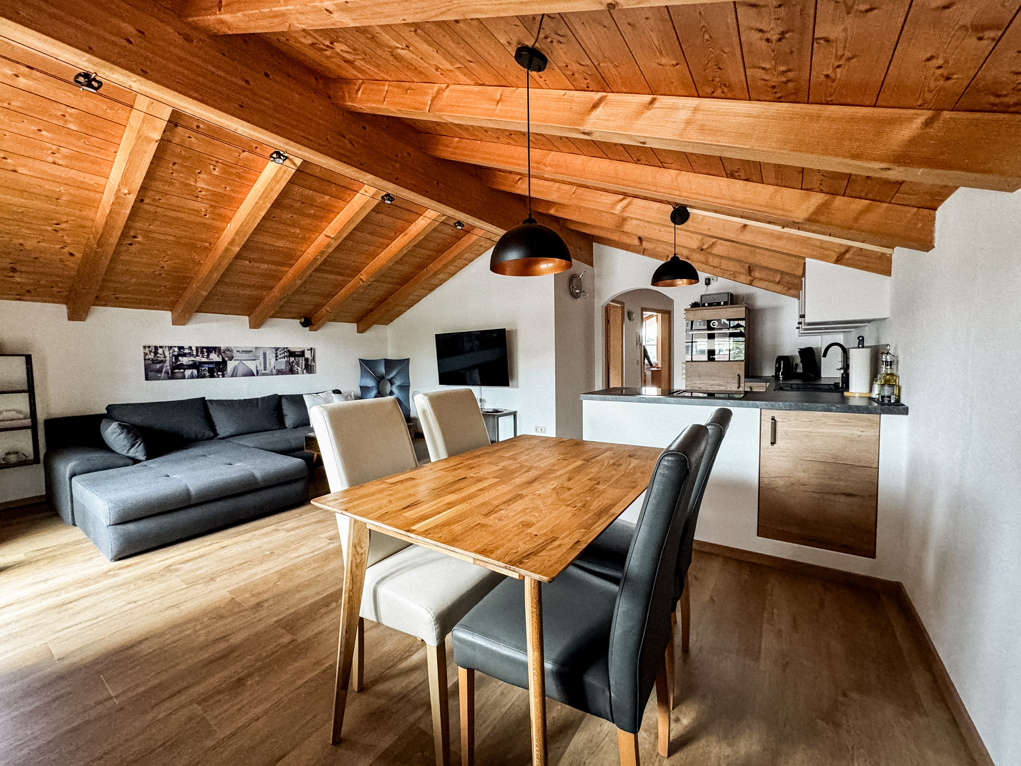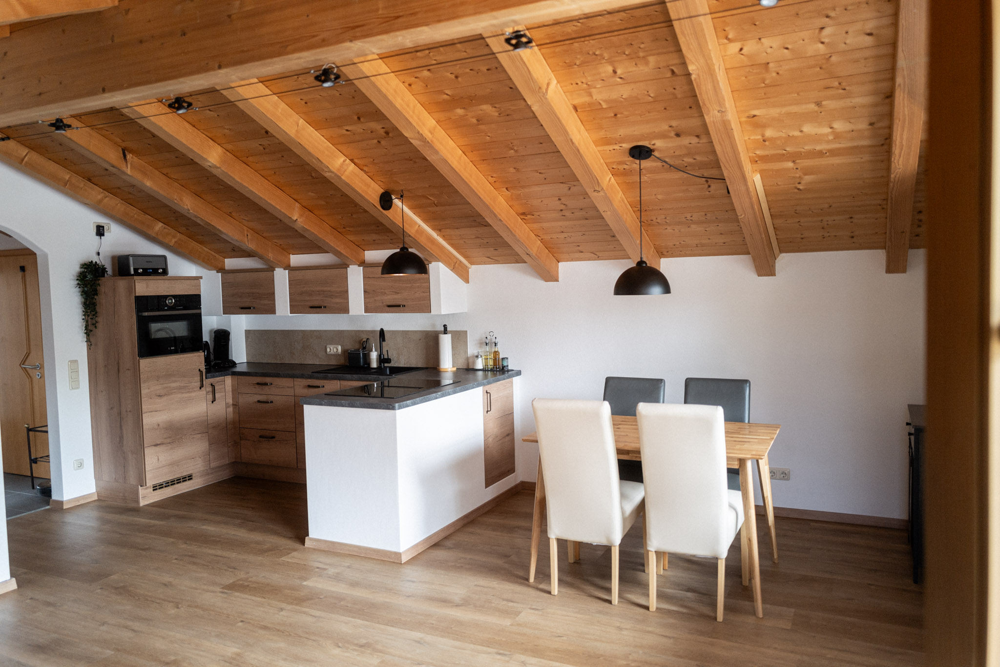 Die neue, voll ausgestattete Küche lädt dazu ein, gemütliche Mahlzeiten in der Wohnung zu genießen. Das Schlafzimmer verfügt über ein komfortables Doppelbett sowie eine zusätzliche Schlafcouch, ideal für Familien oder Paare. Genießen Sie hier die entspannte Atmosphäre und fühlen Sie sich wie zuhause – in der Ferienwohnung Achentaler Alpentor wird es Ihnen an nichts fehlen!