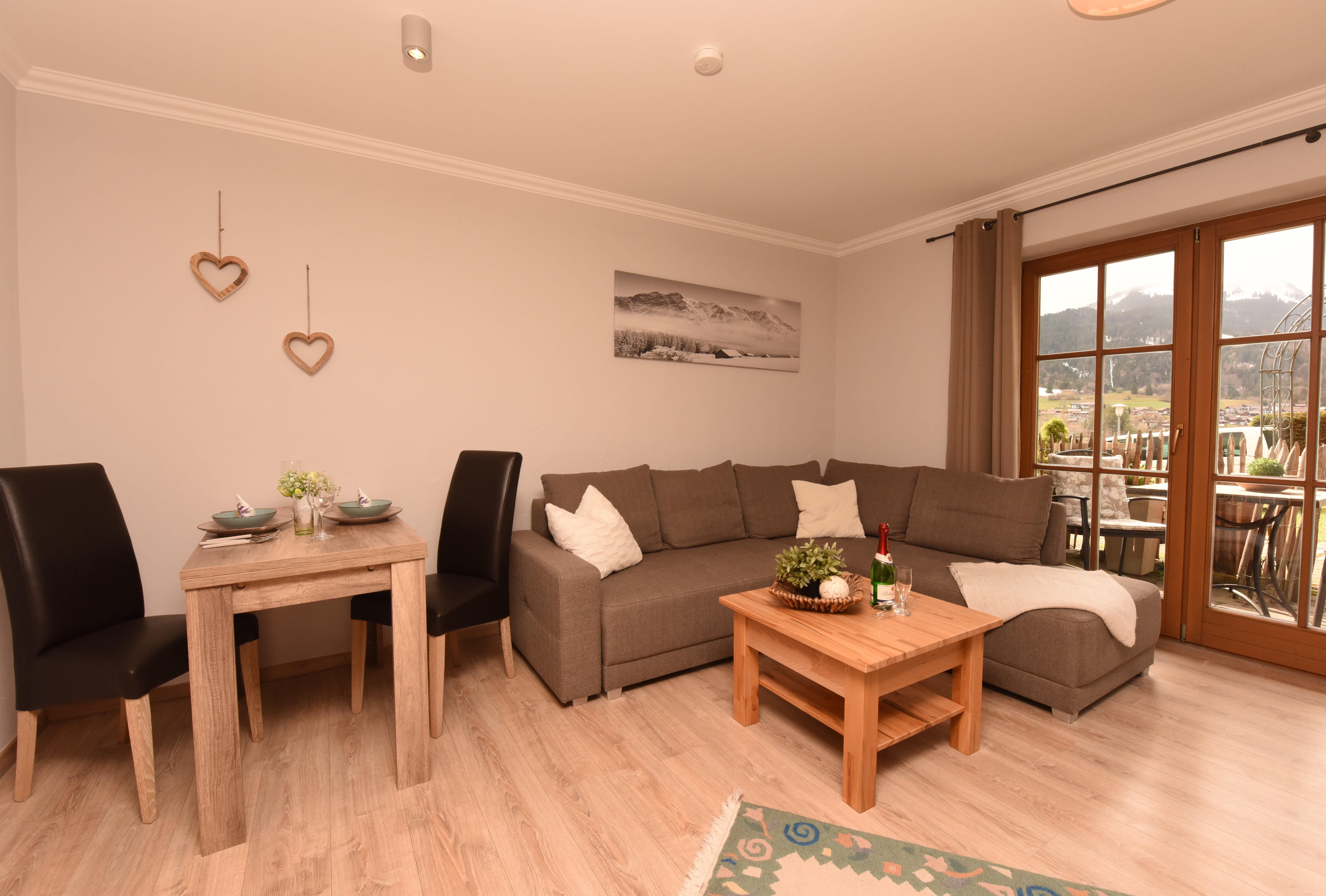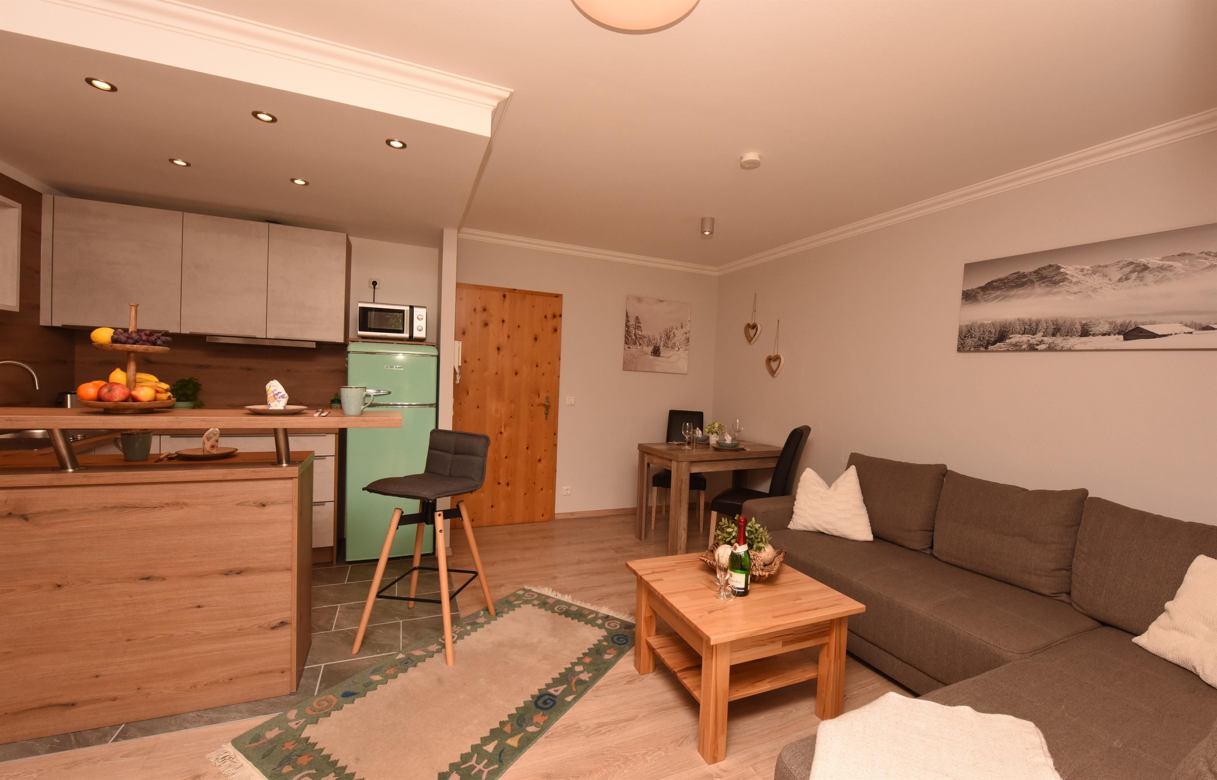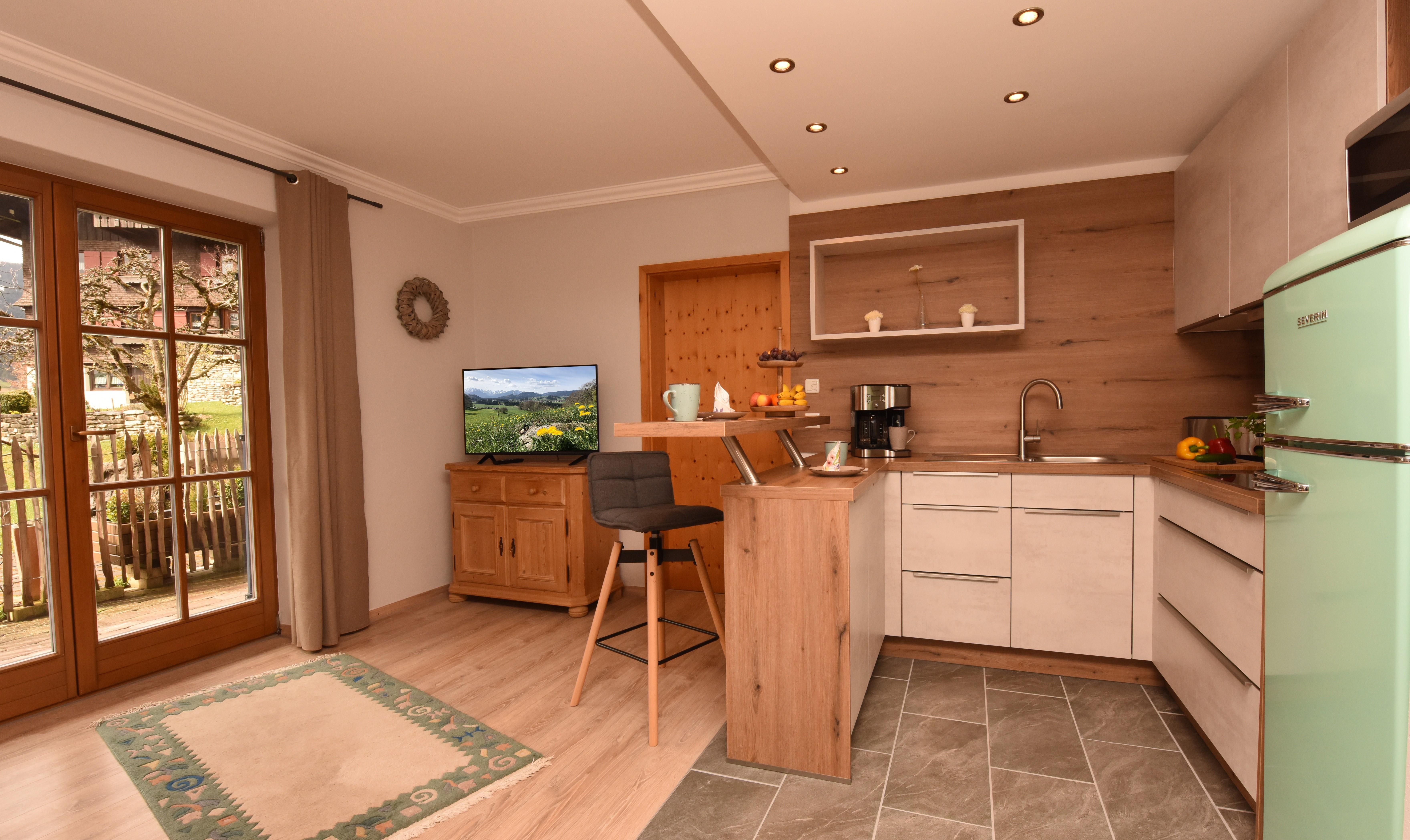 Schöne, helle, gemütliche Wohnung mit Laminatfußboden, offener Küche, Kühlschrank mit Gefrierfach,sonniger Terrasse und herrlichem Ausblick auf die Allgäuer Berge.