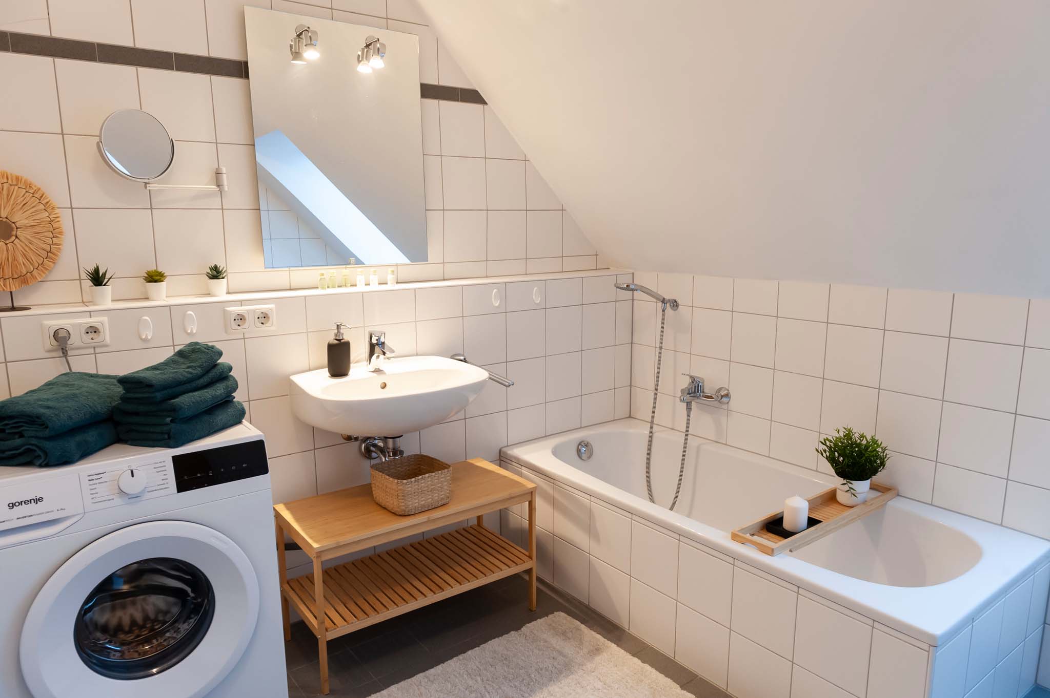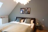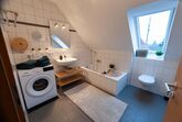 Zwei Schlafzimmer und ein Badezimmer mit Wanne und Waschmaschine befinden sich auf der 2. Etage. Ein Schlafzimmer ist mit einem Vollholzbett 180×200 und Smart-TV ausgestattet. Das zweite Schlafzimmer ebenfalls mit einem Vollholzbett 160×200 sowie einer Schlafcouch (für eine Person).