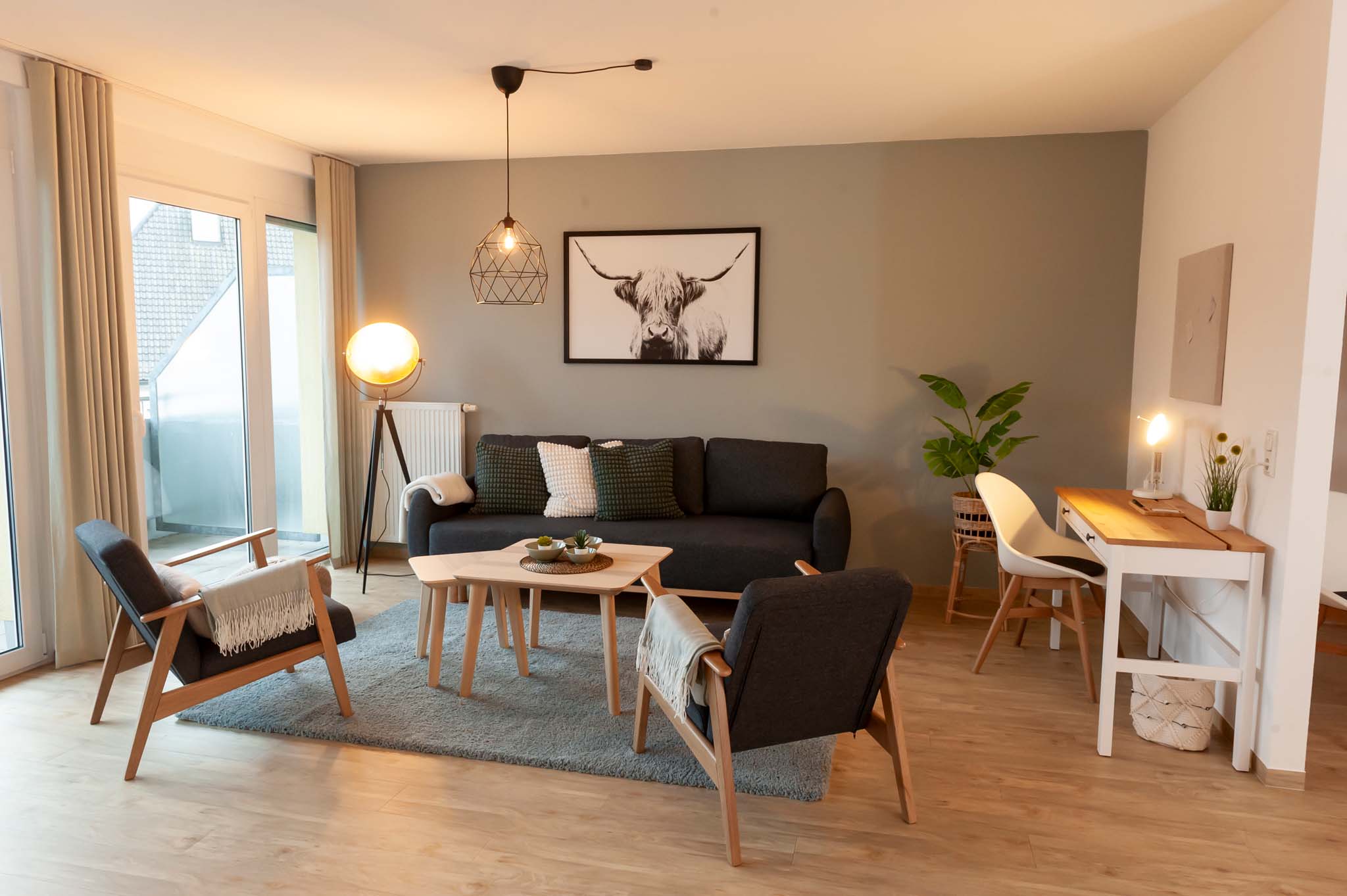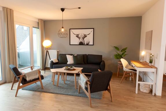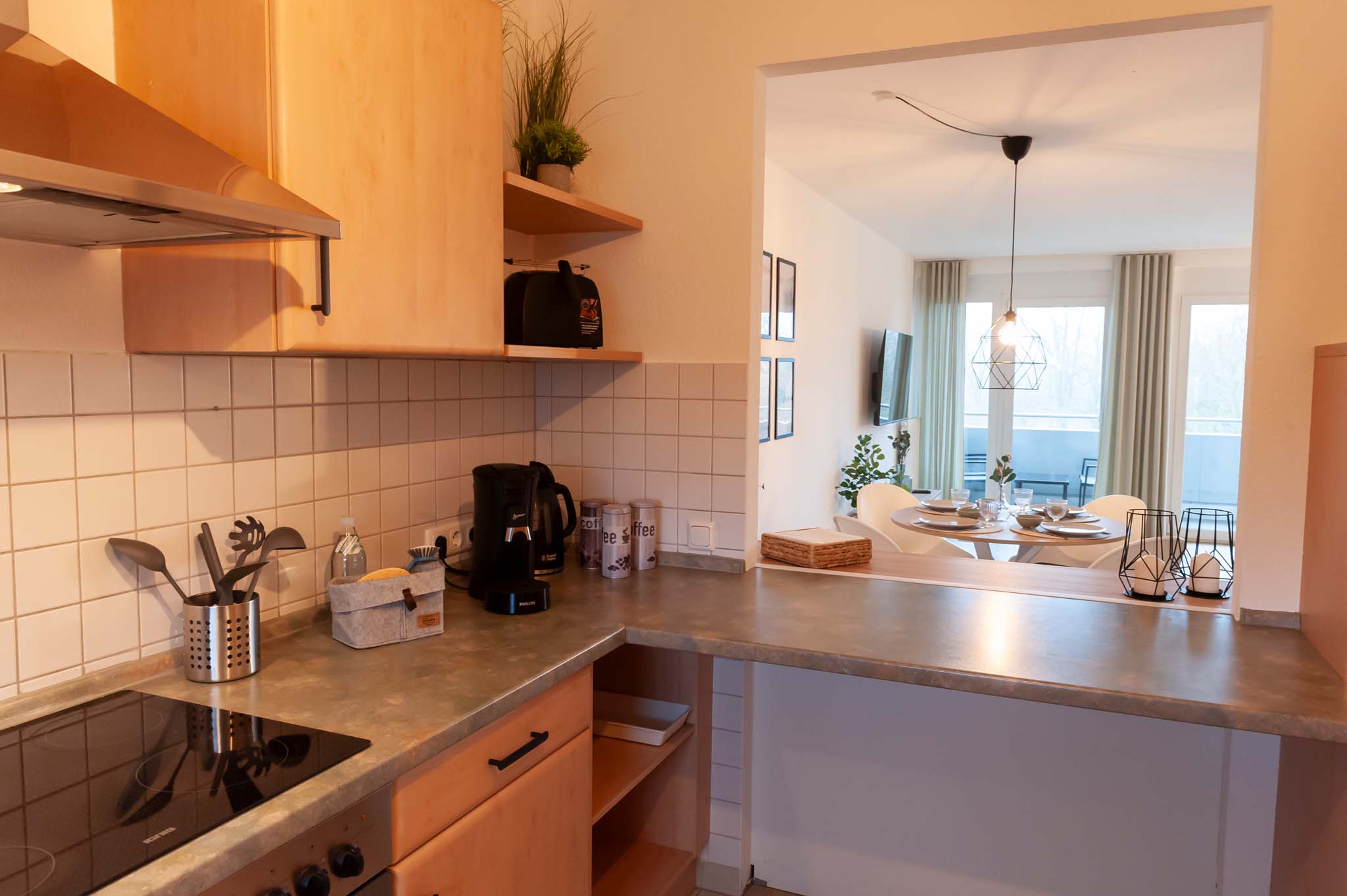 In unserem Apartment erwartet Sie eine gelungene Kombination aus hochwertigen Möbeln und topmoderner Ausstattung, die Ihnen einen rundum gelungenen Aufenthalt verspricht. Unsere moderne, vollausgestattete Küche lässt keine Wünsche offen und bietet neben sämtlichen Kochutensilien auch Öl, Essig und Gewürze für Ihre kulinarischen Genüsse. Eine Senseo Kaffeemaschine mit Pads steht ebenfalls zur Verfügung.
