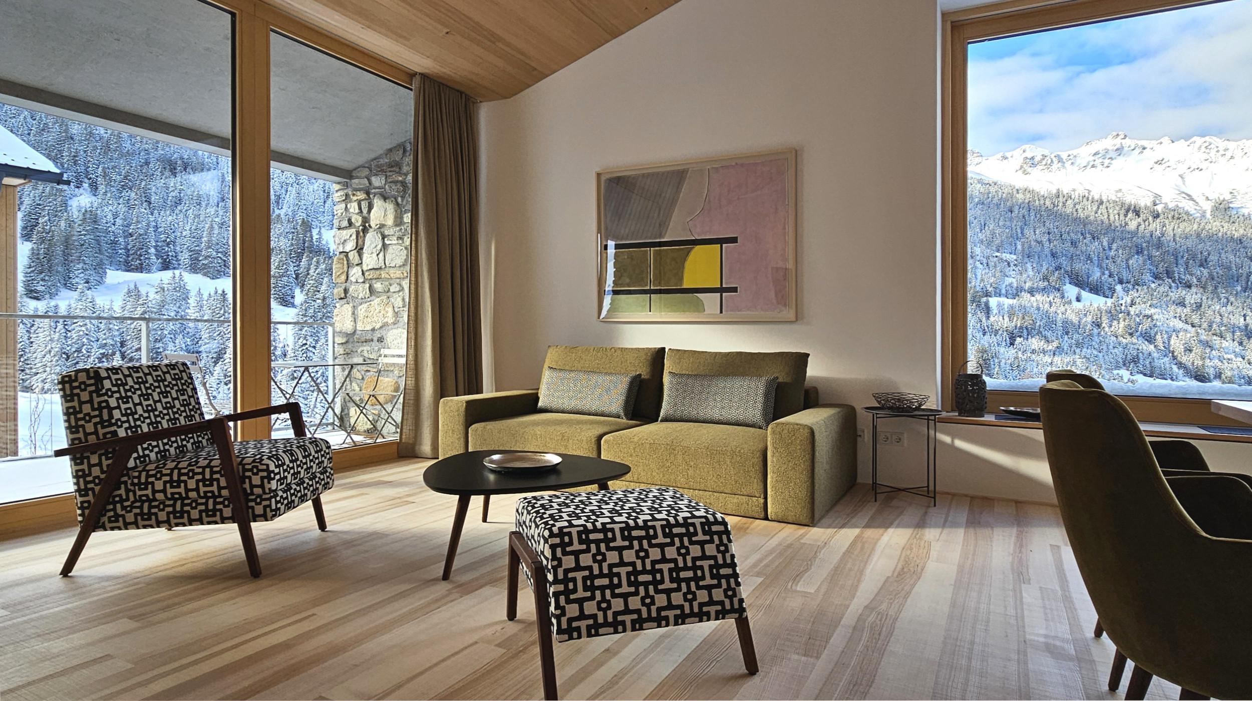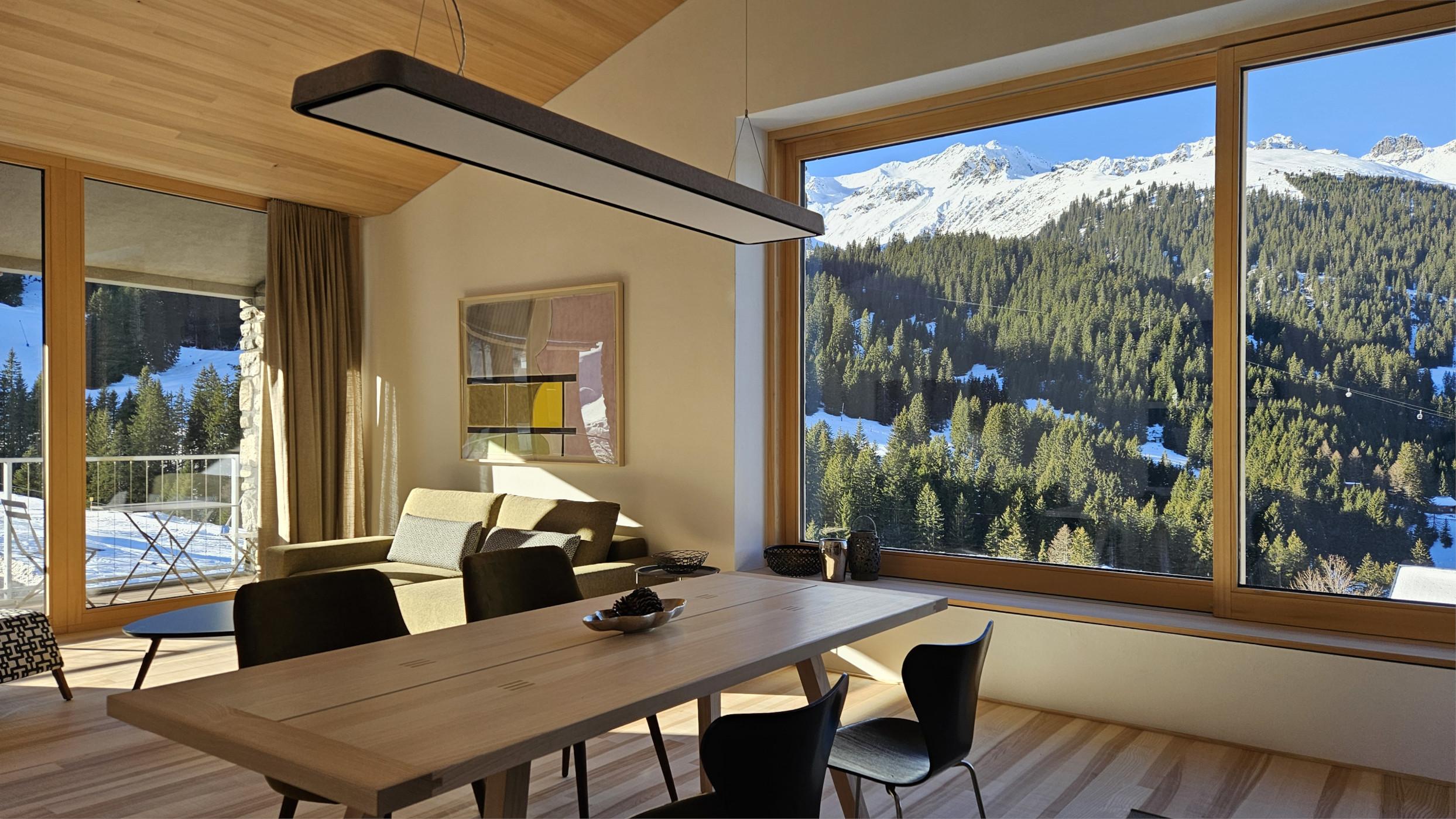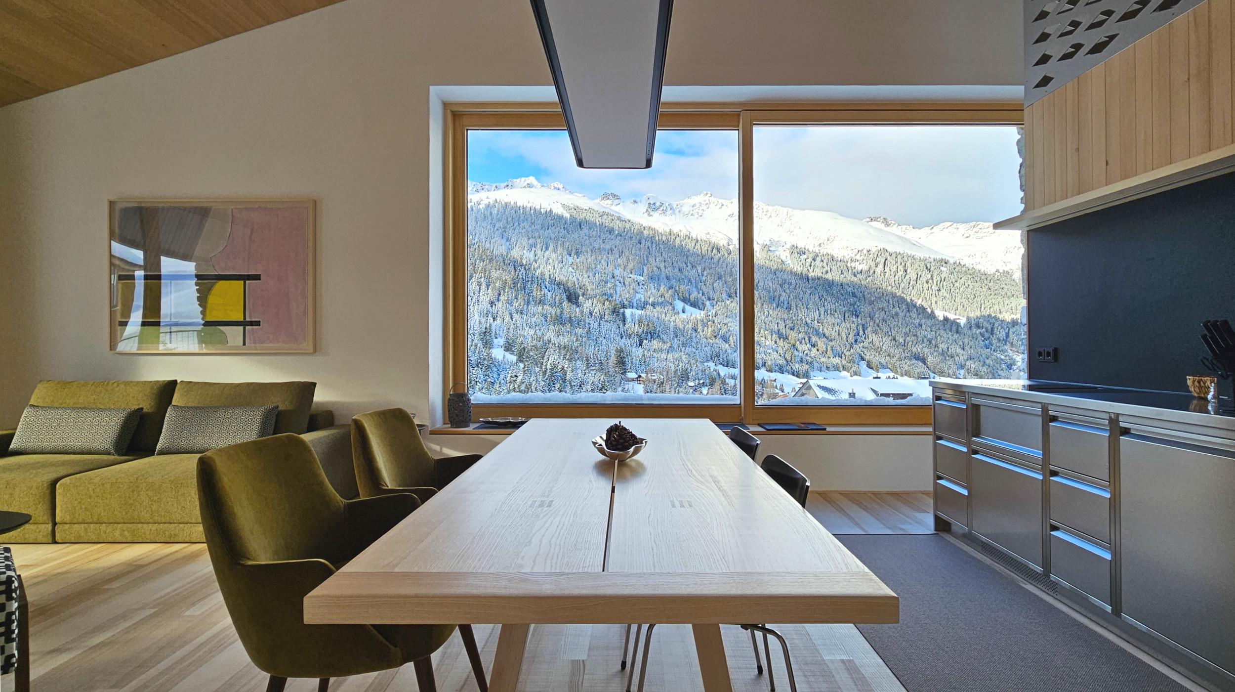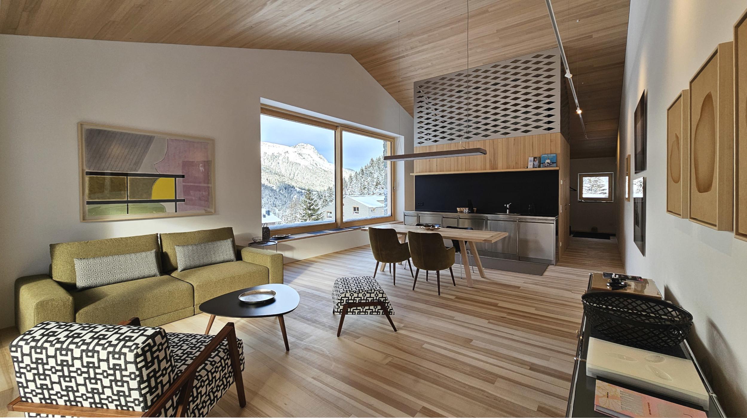 Das Apartment mit außergewöhnlichen räumlichen Qualitäten sowie qualitativ hochwertigen Materialien und Möbeln eignet sich für 2 Erwachsene. Für eine weitere Person ab 10 Jahren kann das Sofa im Wohnraum als Bett genutzt werden. Beinhaltet sind 1 Schlafzimmer, ein offener Wohnraum mit Küche, Badezimmer mit Dusche und WC sowie eine südseitige Loggia. Panoramablick in die Berge und das Skigebiet.