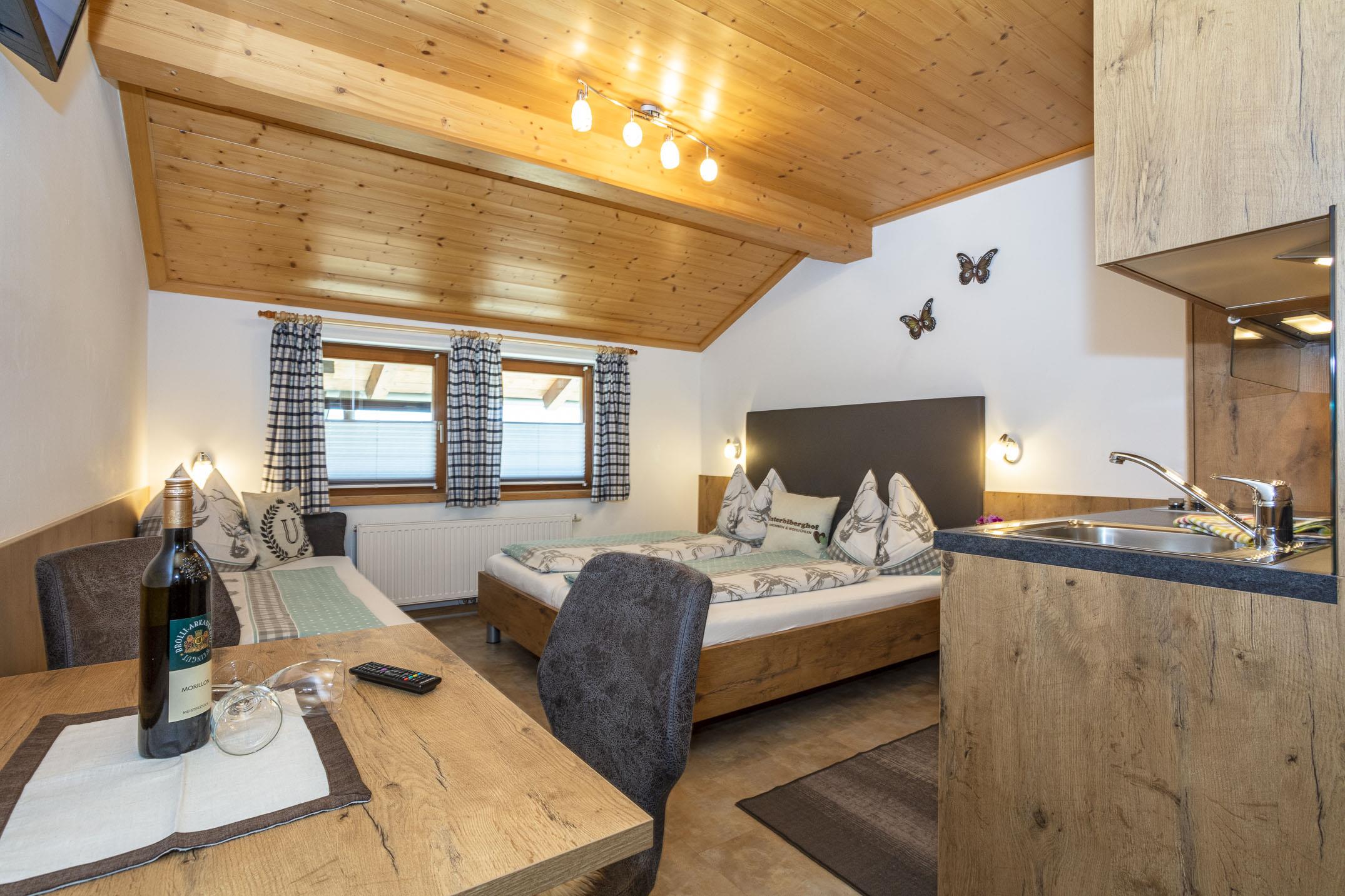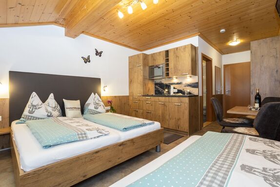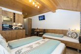 Das ideale Urlaubszuhause für Pärchen und kleine Familien Gemütlich, komfortabel und modern ist das Studio Arnika in der zweiten Etage ausgestattet. Das Zimmer ist möbliert mit einem Doppelbett, einem Einzelbett, einem Sitzbereich und einer gut ausgestatteten Küchenzeile. Zum Badezimmer gehören eine Dusche und ein WC.